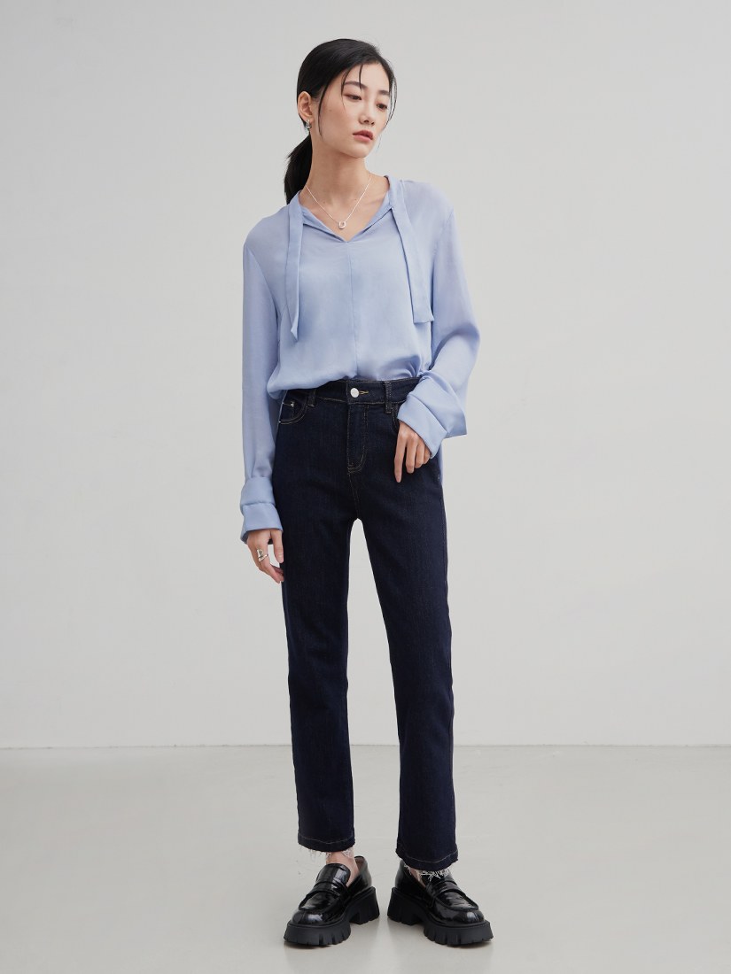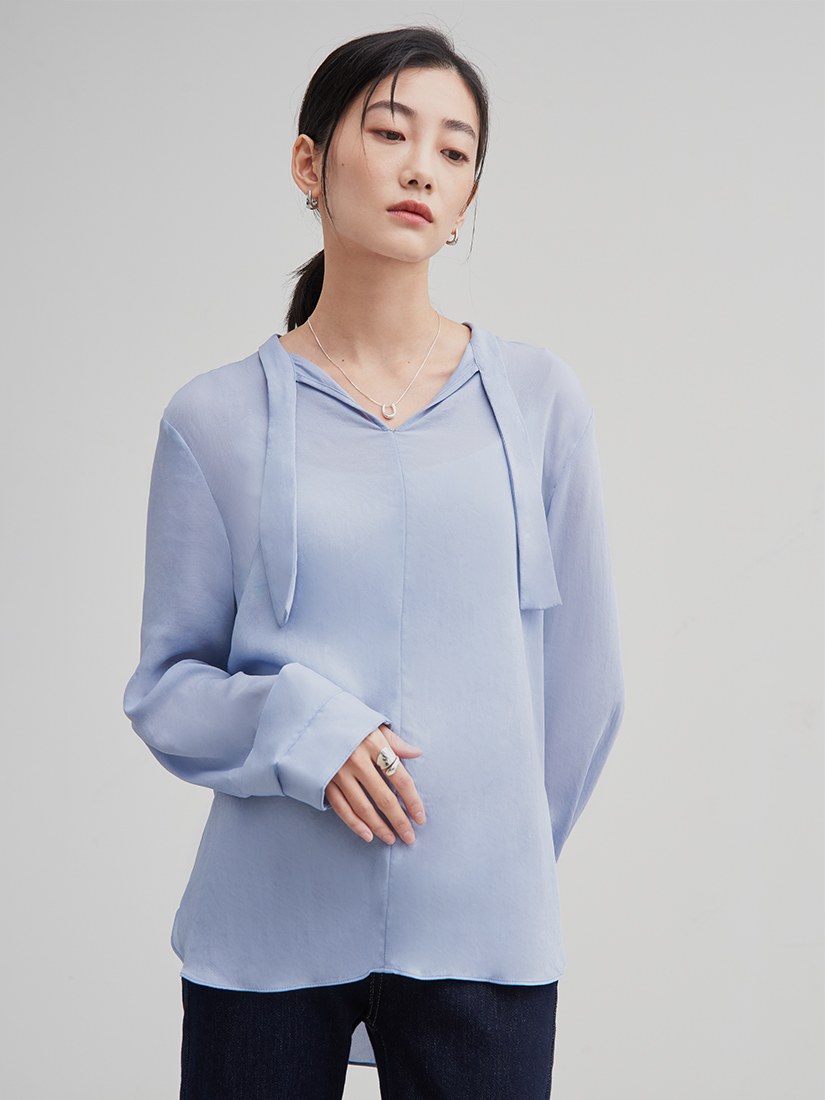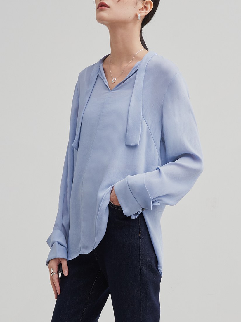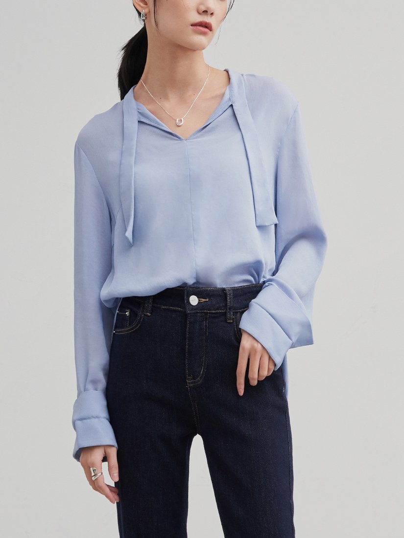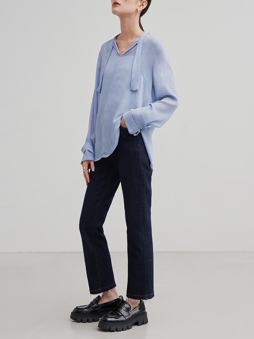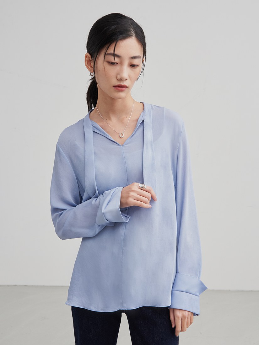 不對稱領彈力綁帶長袖襯衫$63 USD