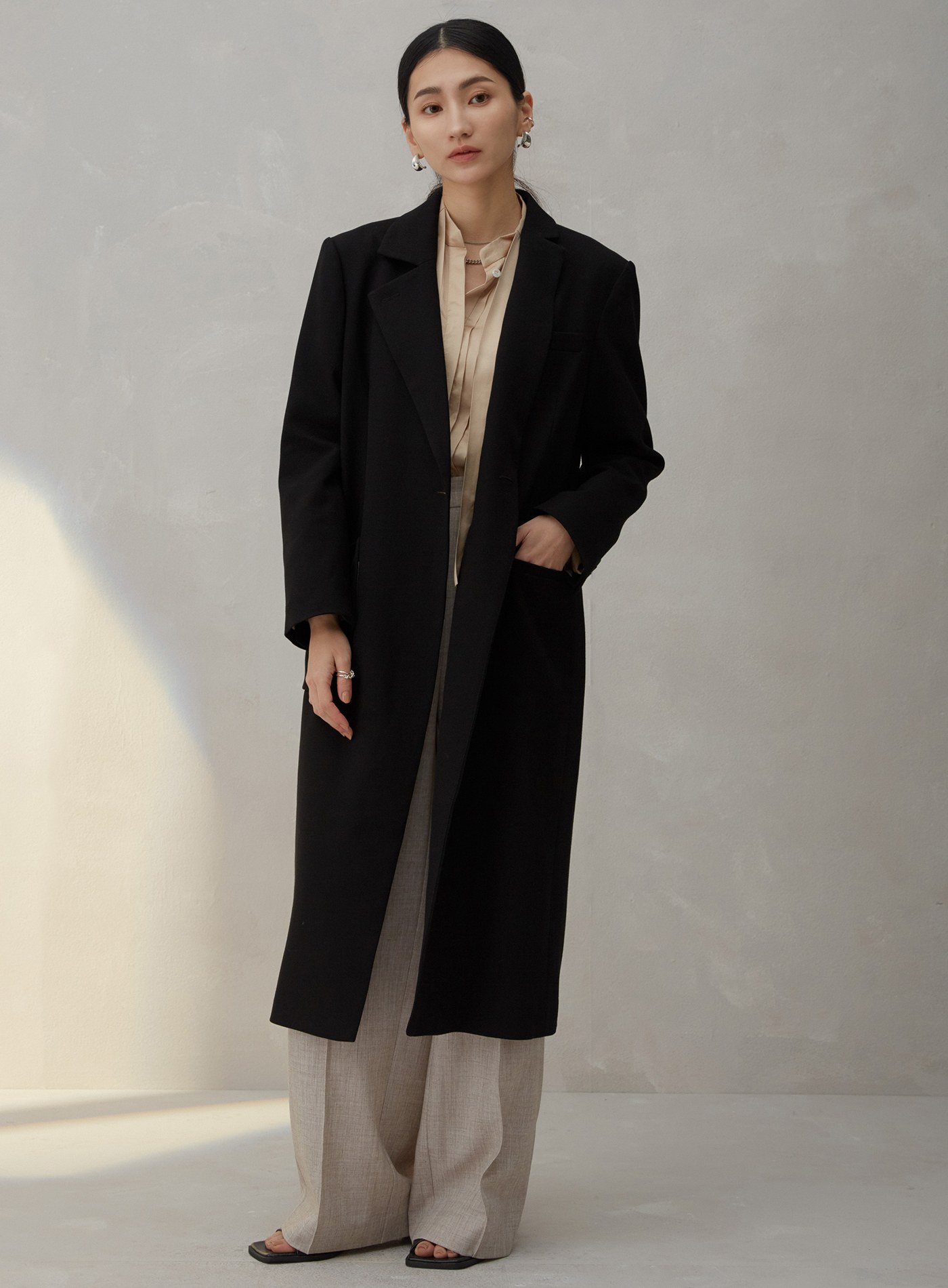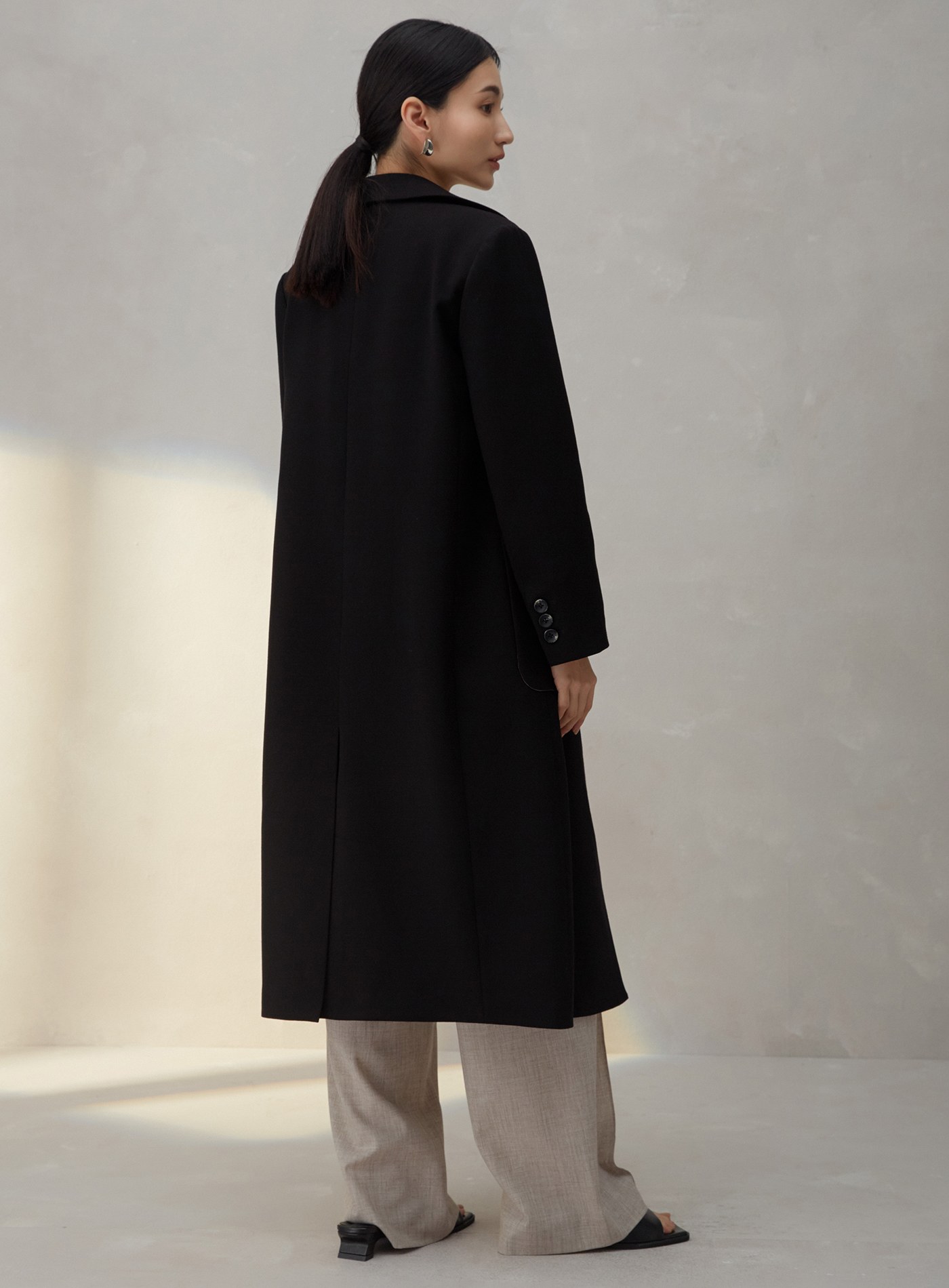 羊毛雙面呢圓領不對稱拼接大衣$191 USD