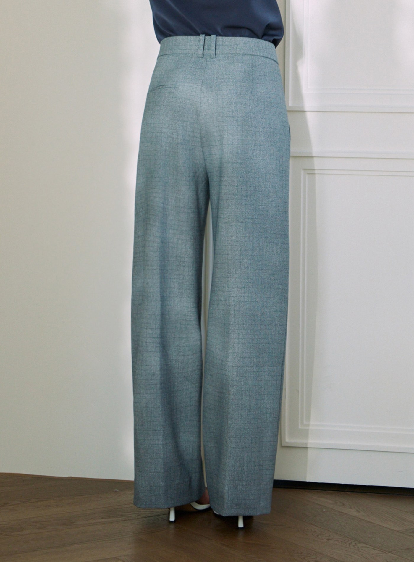 品牌金屬標挺廓後剪接寬褲$76 USD