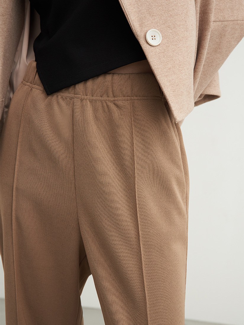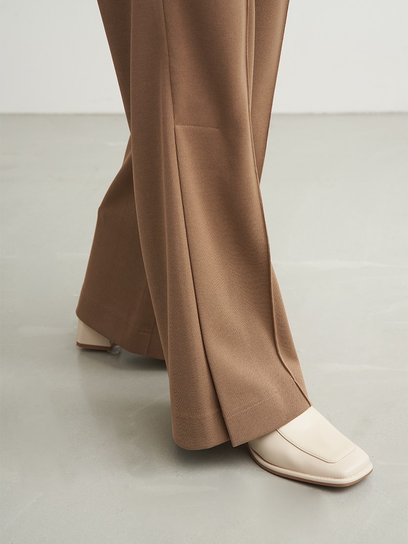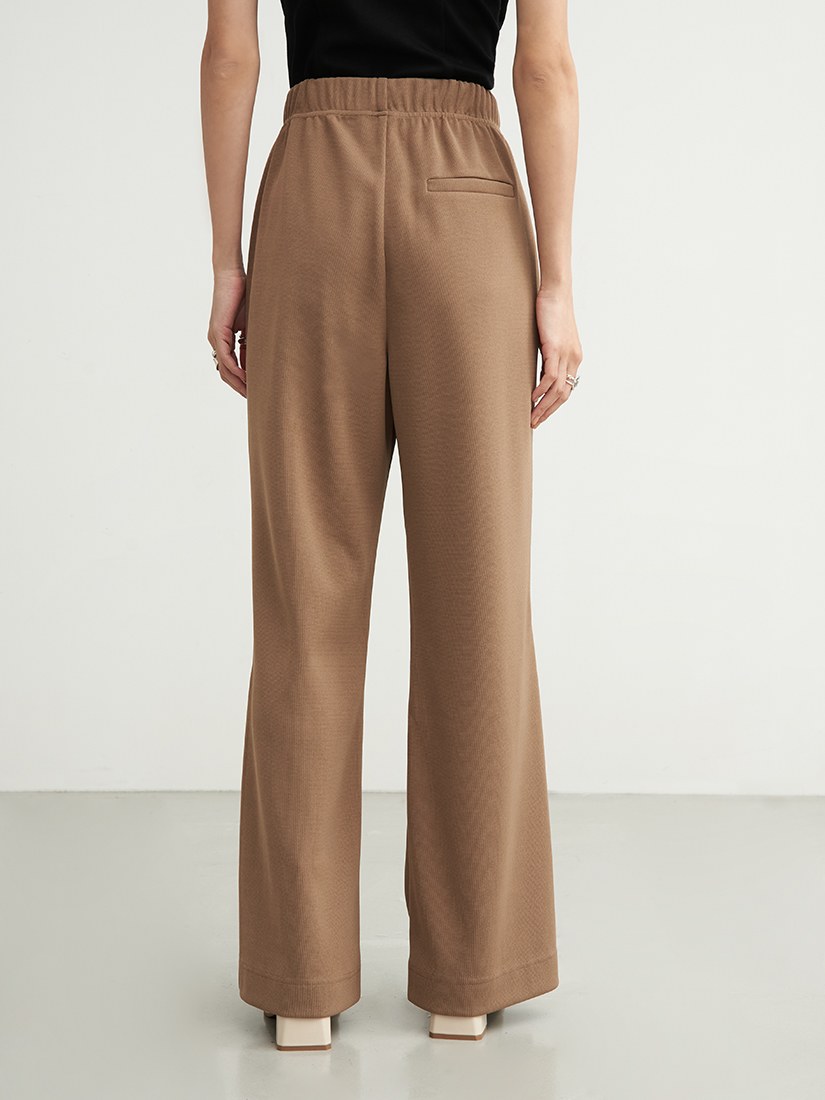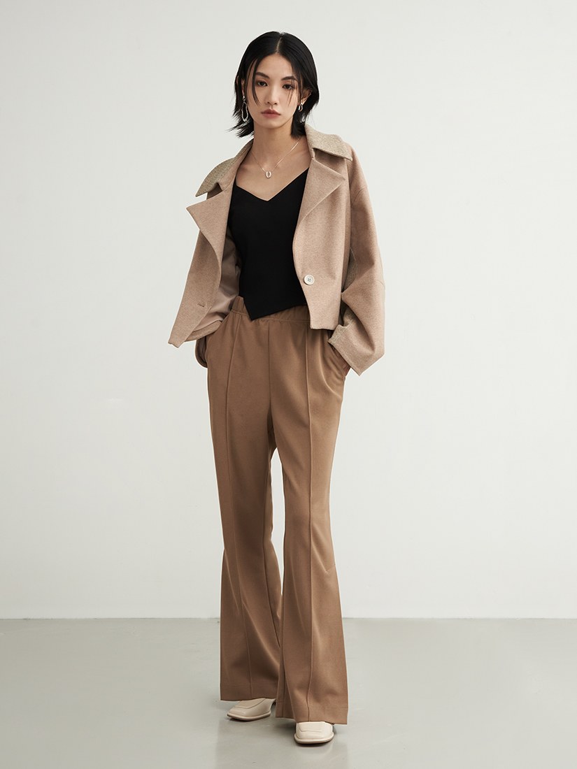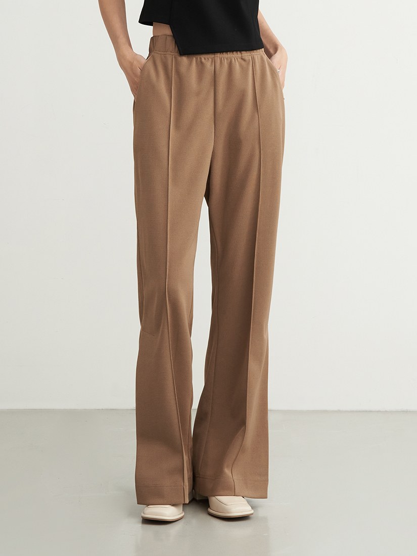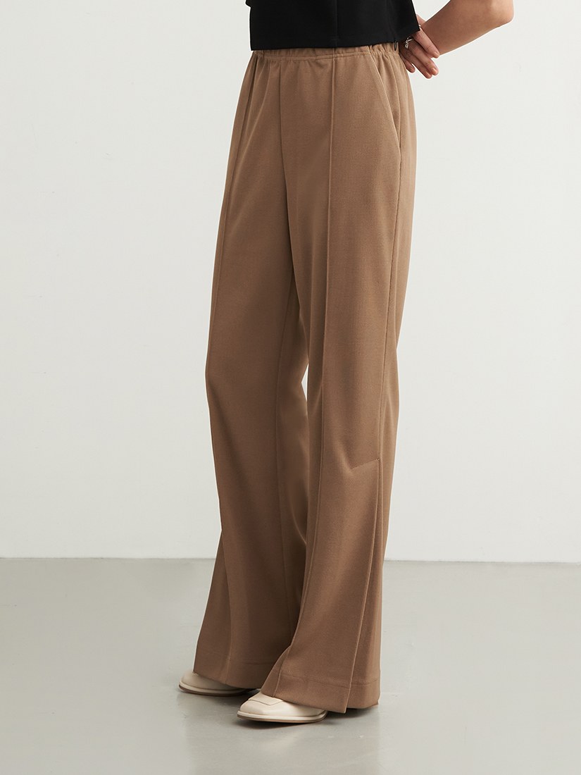 - 微喇褲剪裁/下擺側邊活摺設計/腰部整圈鬆緊設計