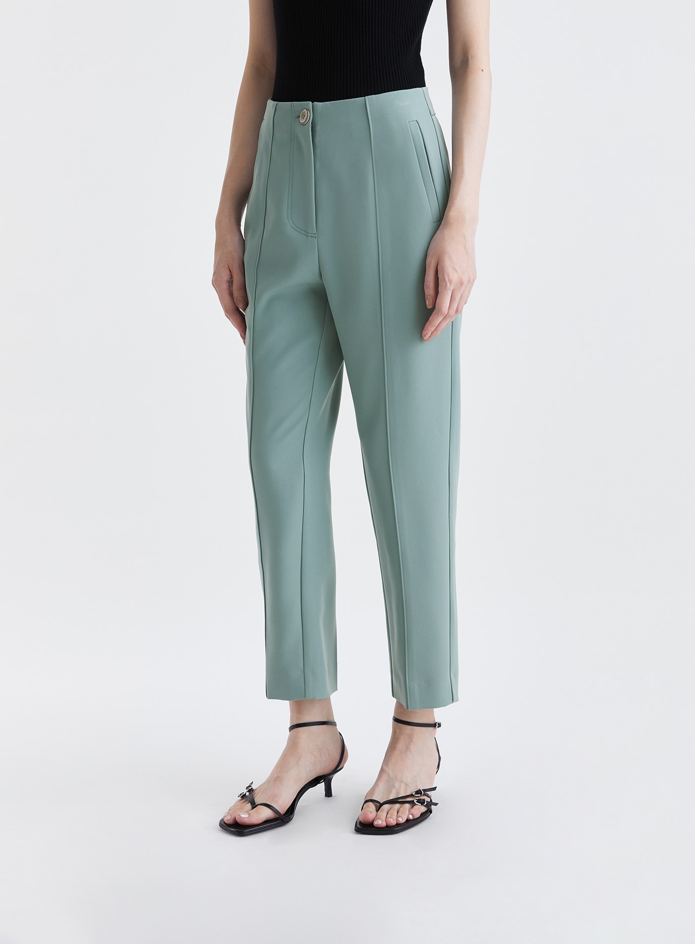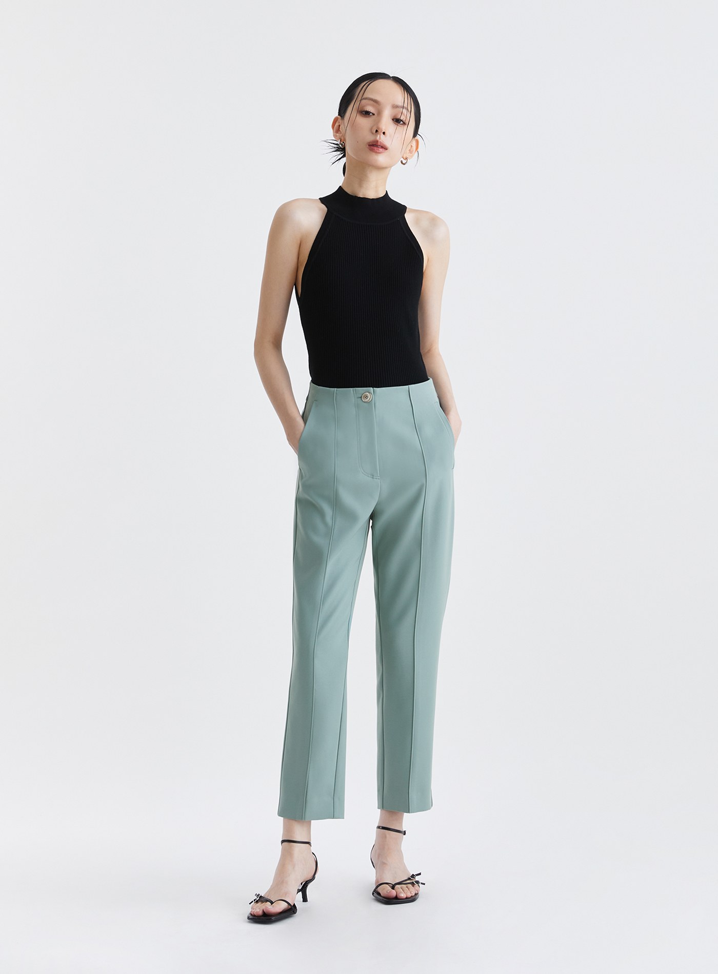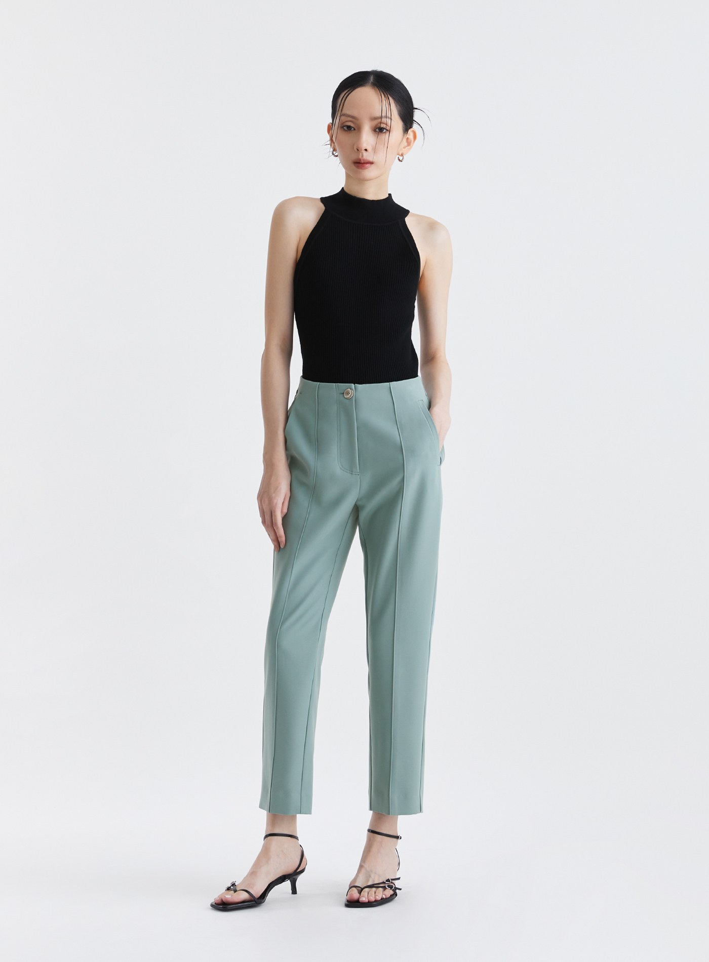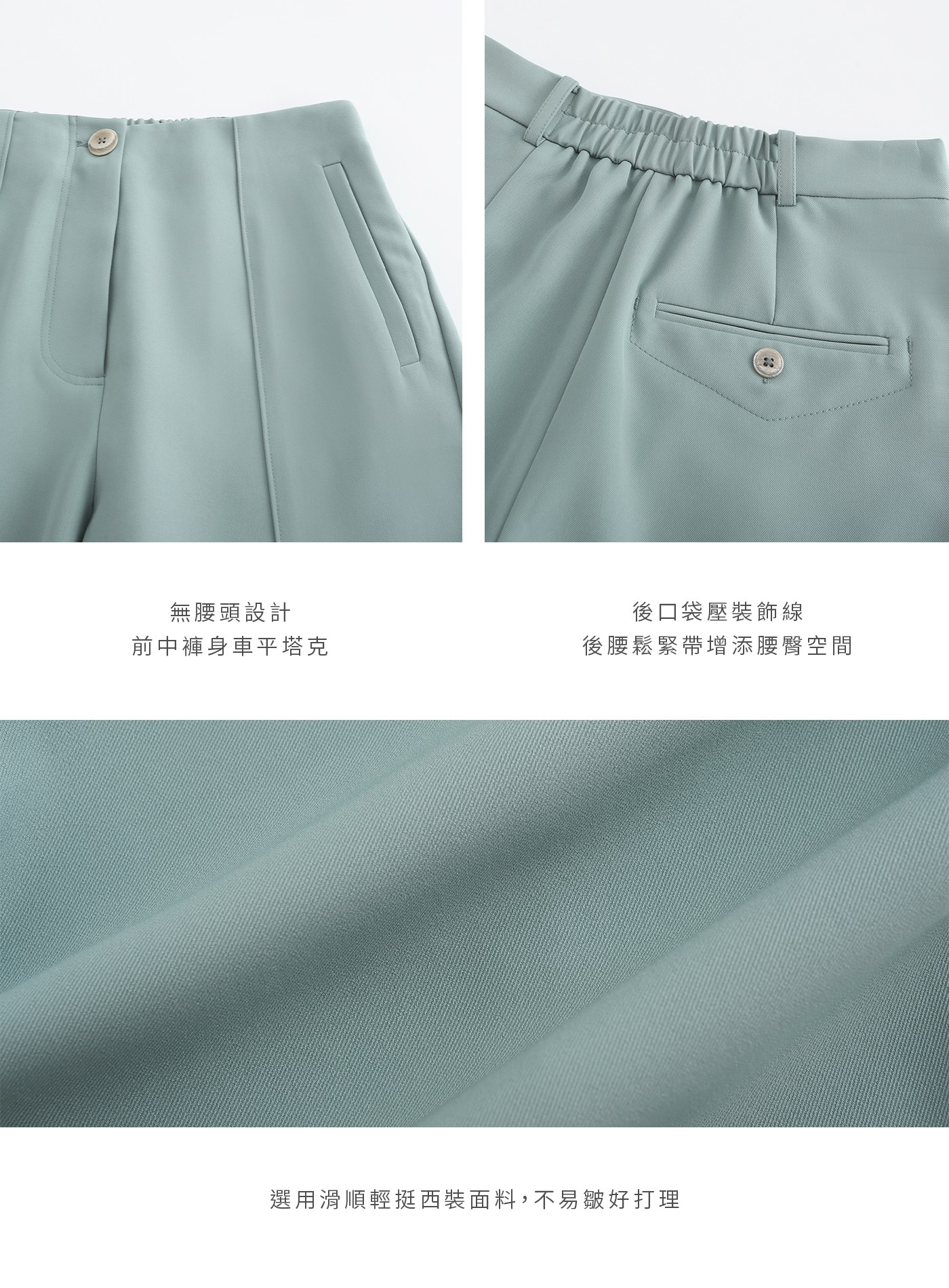 - 前門襟壓線,前中褲身車平塔克設計,修飾腿型