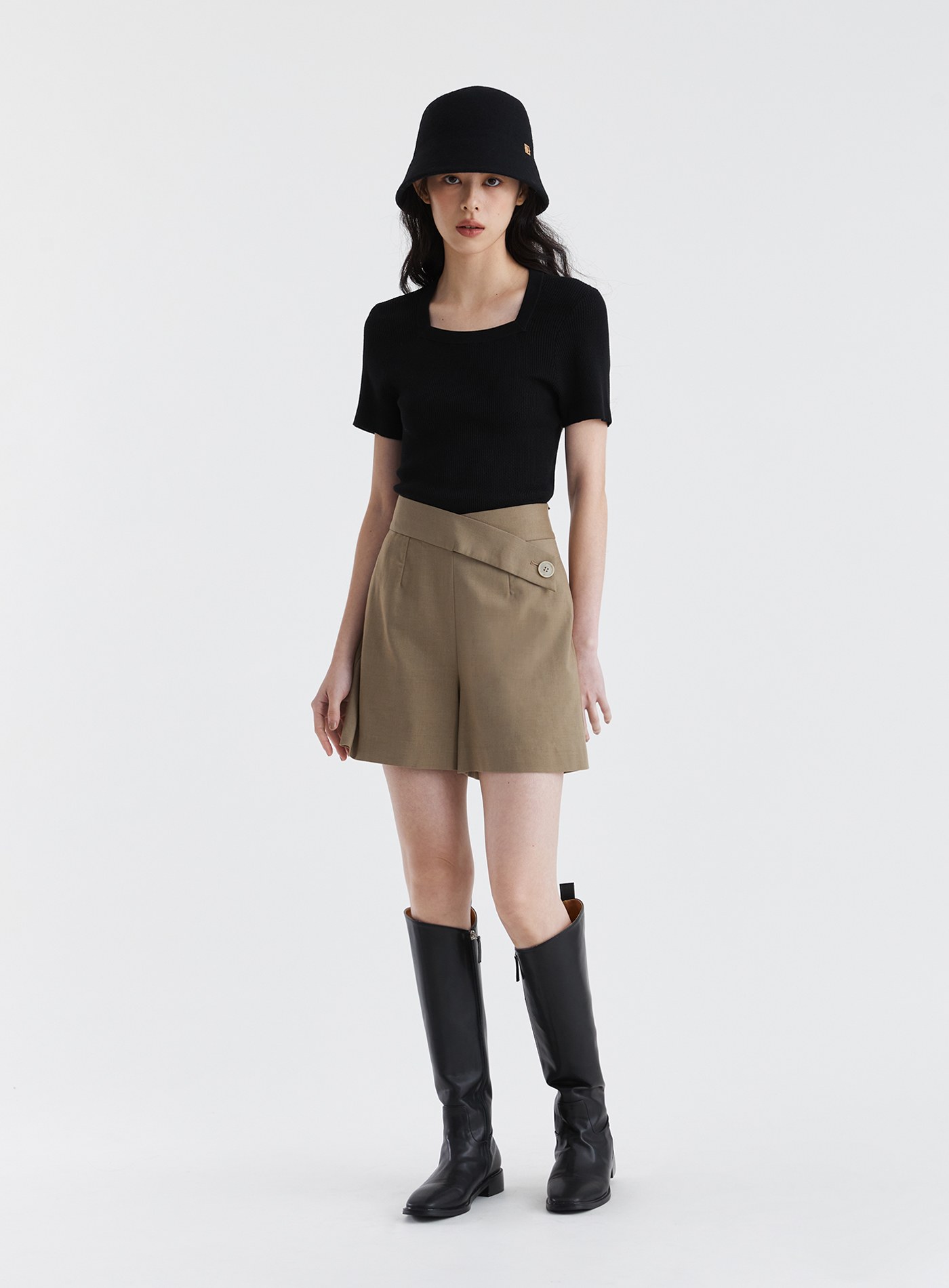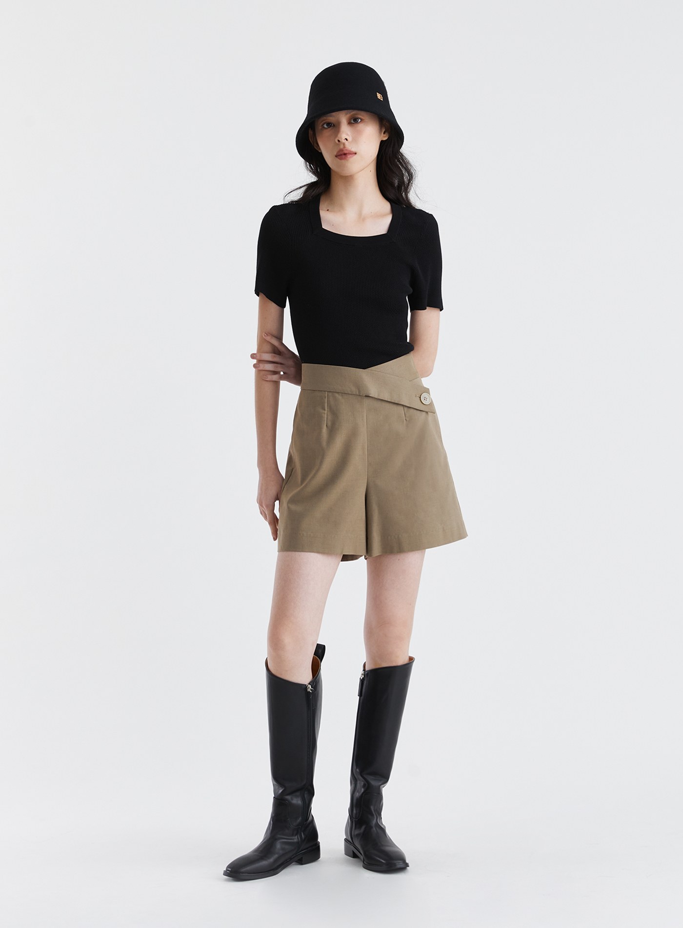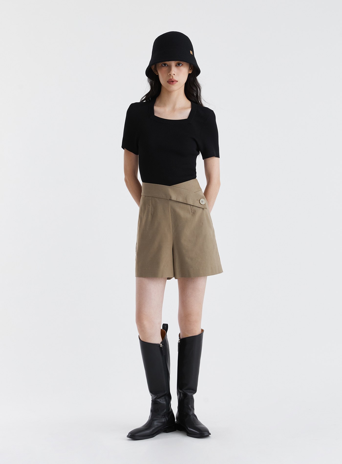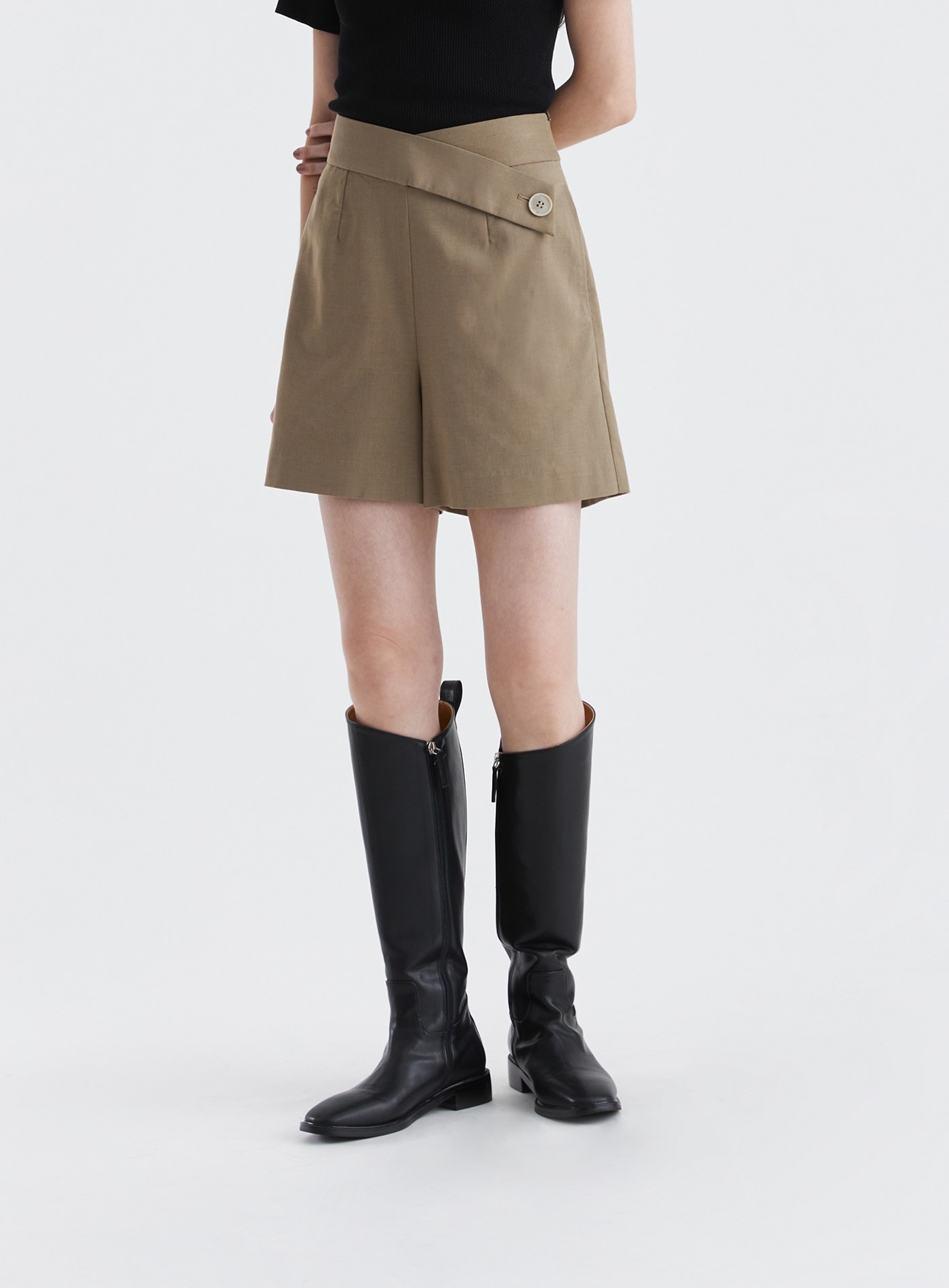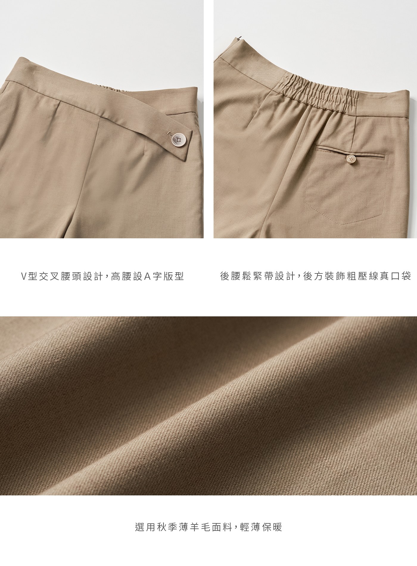 - V型交叉腰頭設計,高腰設A字版型,修飾臀型與腿型