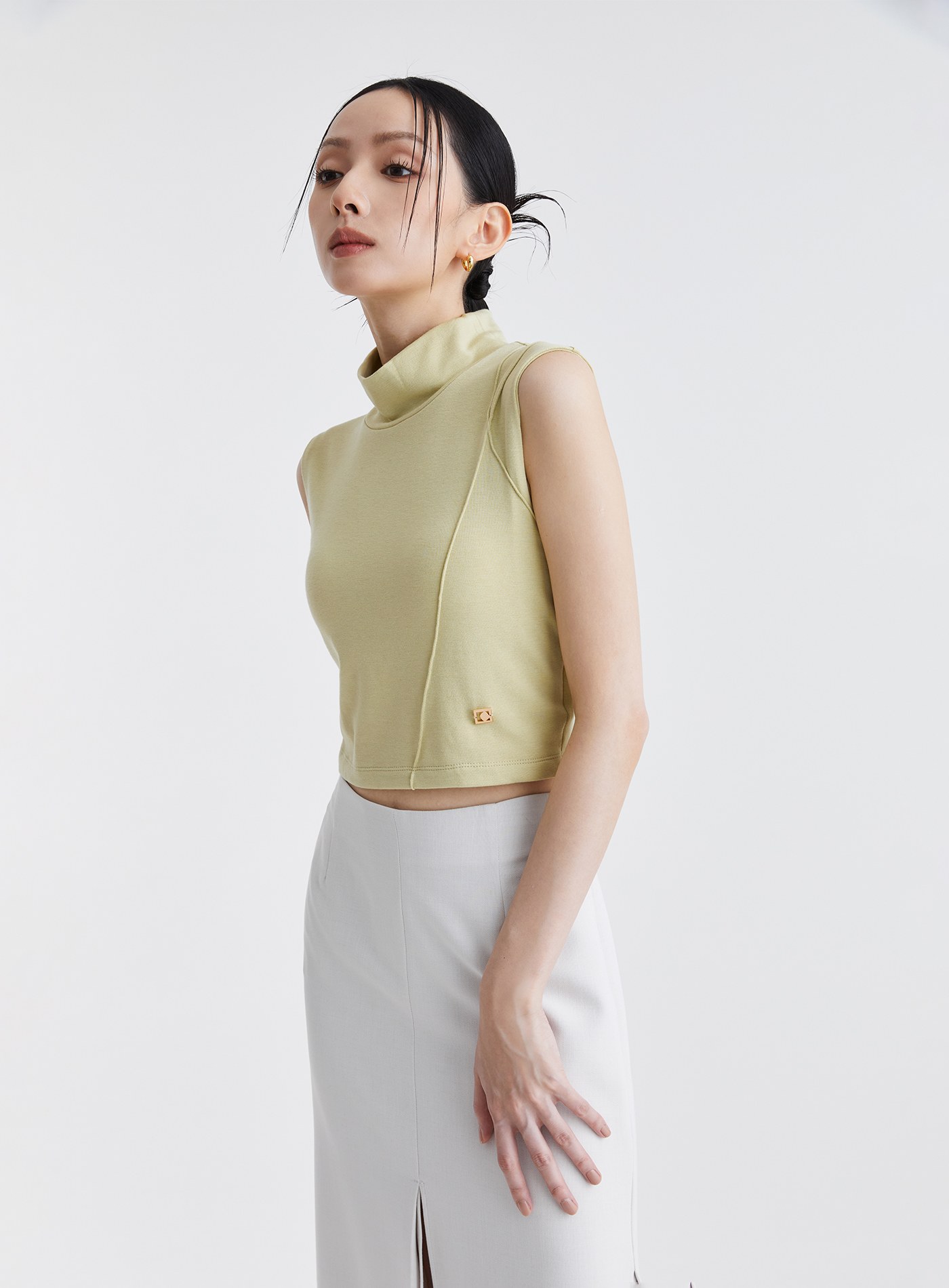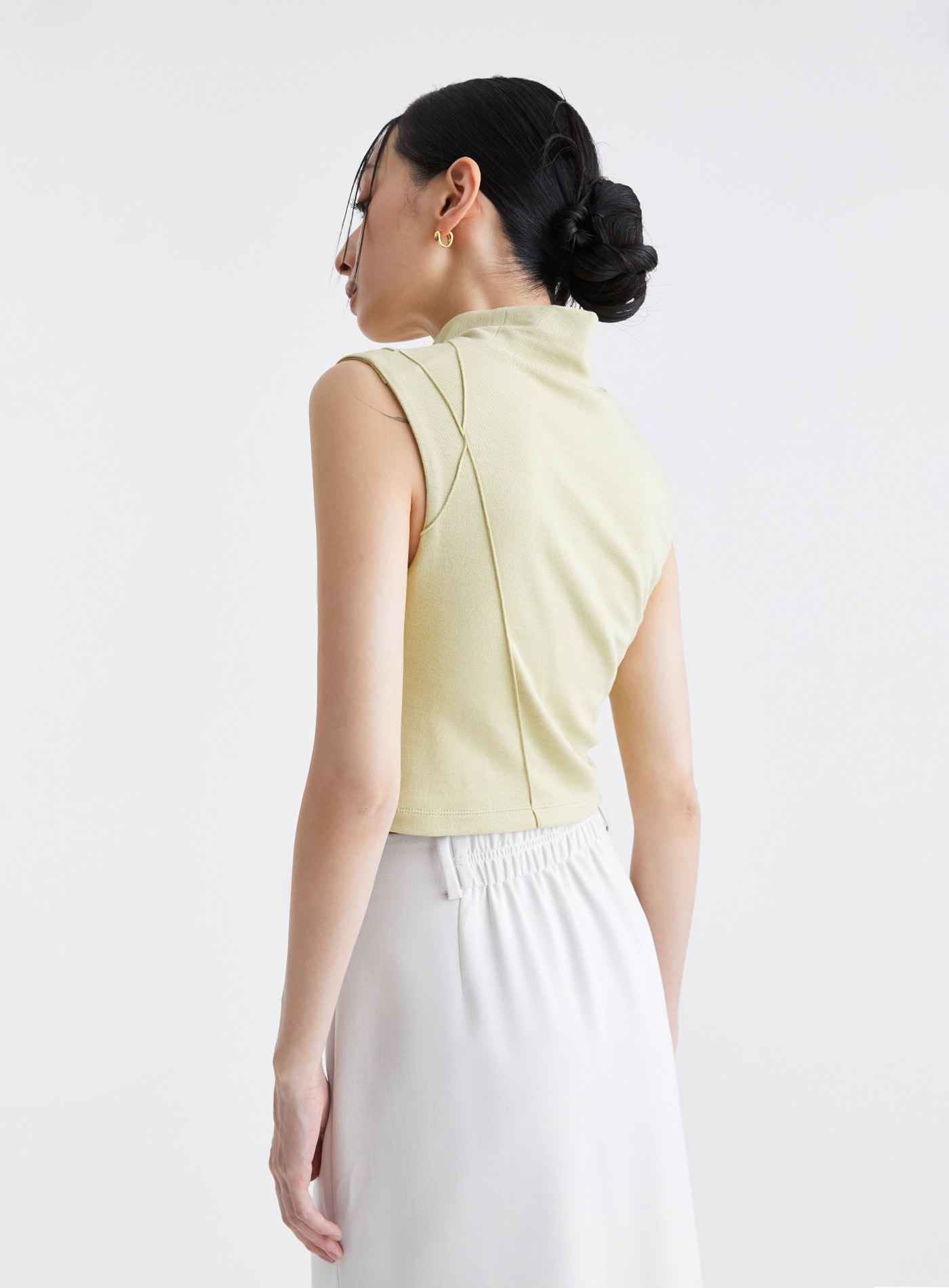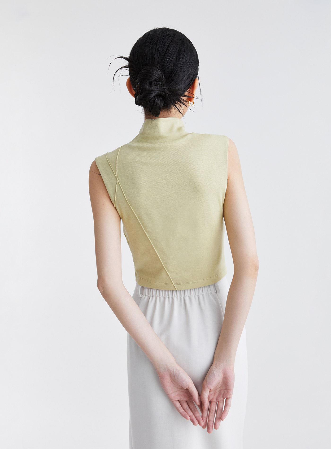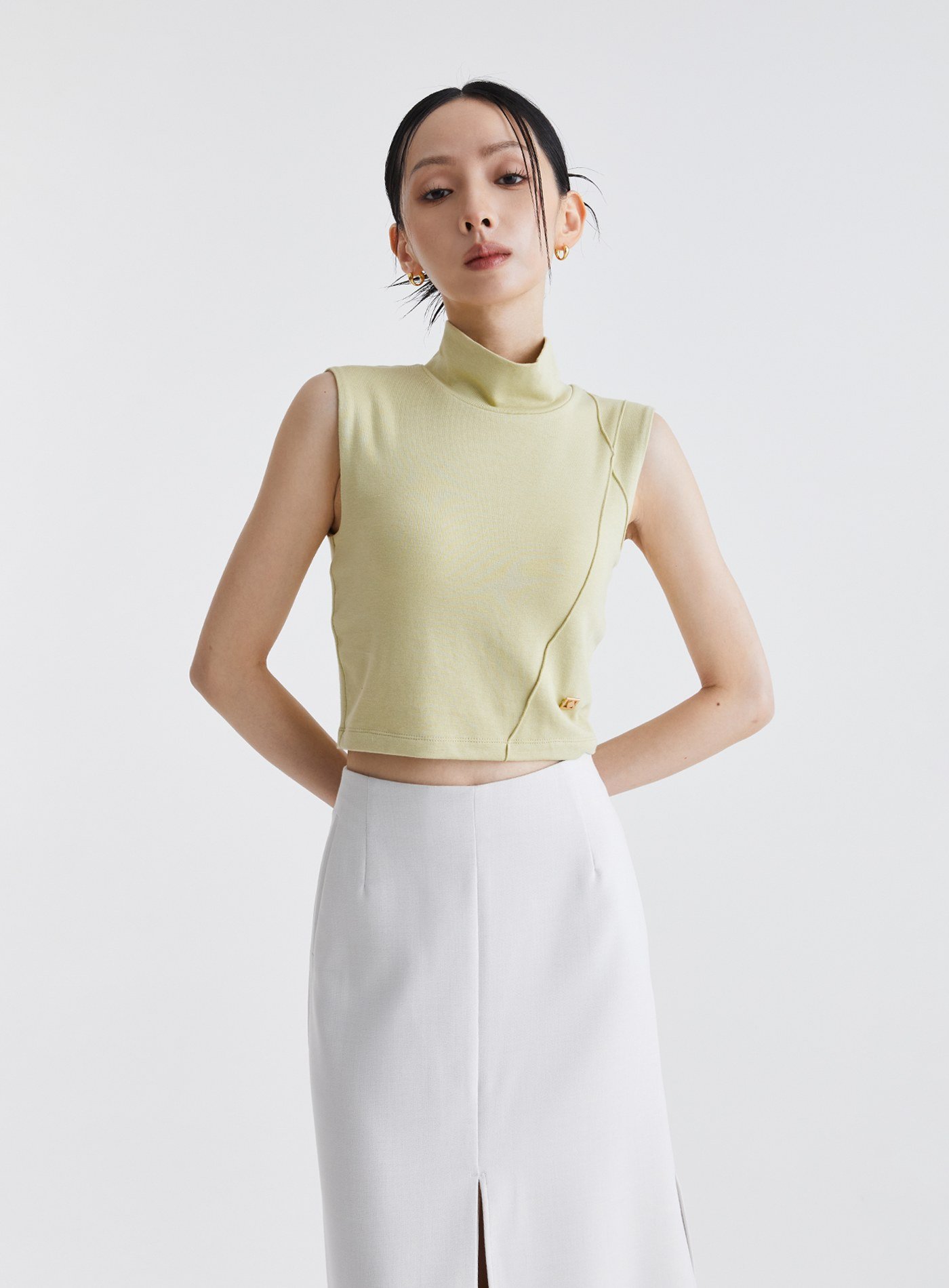 - 左側交叉平塔克細節,下方縫有品牌識別金屬標