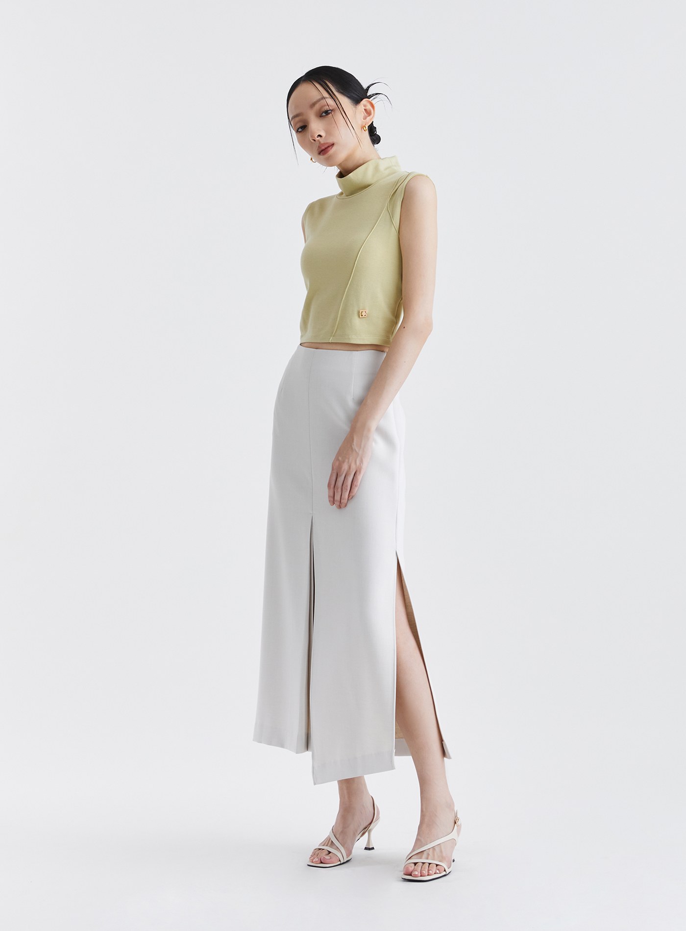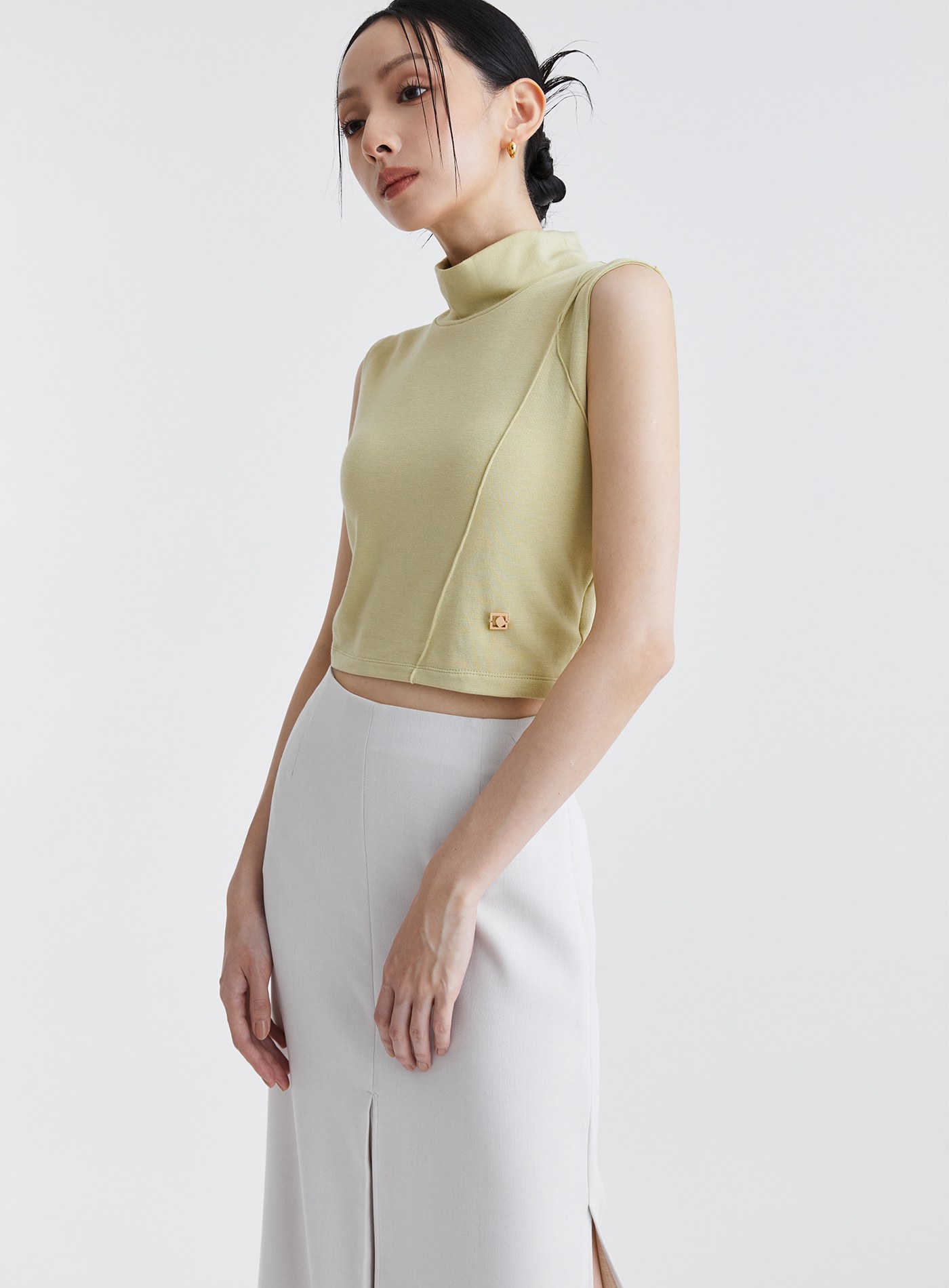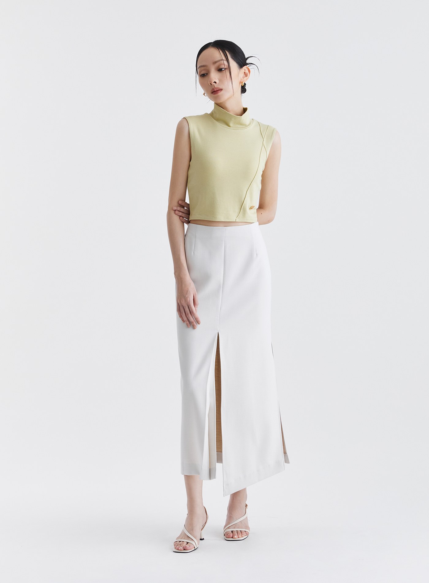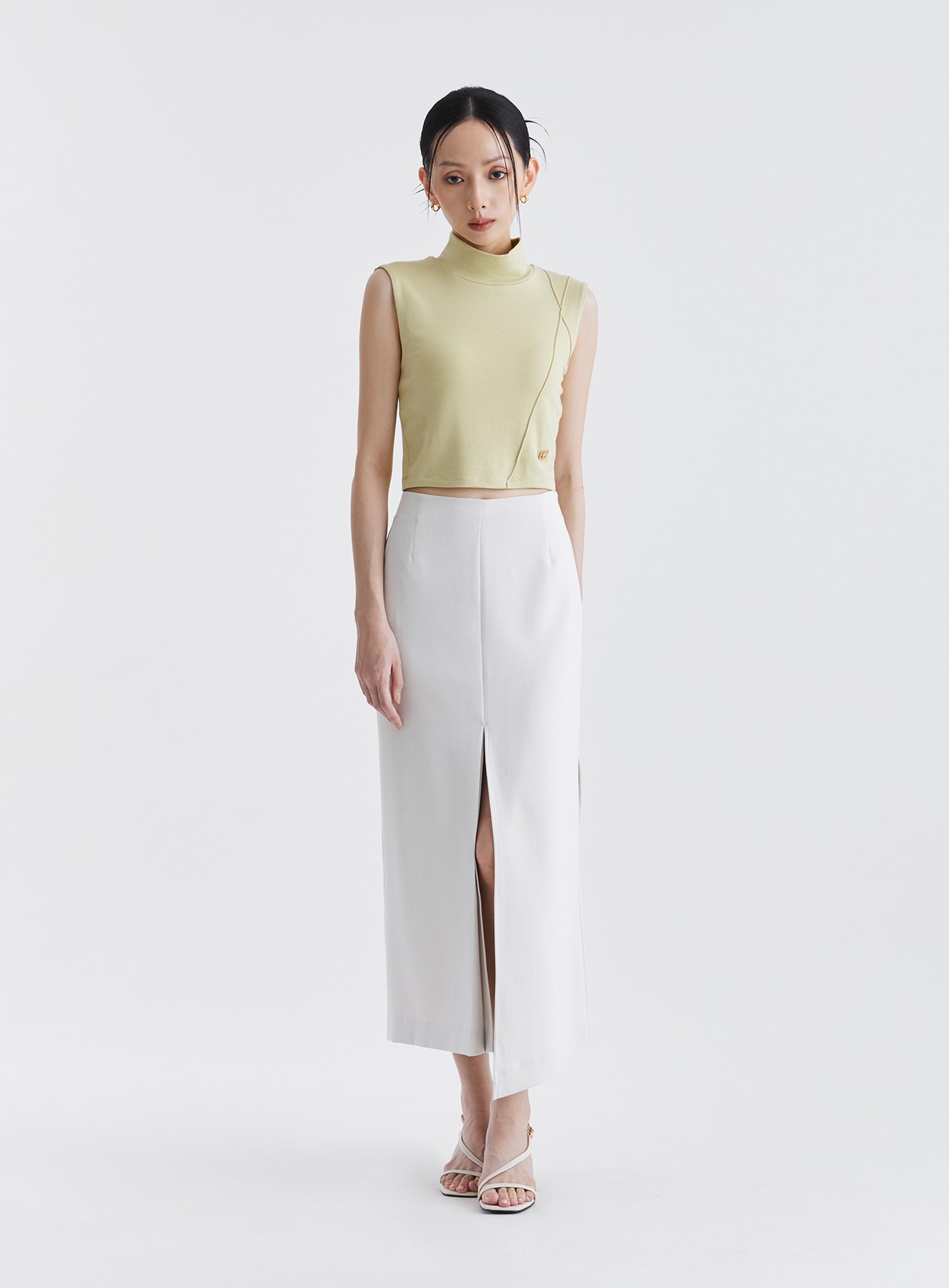 - 左側交叉平塔克細節,下方縫有品牌識別金屬標