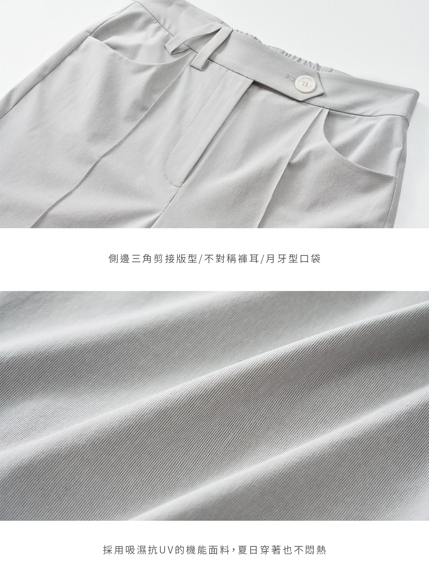 - 側邊三角剪接版型/不對稱褲耳/月牙型口袋