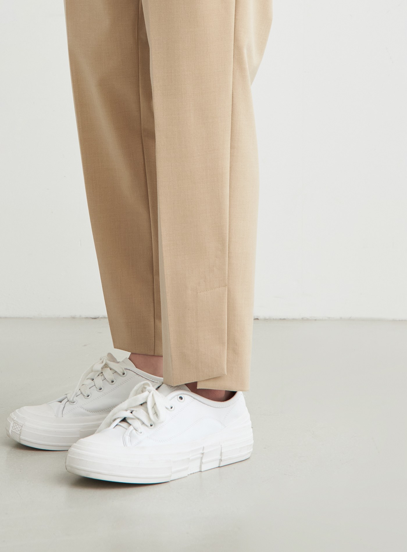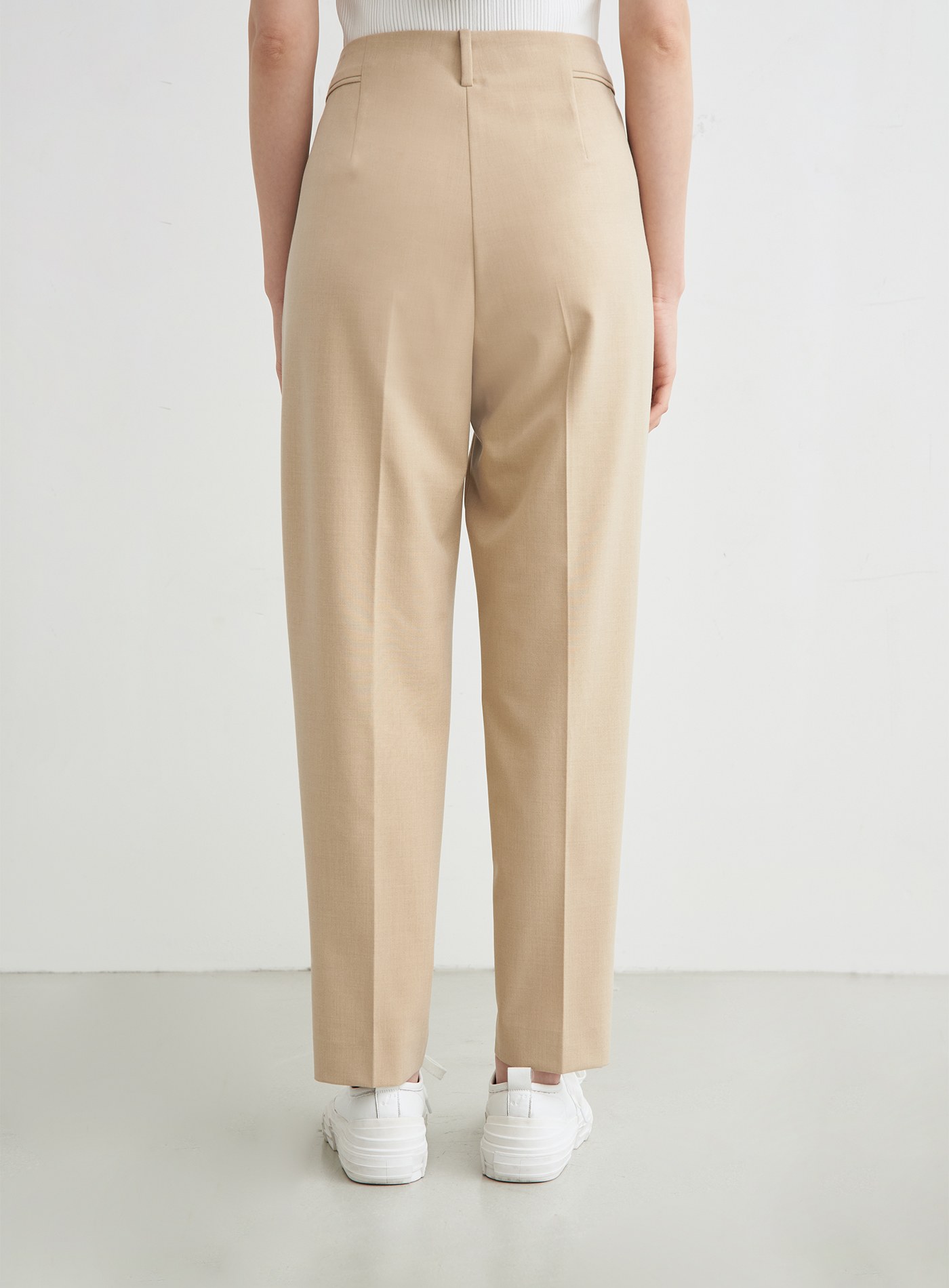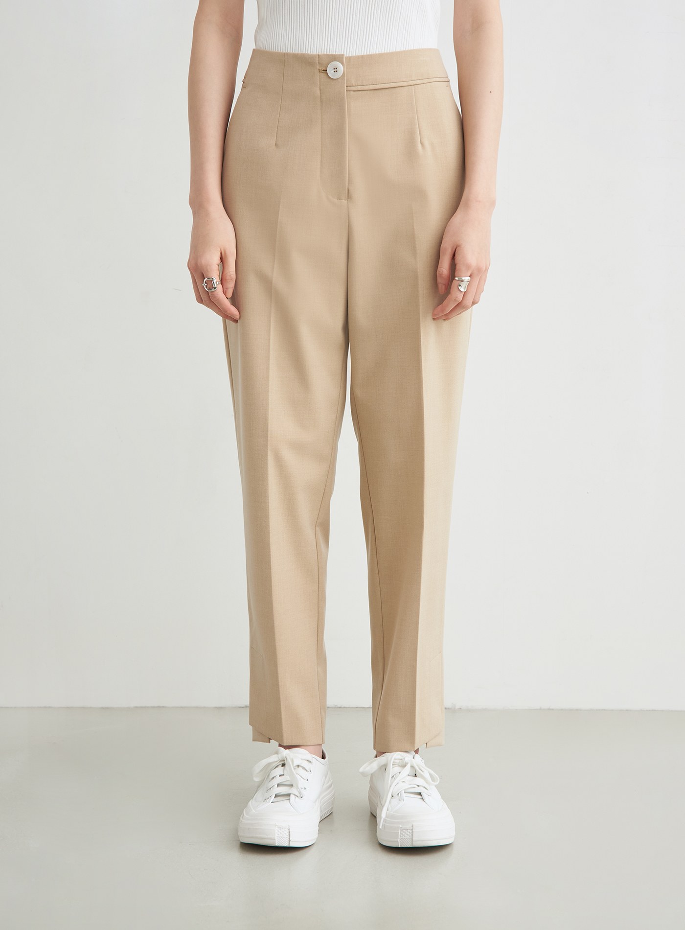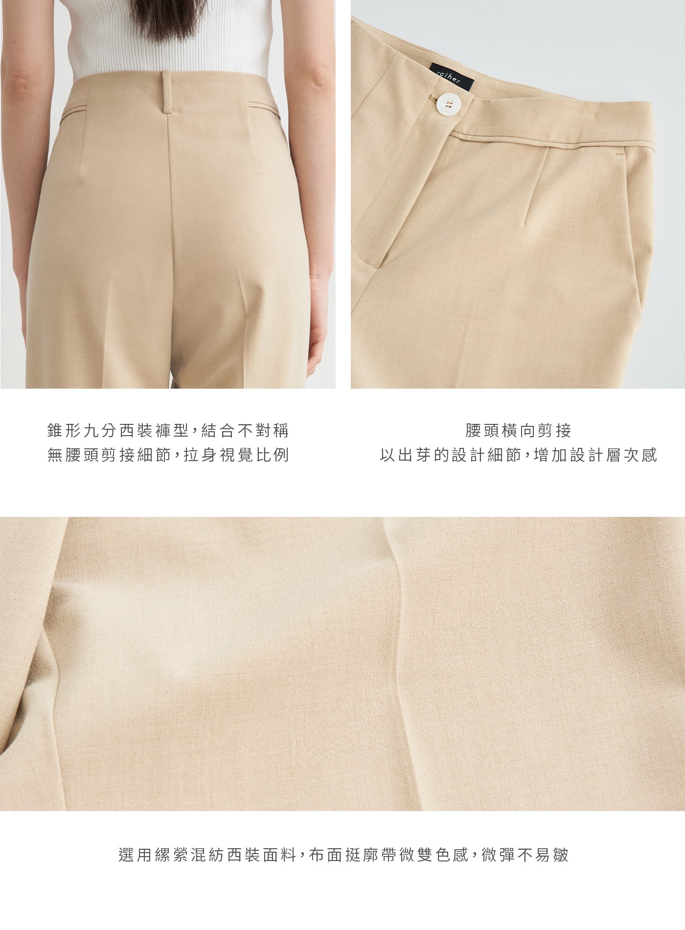 - 錐形九分西裝褲型,結合不對稱無腰頭剪接細節,拉身視覺比例