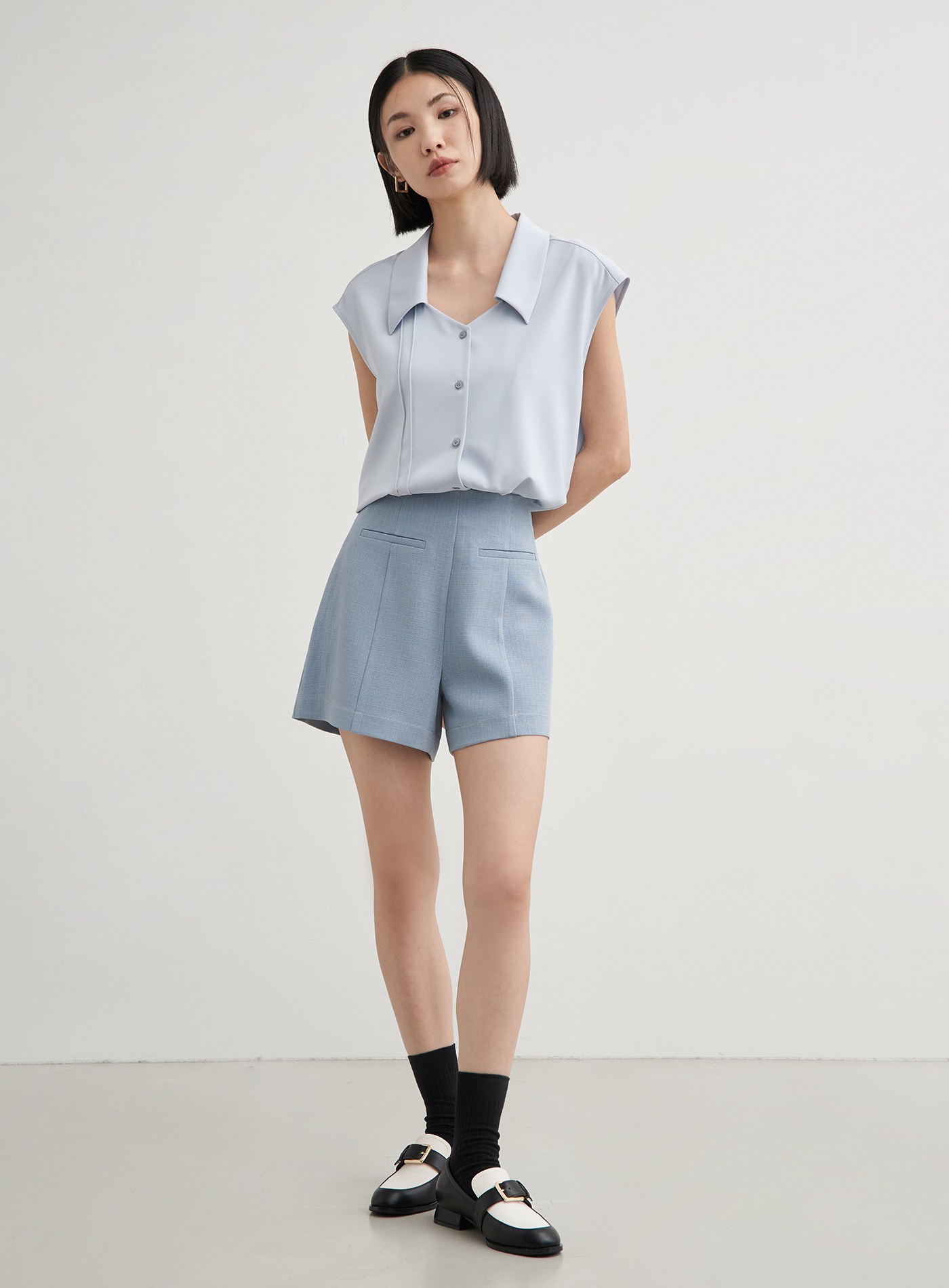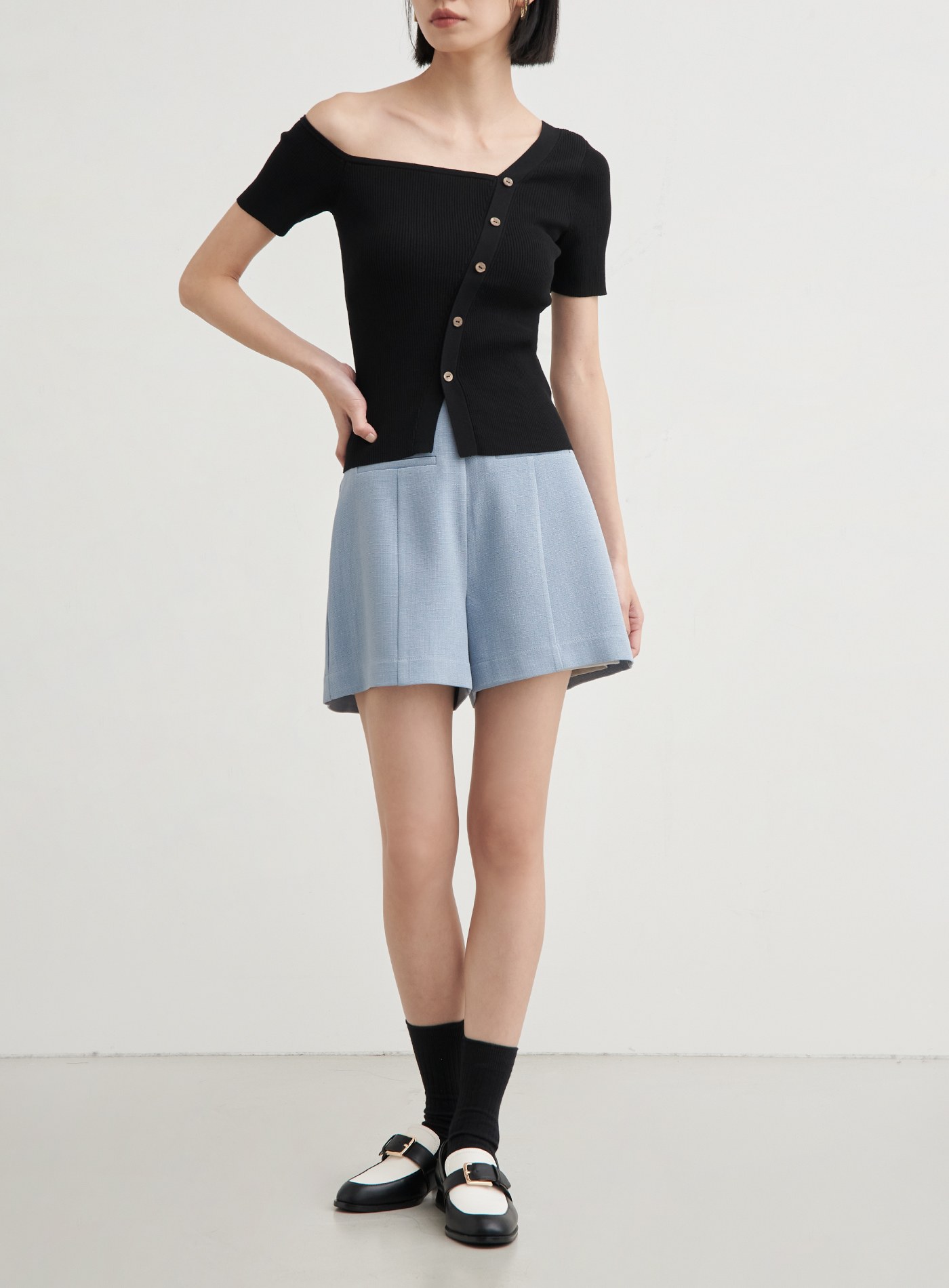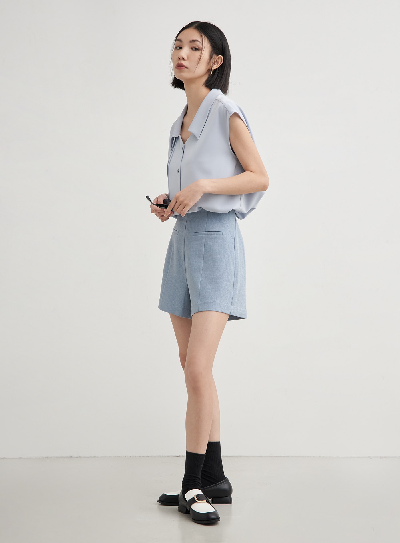 - 高腰直筒短褲剪裁,布面挺廓修飾臀型,拉伸視覺比例