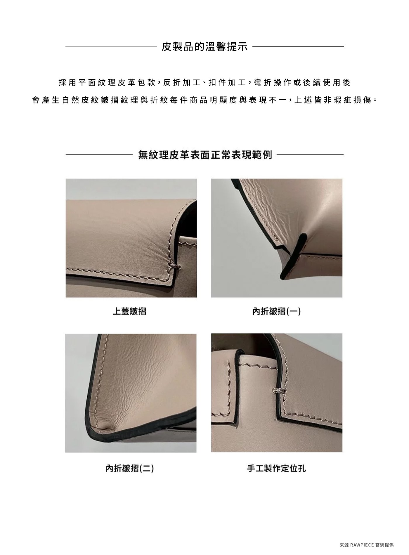 - 採用天然皮革具有正常頸背紋腹紋,偶有細小疤傷蟲斑,淺色皮料偶有0.5MM以下極細小點,以上皆屬正常現象