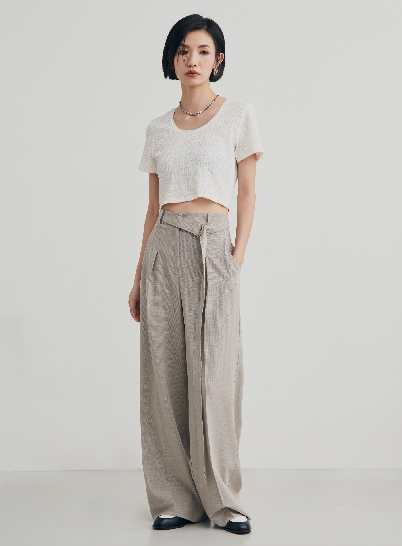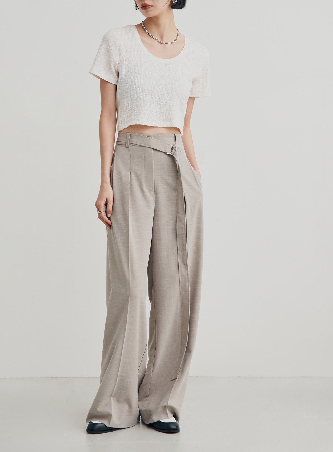 - 前身兩側運用打摺設計,增加腰臀圍的鬆量,讓褲型更加挺廓有型
