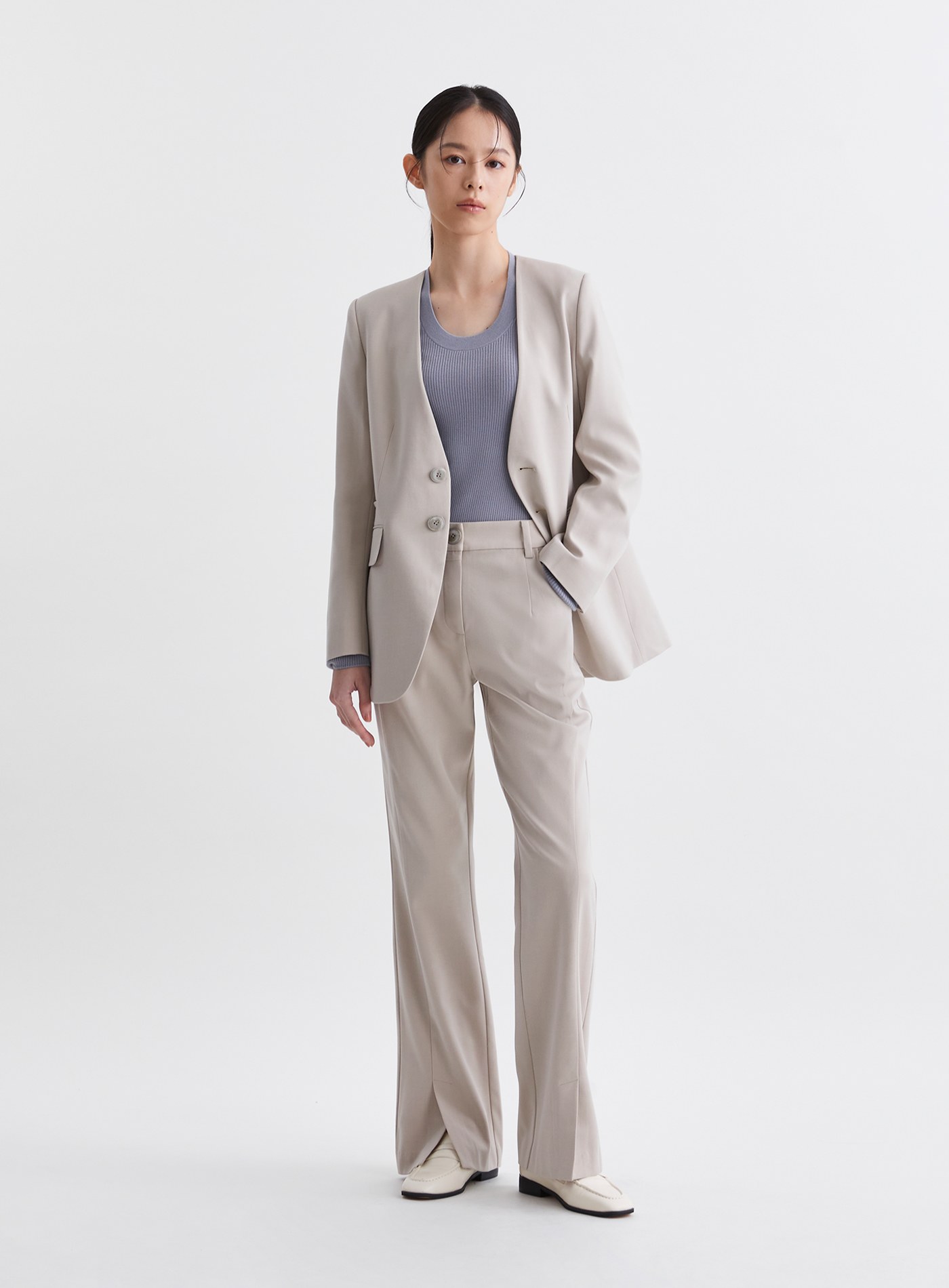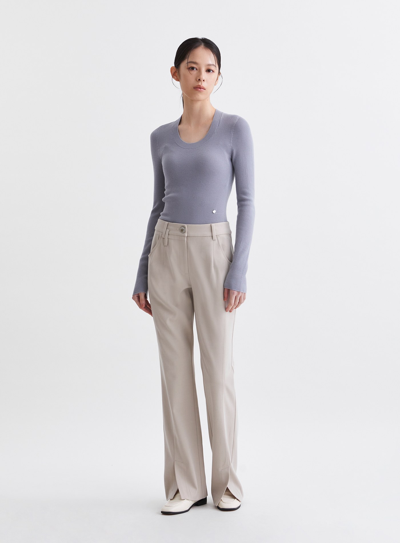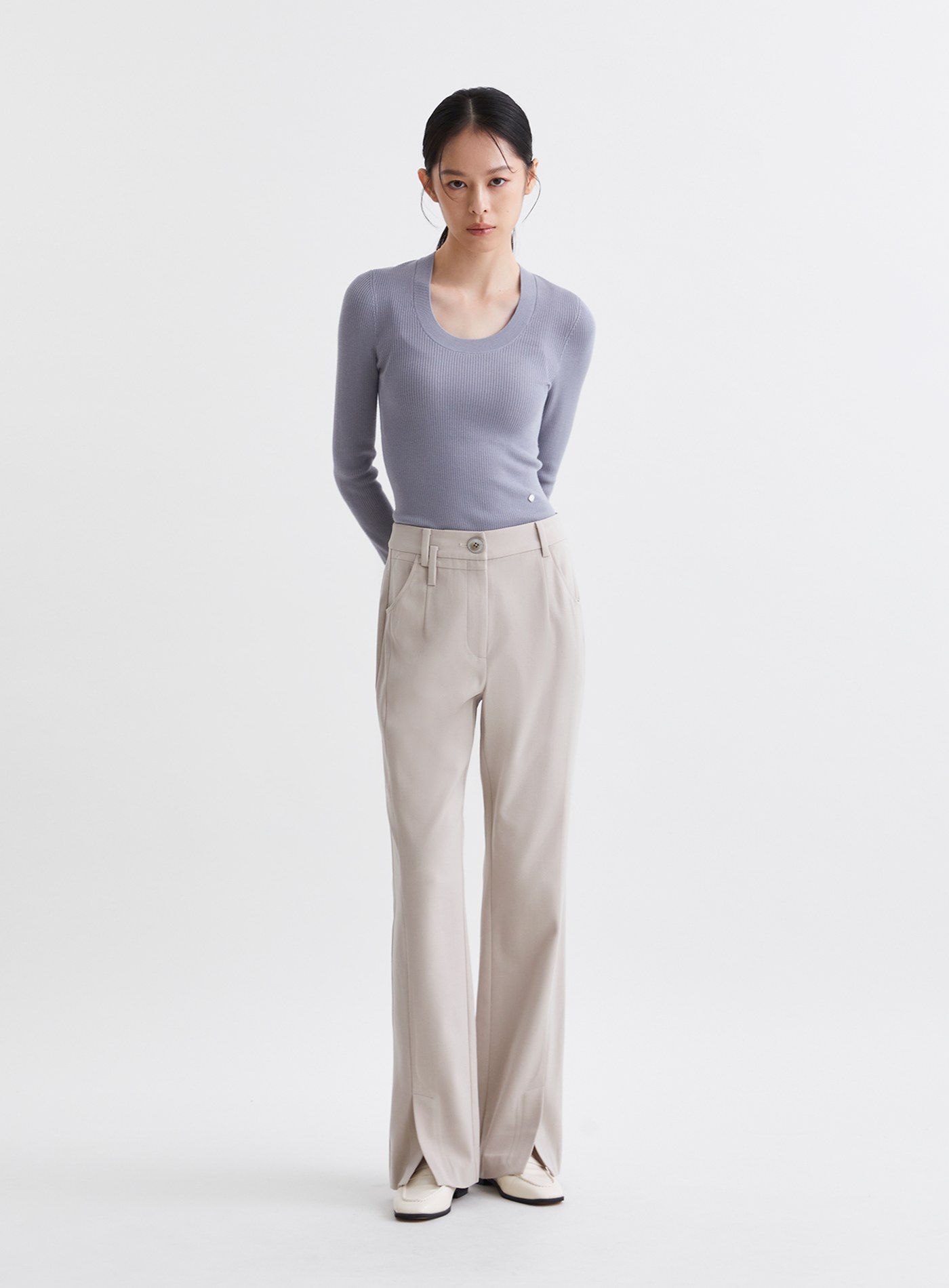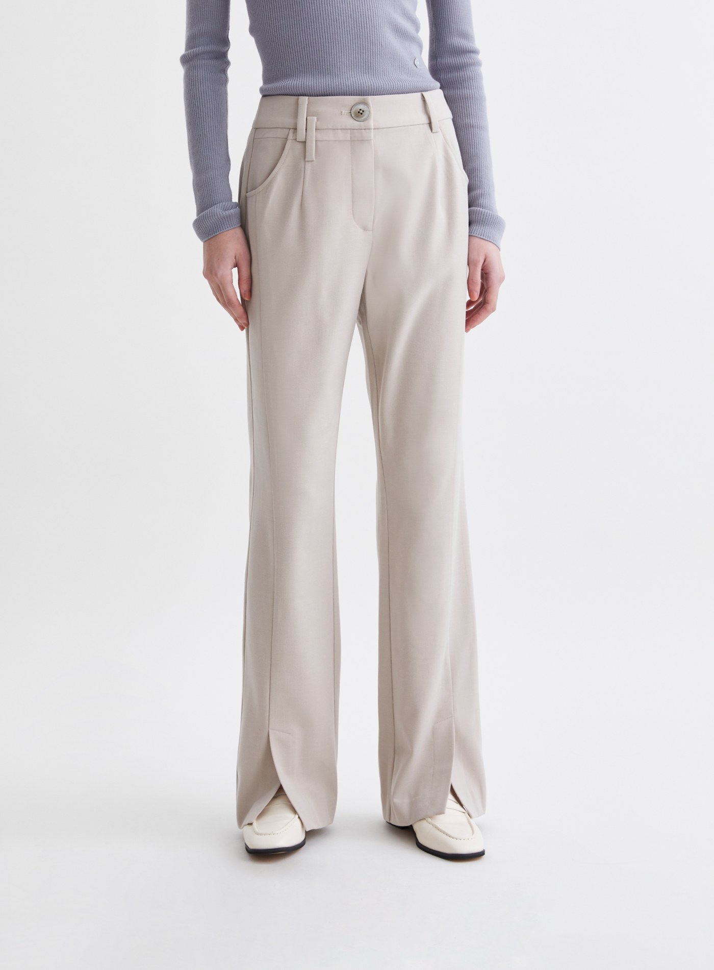 - 窄管修身褲型,下擺開衩,營造微喇叭效果