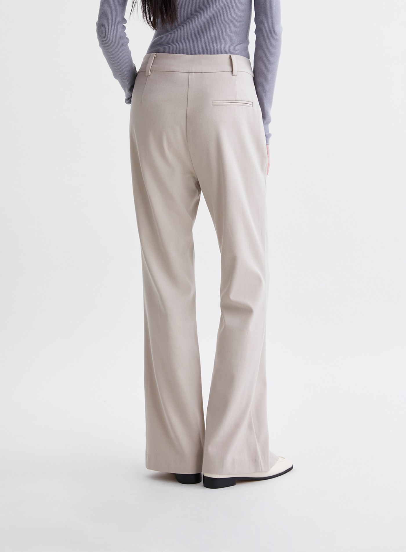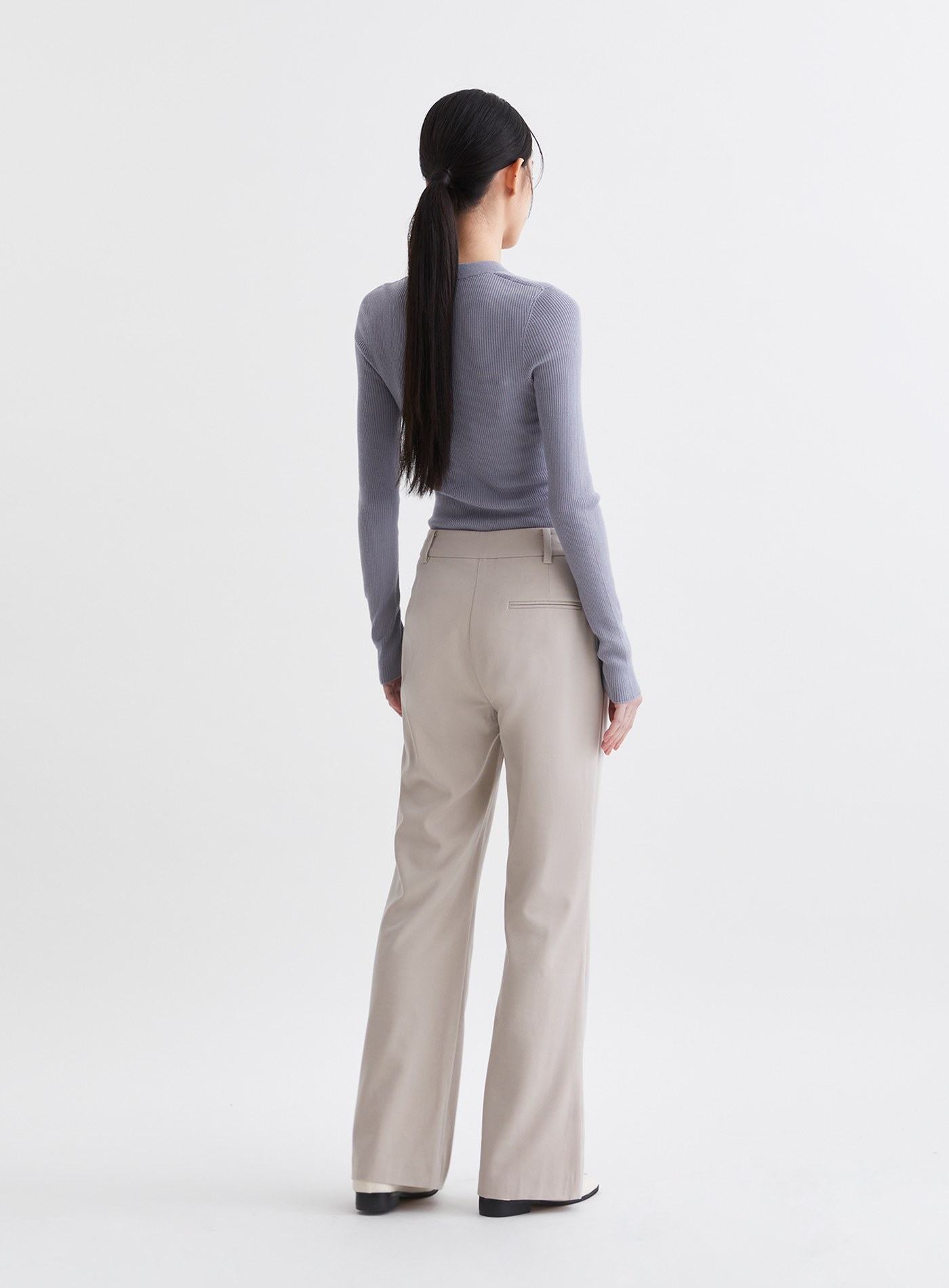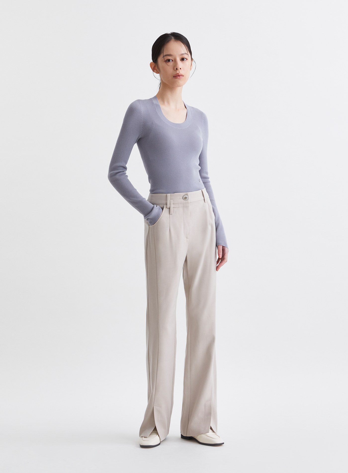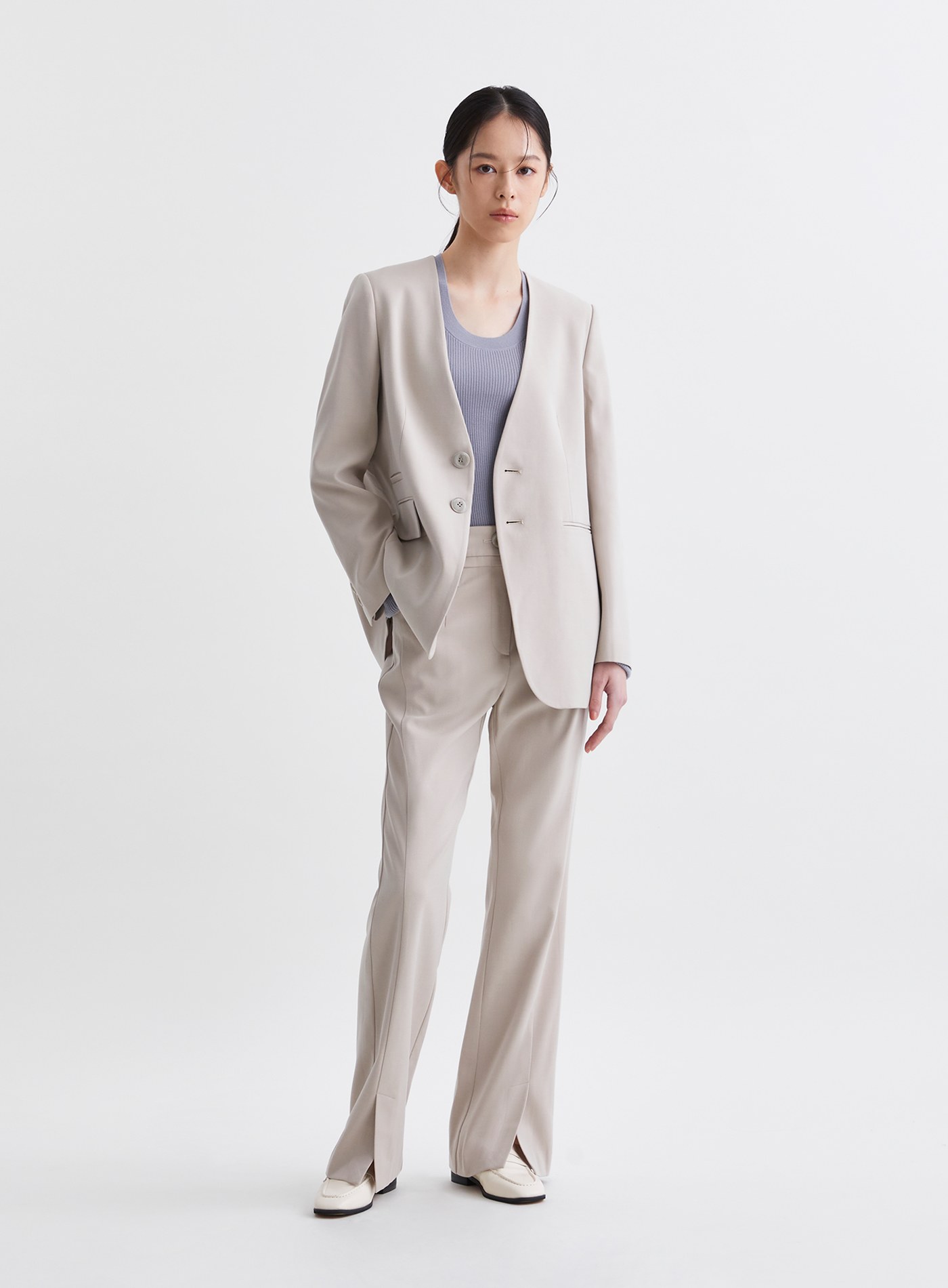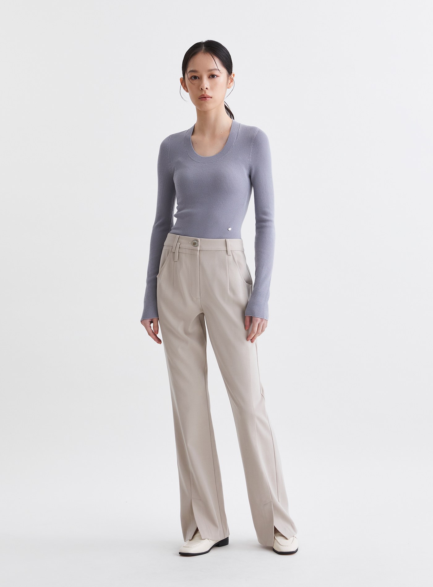 - 窄管修身褲型,下擺開衩,營造微喇叭效果