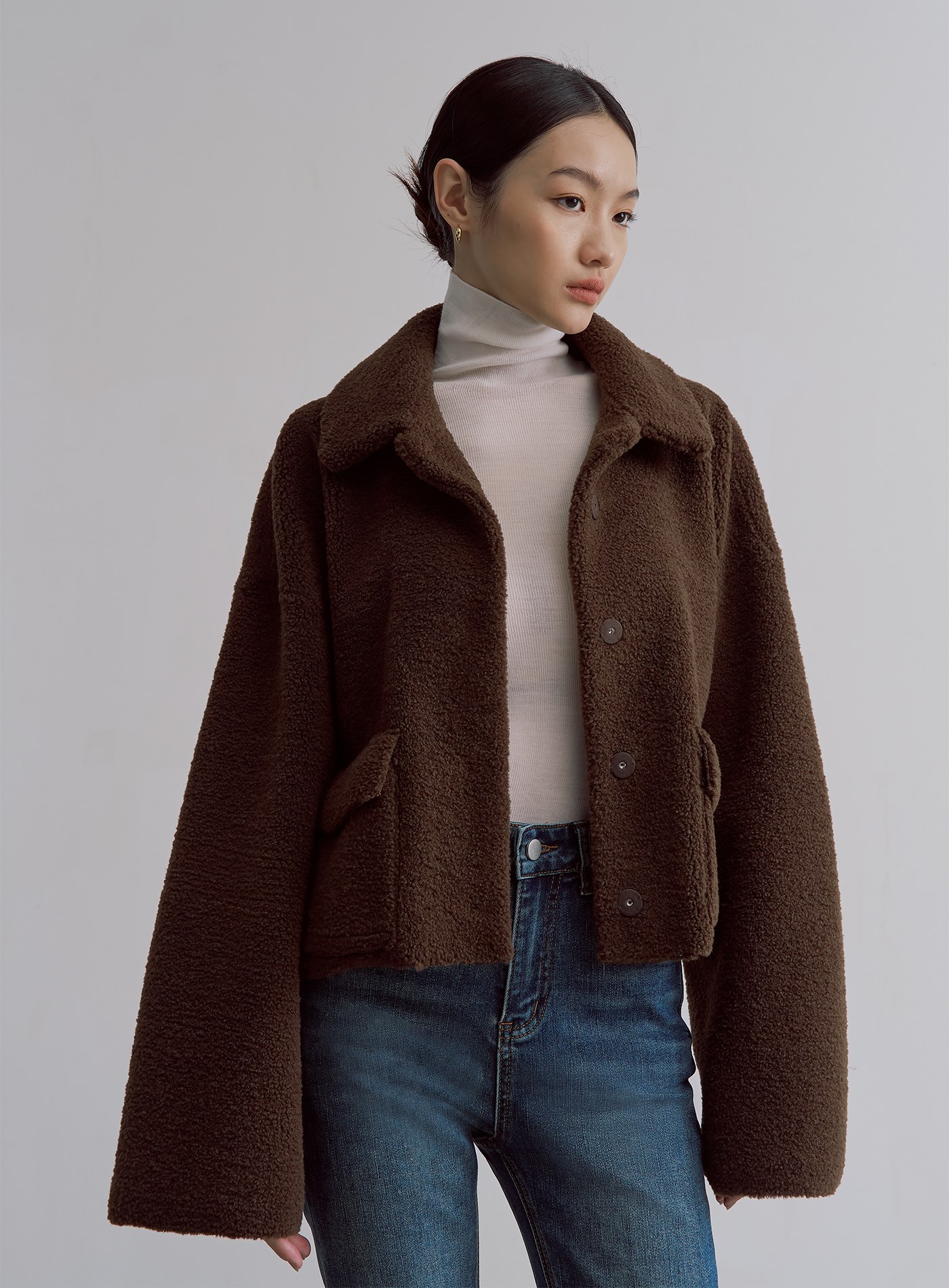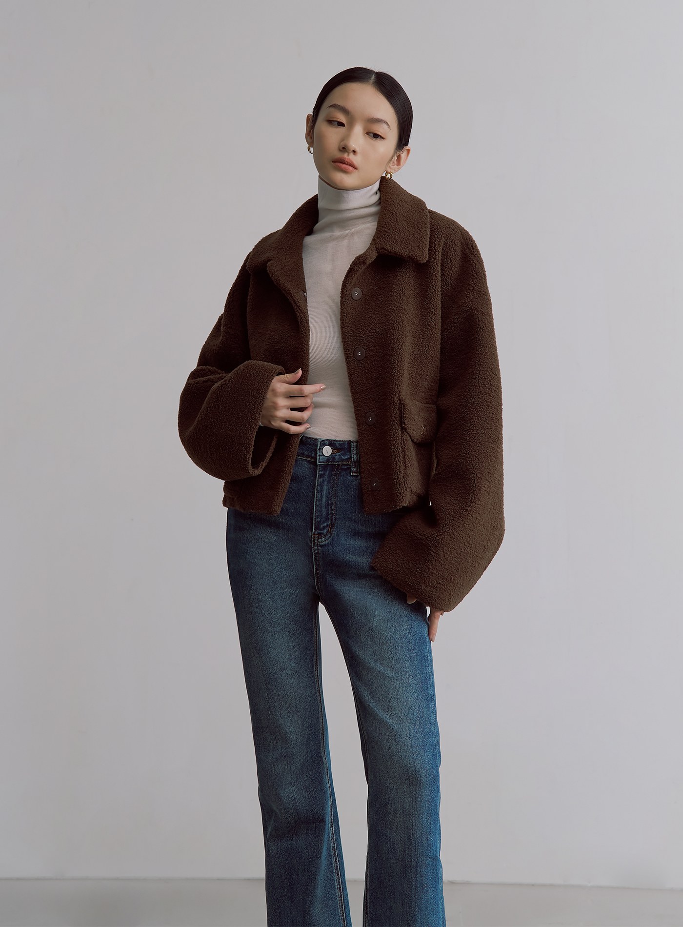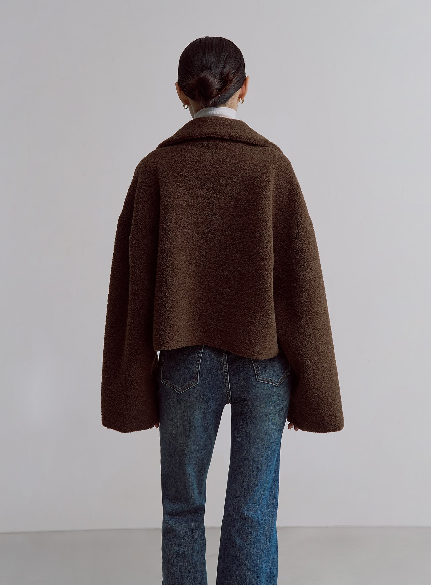 - 寬袖可反摺,露出内側麂皮面料,增添層次感