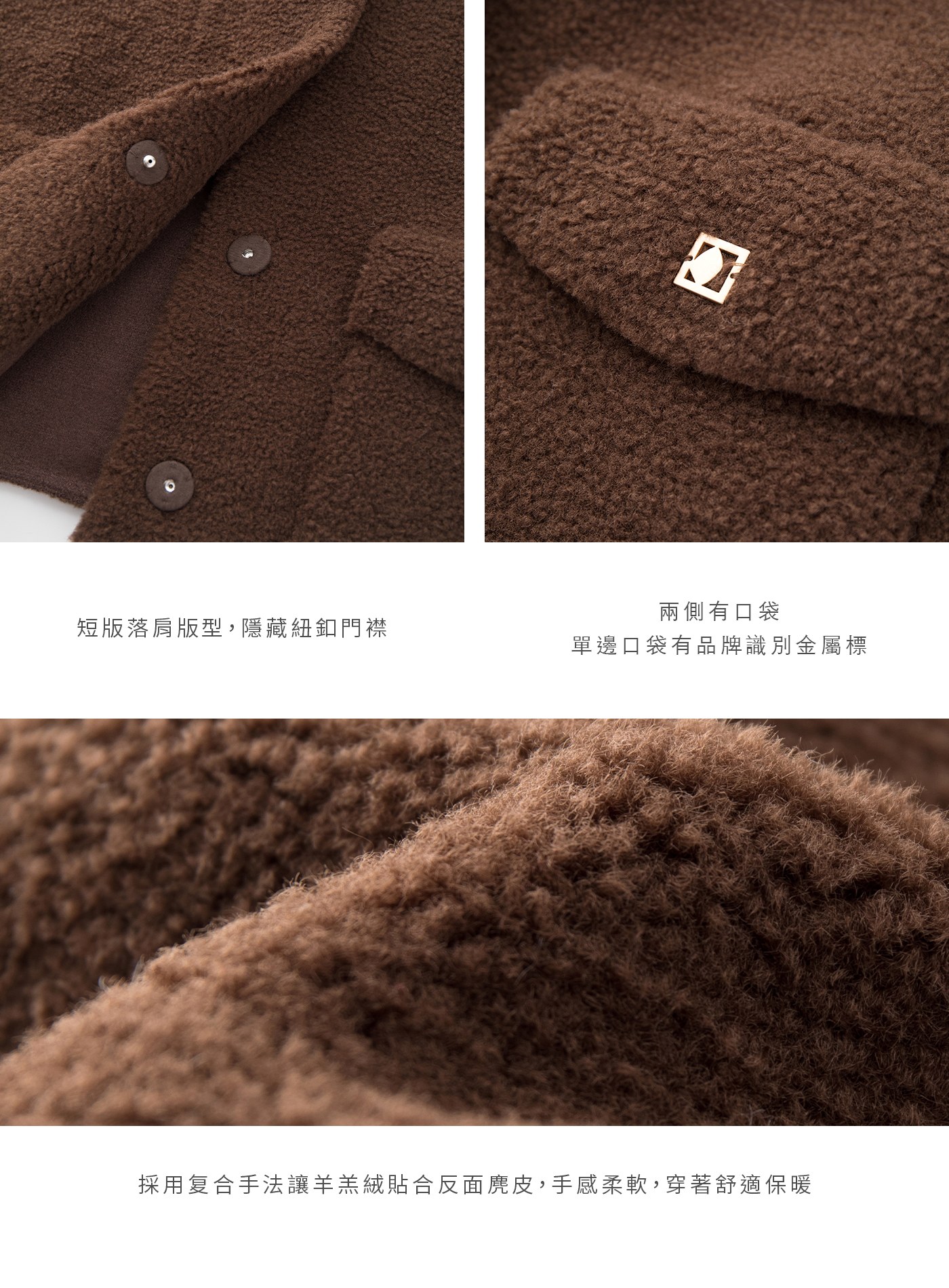 - 採用複合手法讓羊羔絨貼合反面麂皮,手感柔軟,穿著舒適保暖