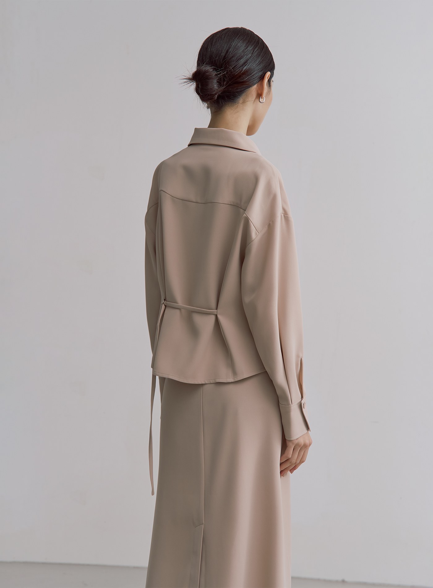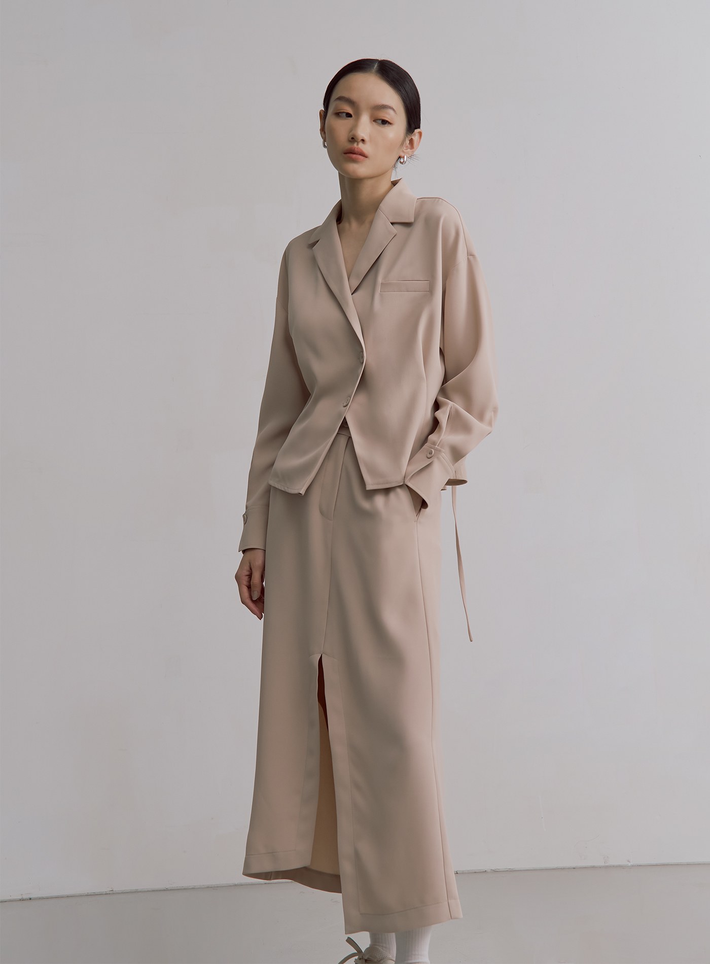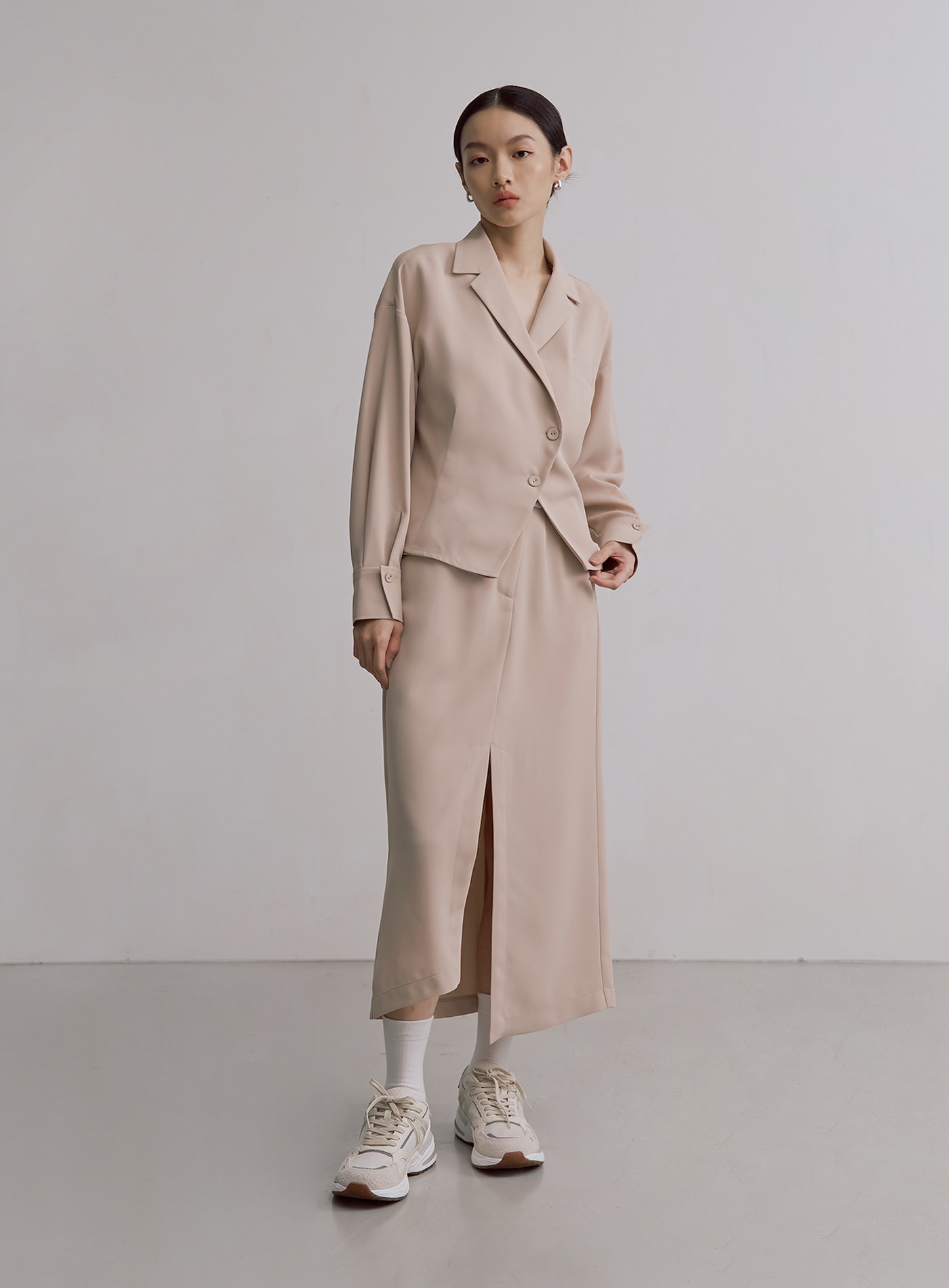 - 可與‘垂墜斜交曡腰頭開衩中長裙’搭成套裝