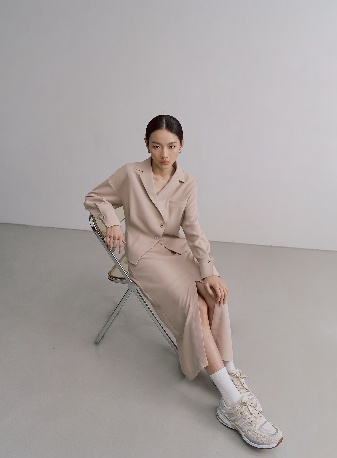 - 西裝外套領型運用於上衣,塑造質感半正式穿搭