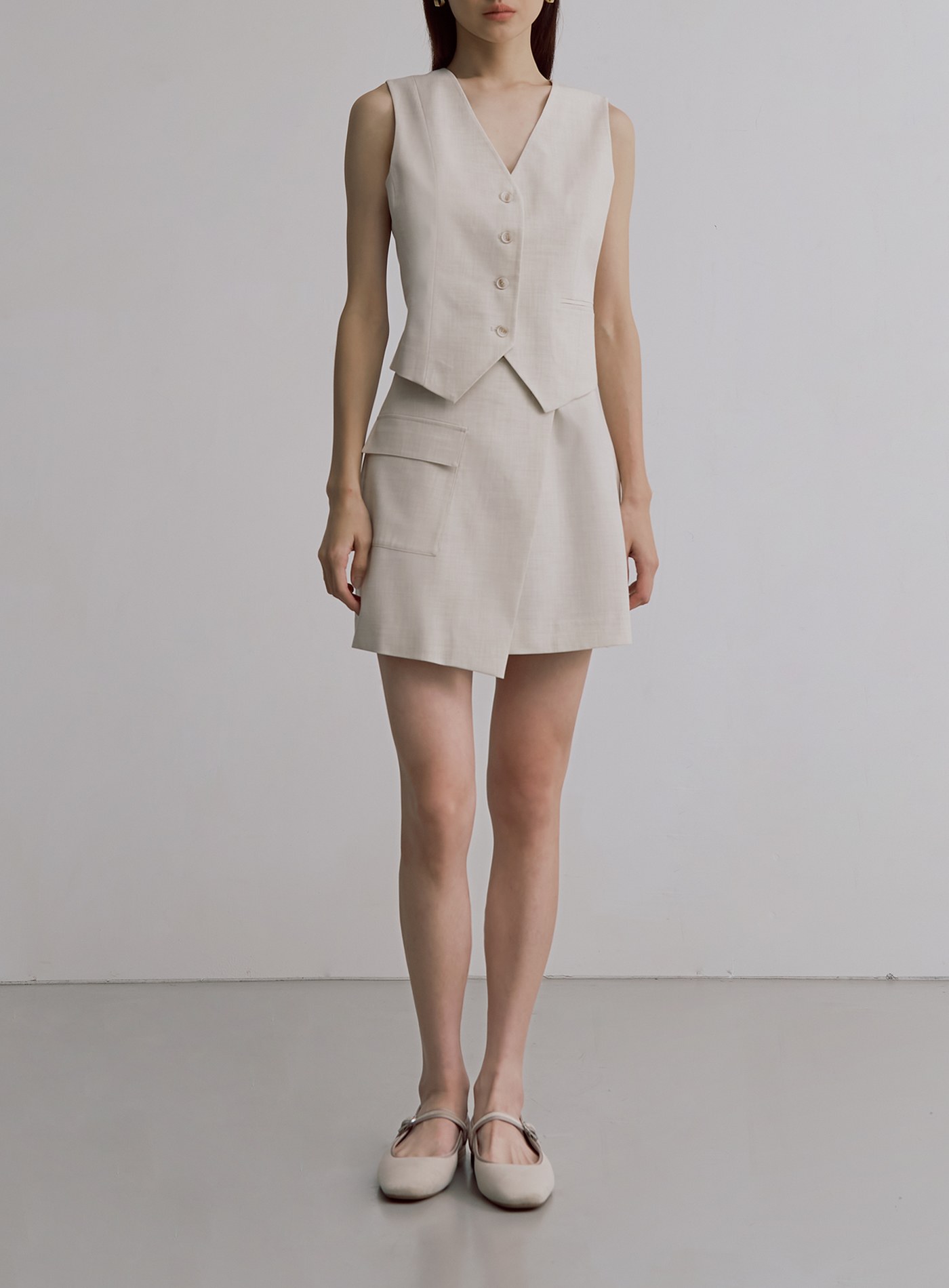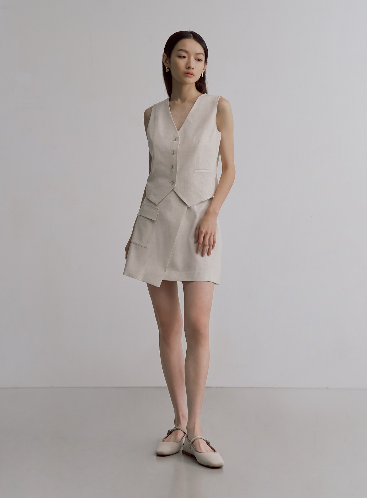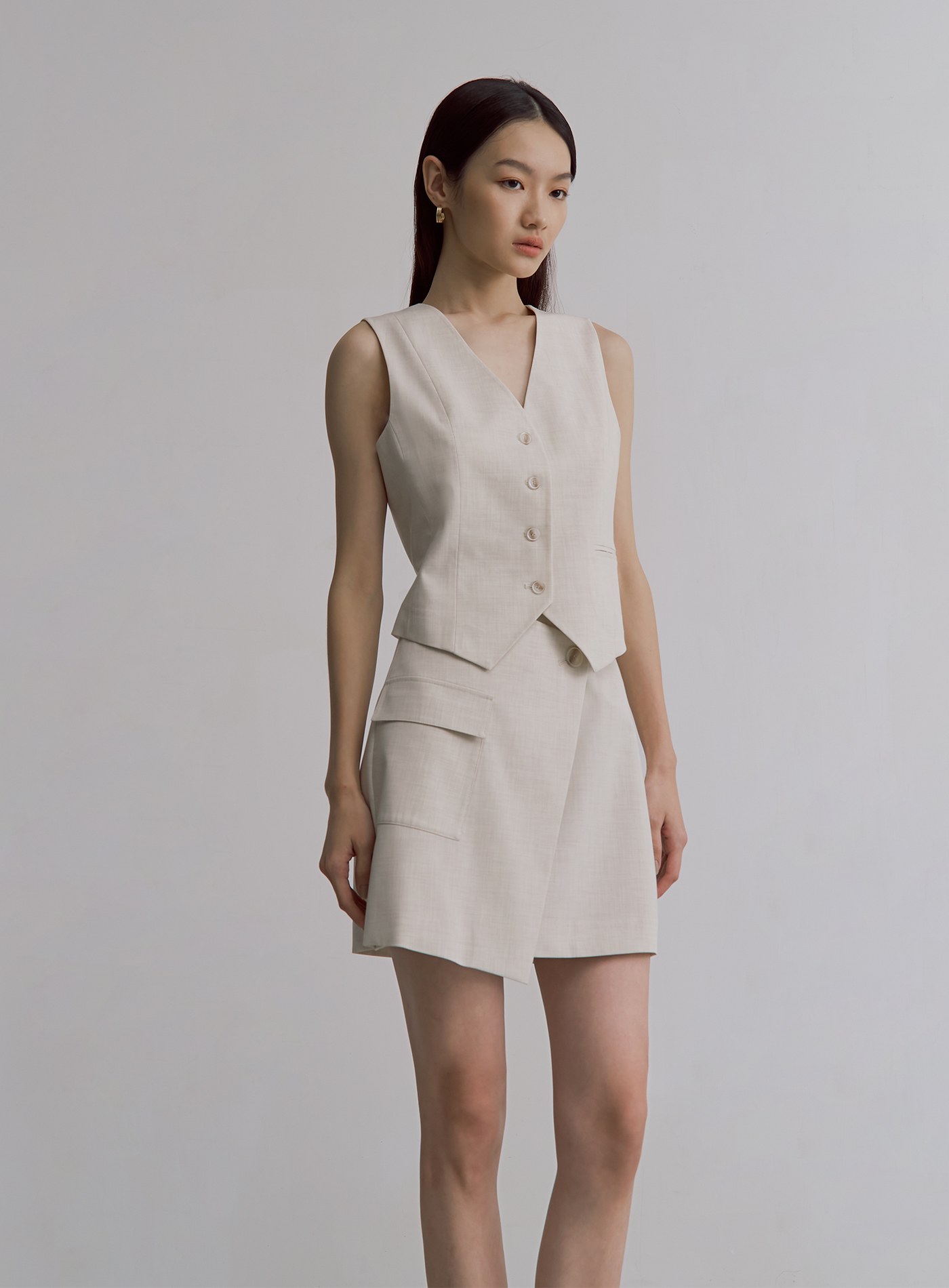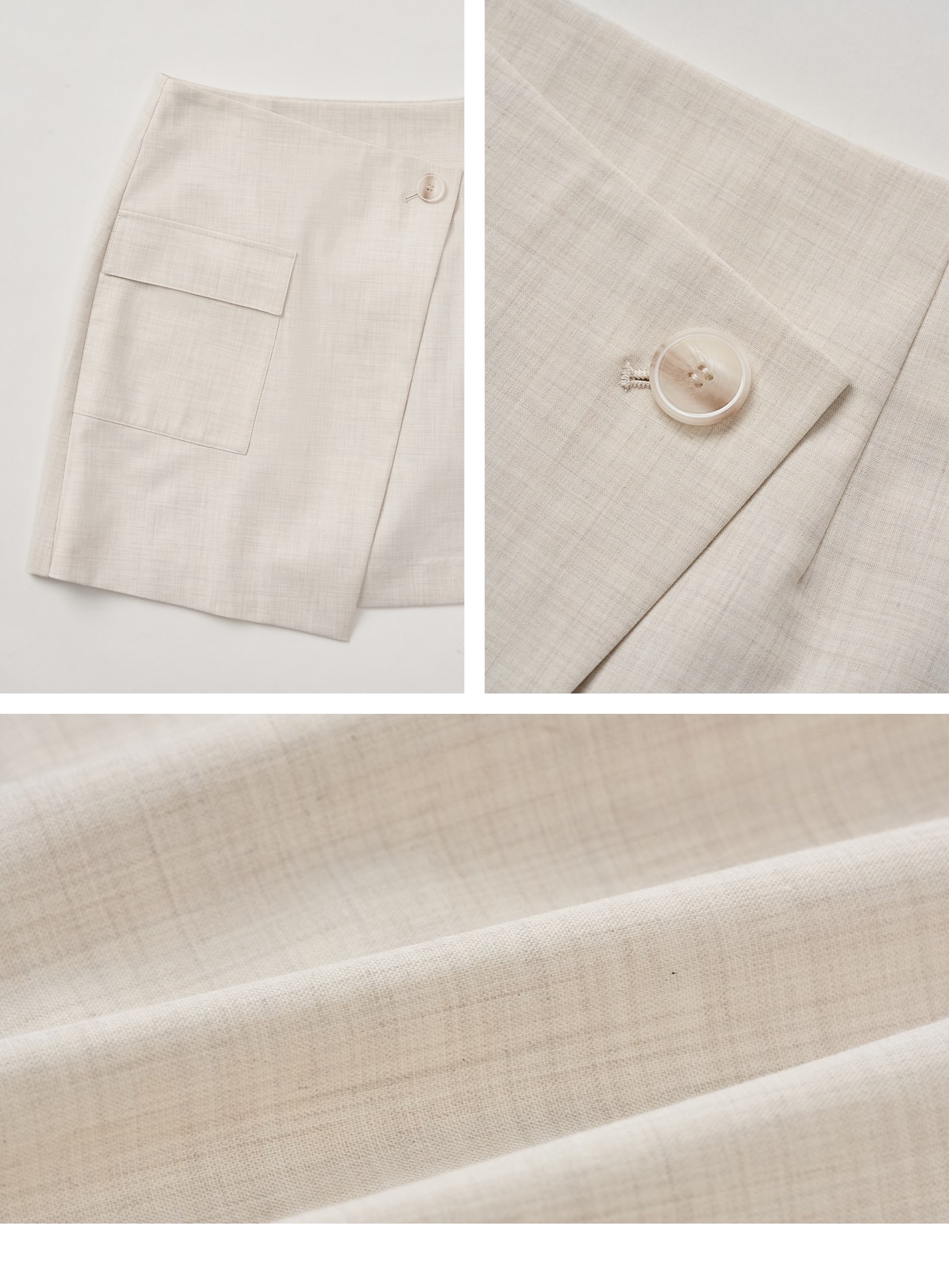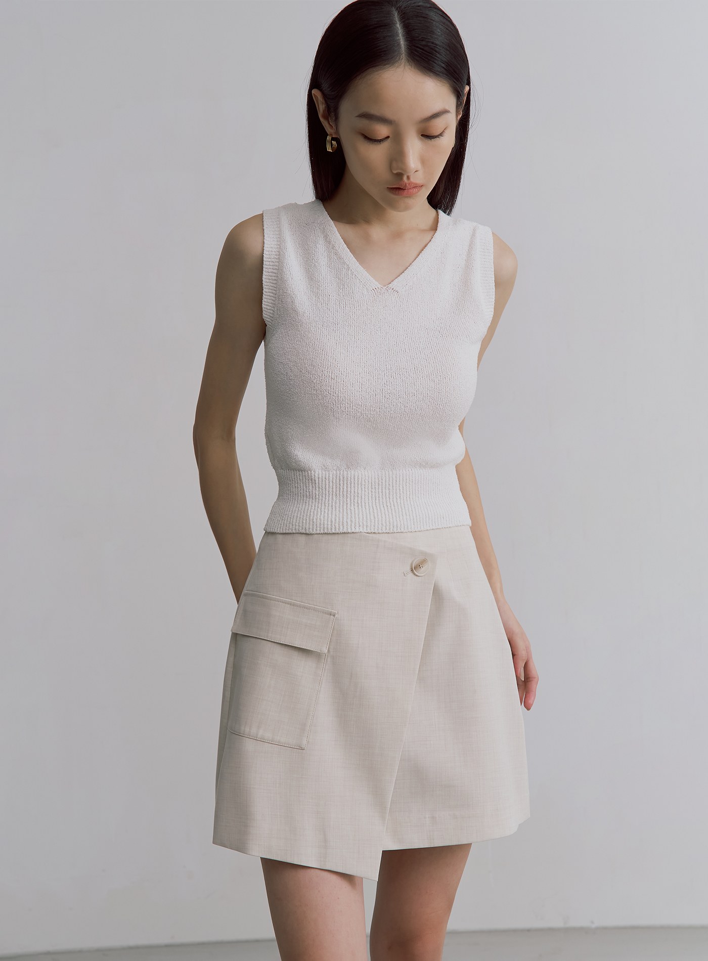 - 前片斜切交曡設計,側邊工裝貼袋,後片裝飾口袋