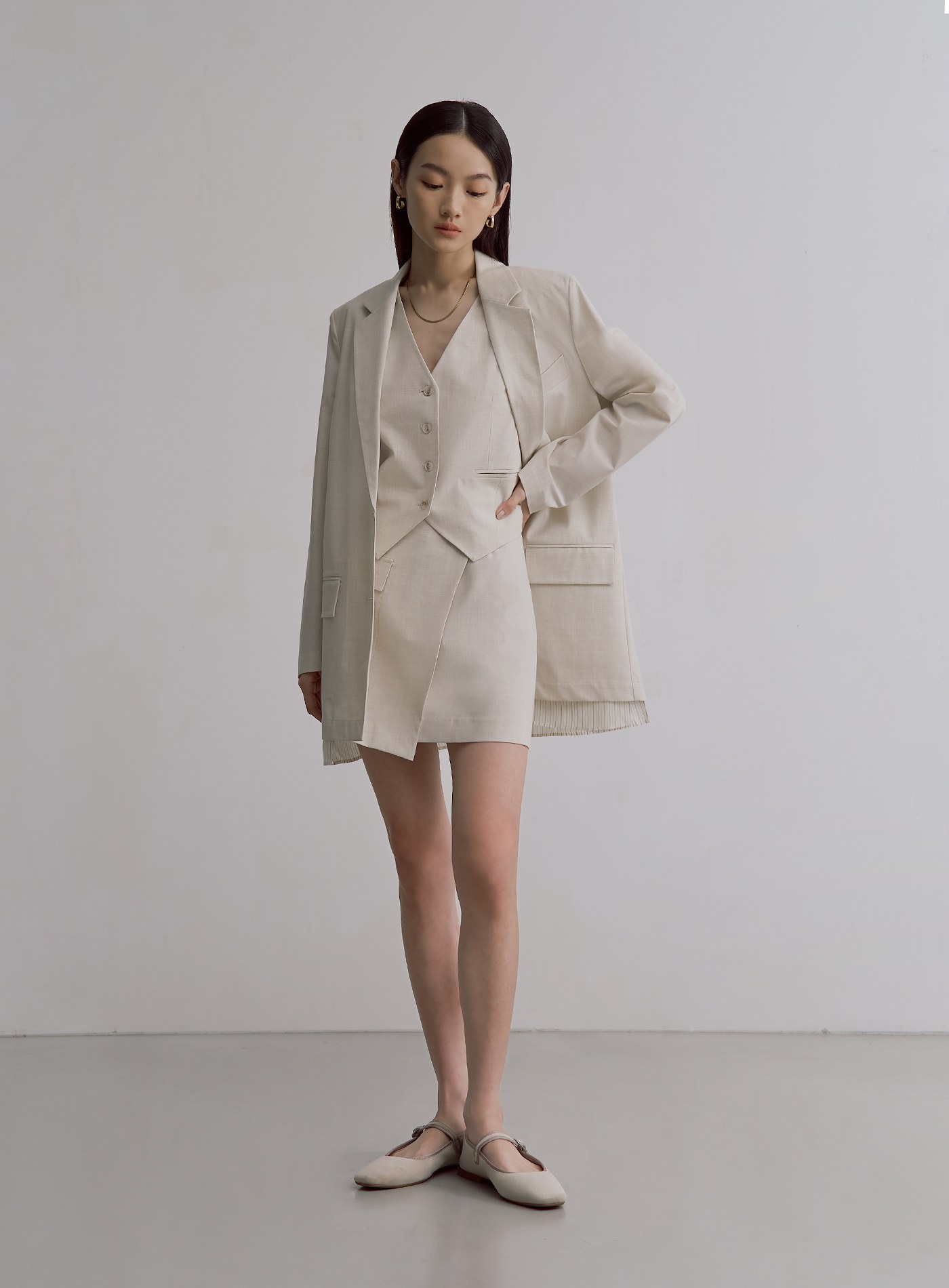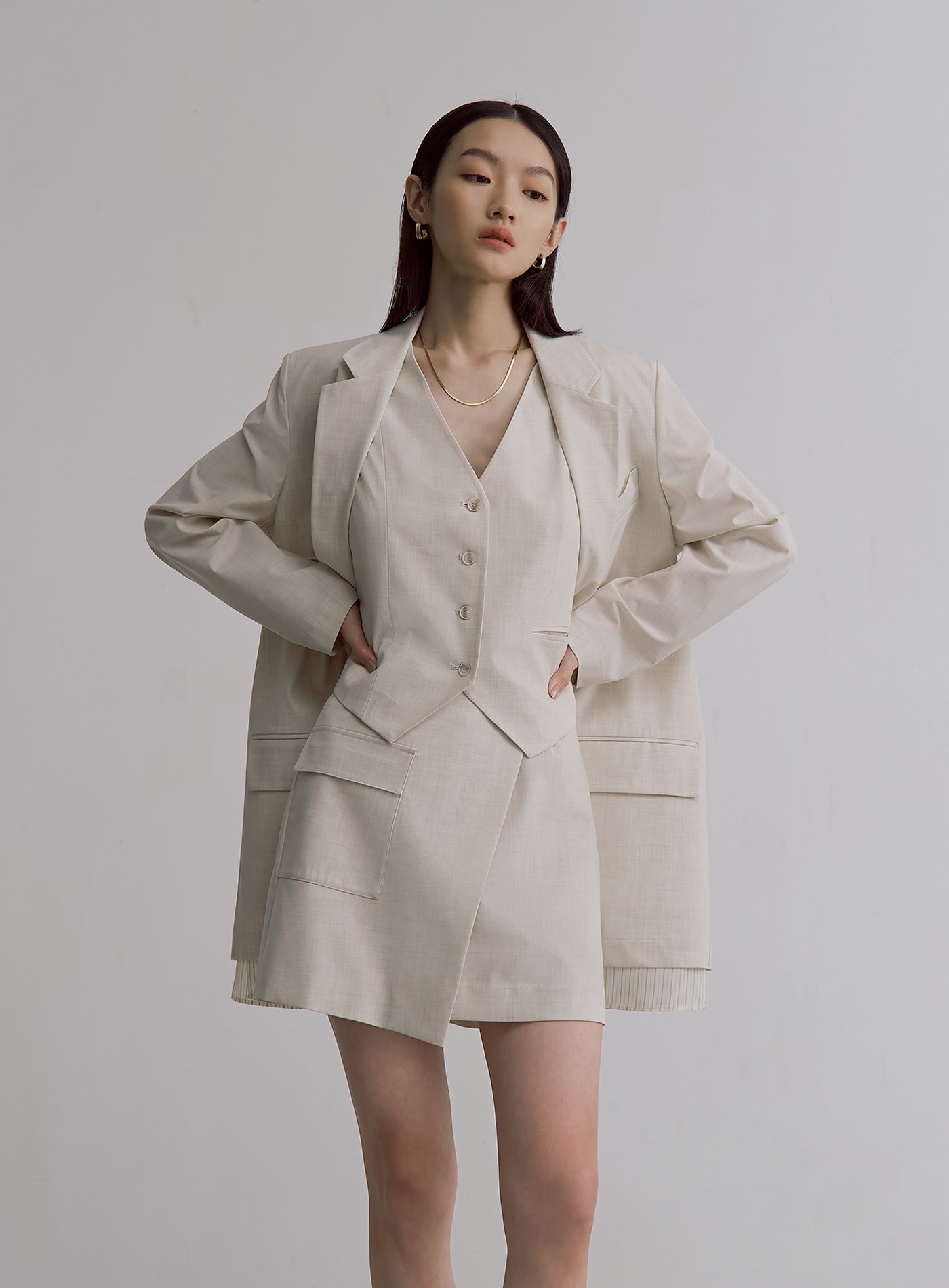 - 可與‘經典雙色織紋中性西裝背心’和‘經典雙色織紋仿兩件西裝外套’搭成套裝