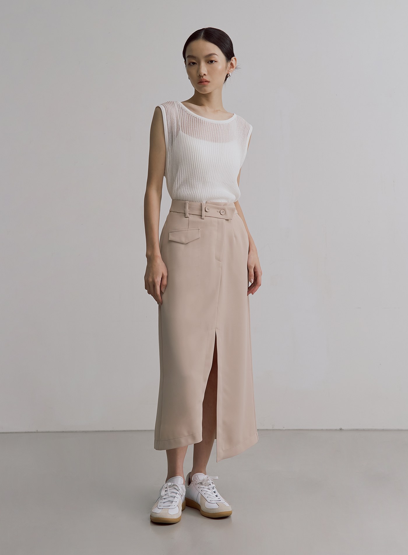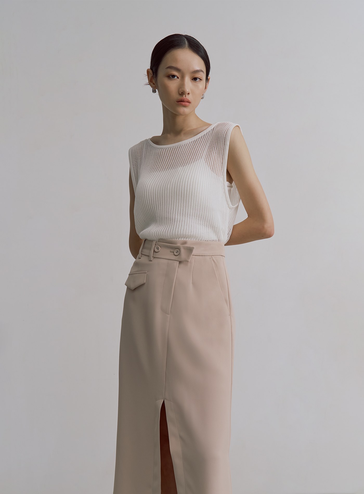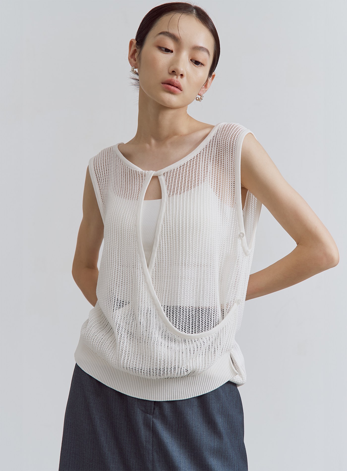- 後片交疊鏤空設計 ,側邊設有三顆小釦子,可隨意調節