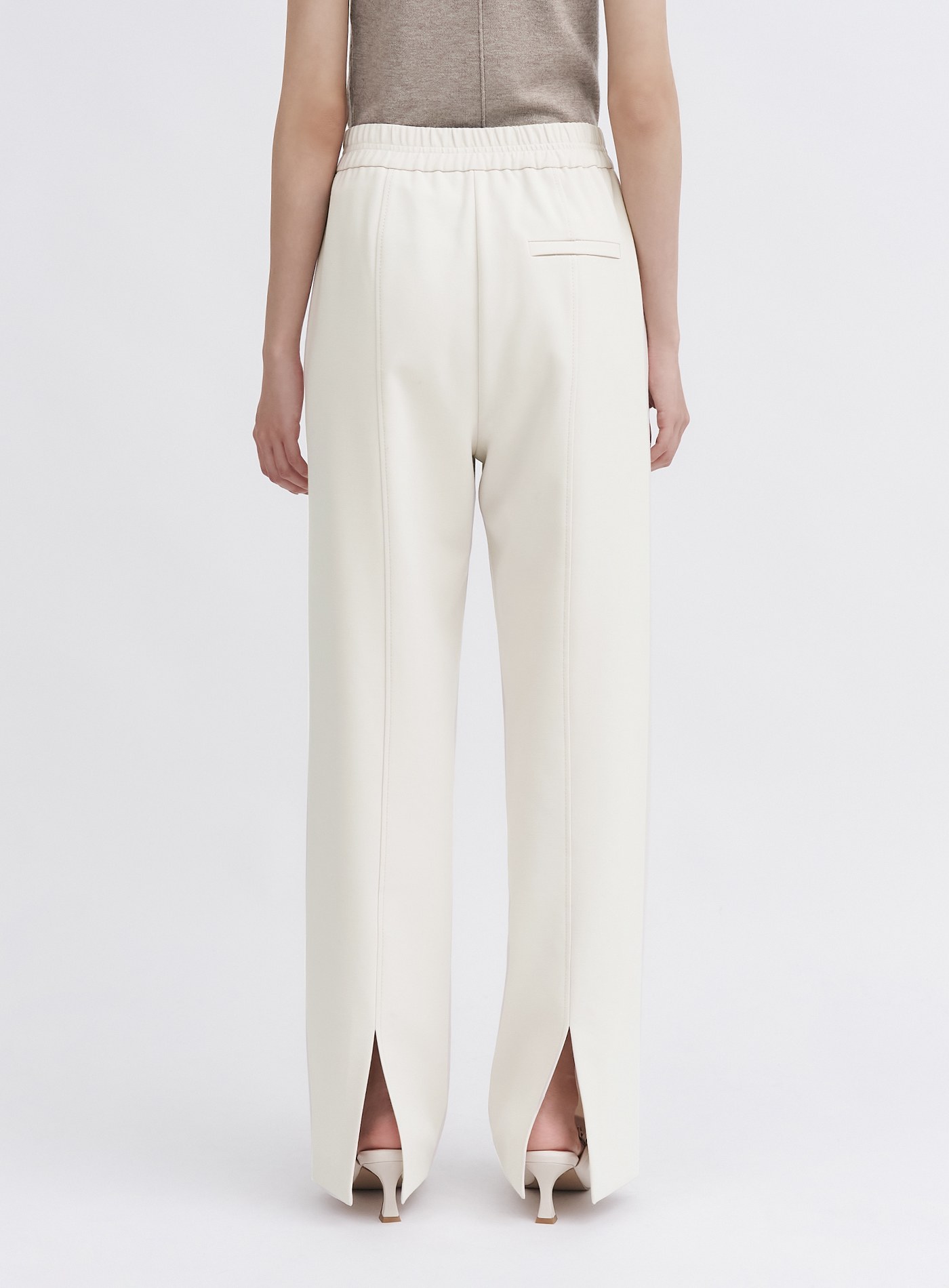 - 後中剪接壓線,褲腳開衩