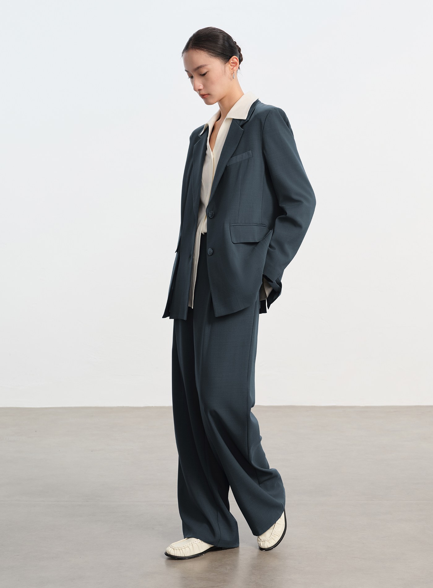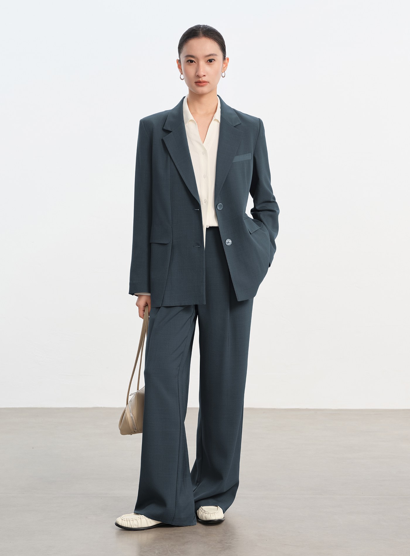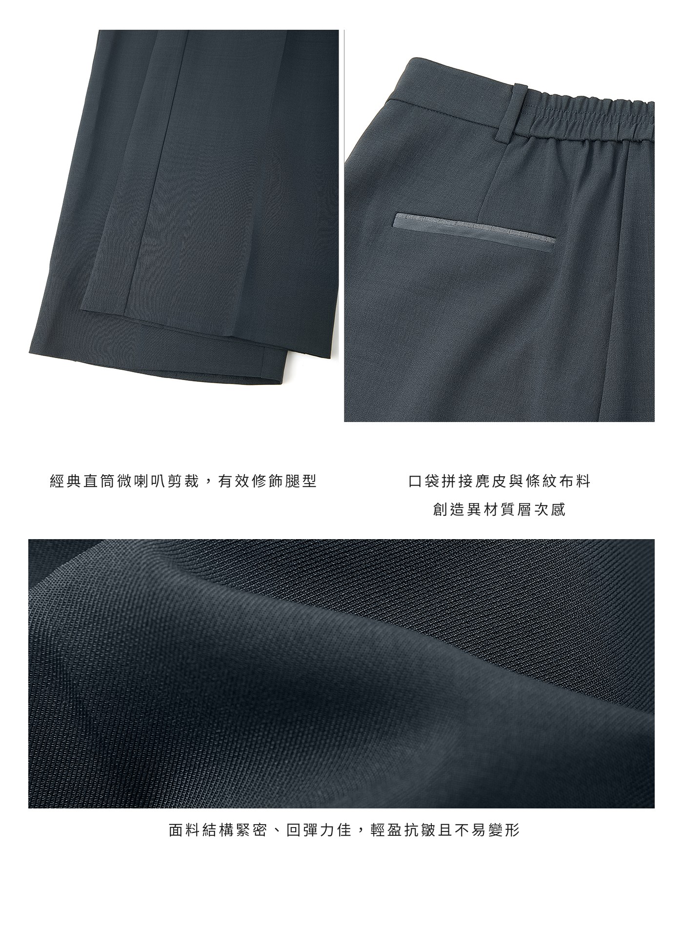 - 面料結構緊密、回彈力佳,輕盈抗皺且不易變形