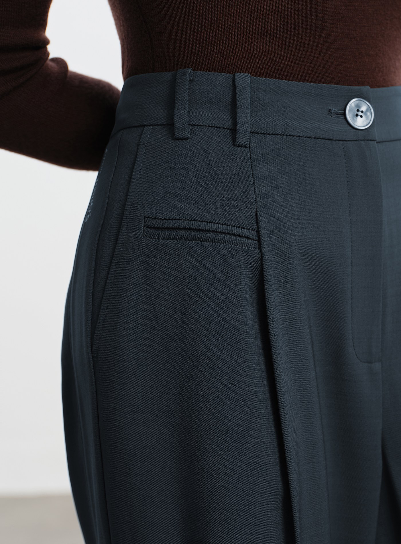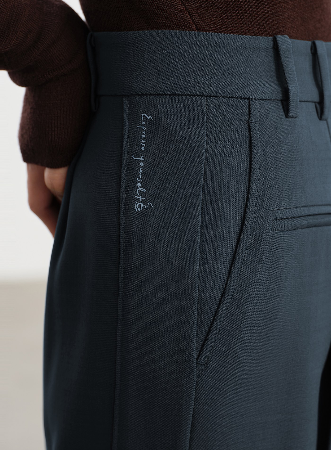- 口袋拼接麂皮與條紋布料,異材質碰撞出優雅層次