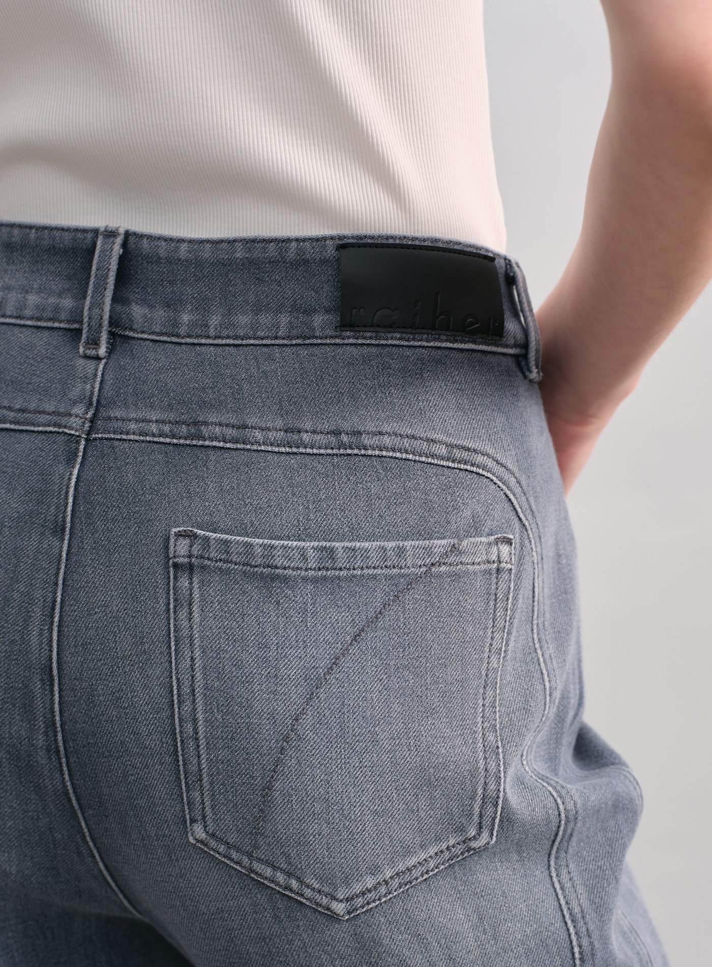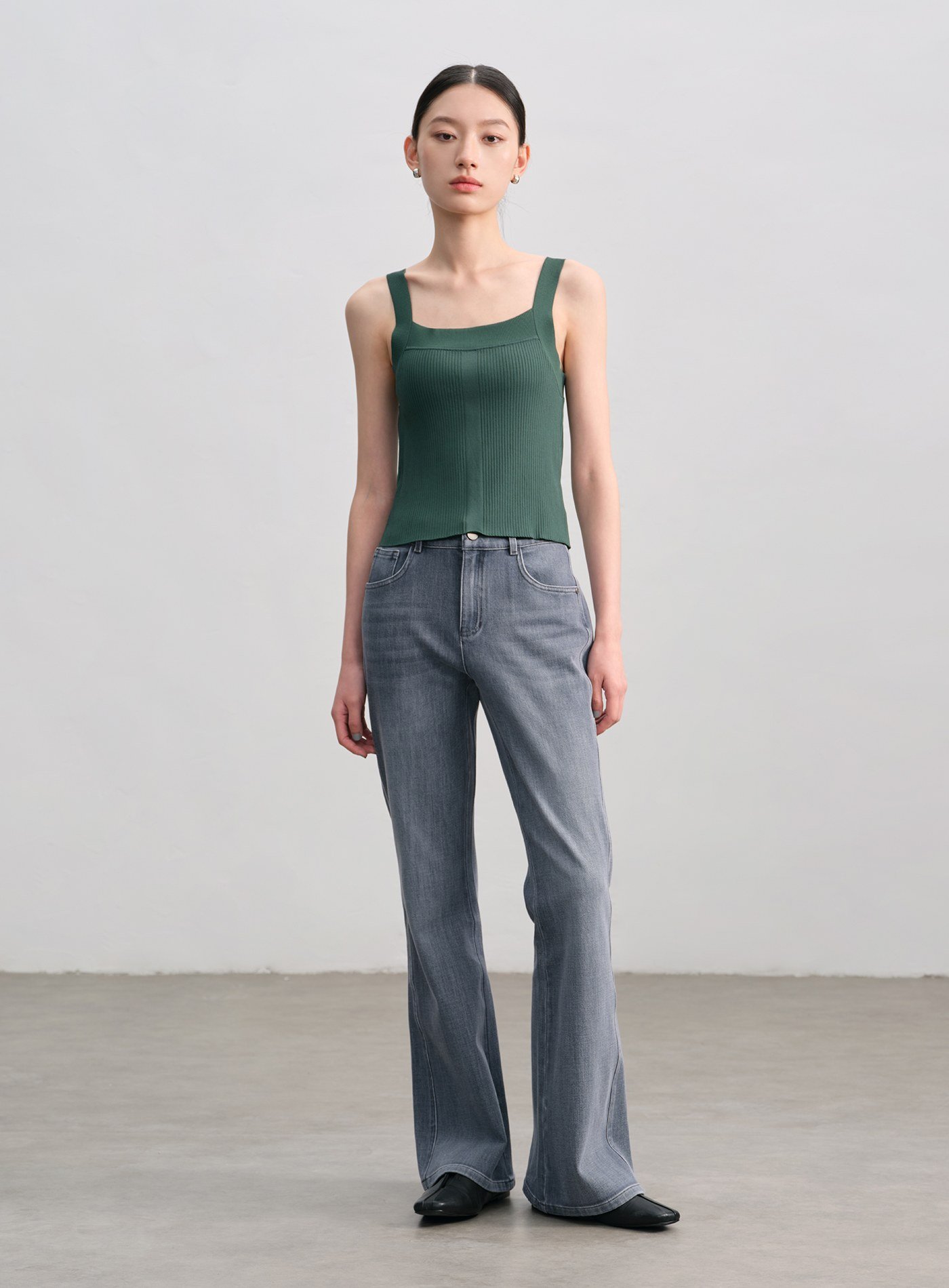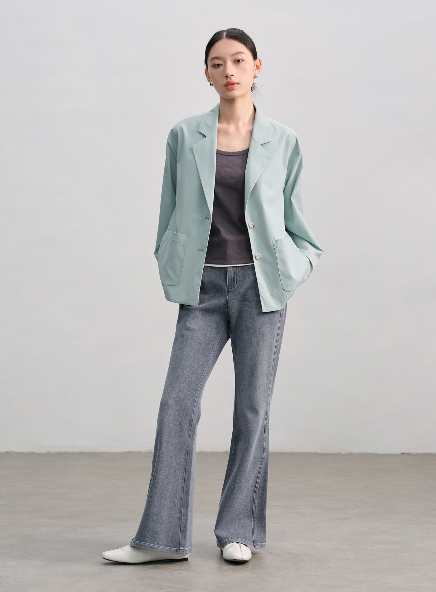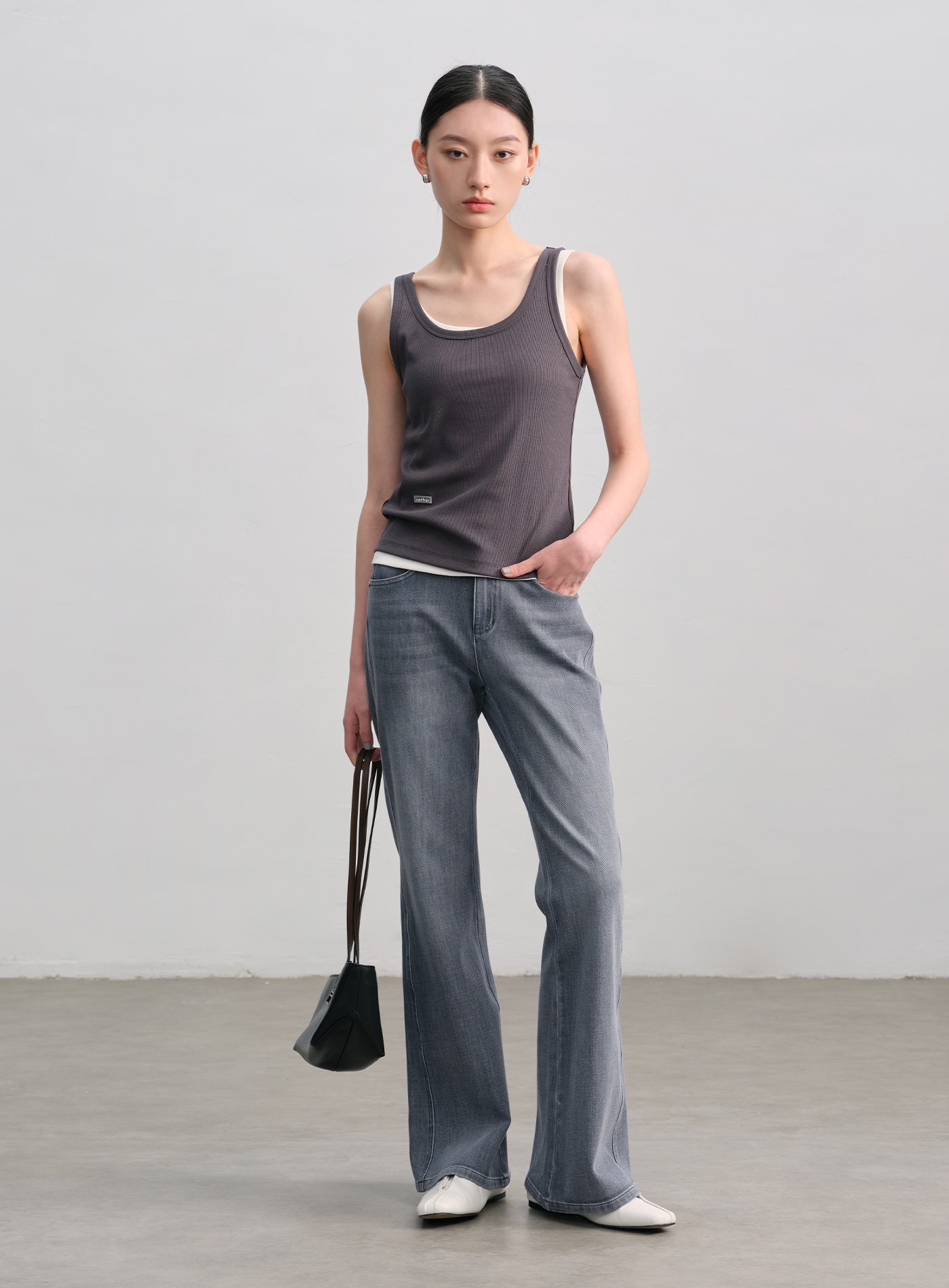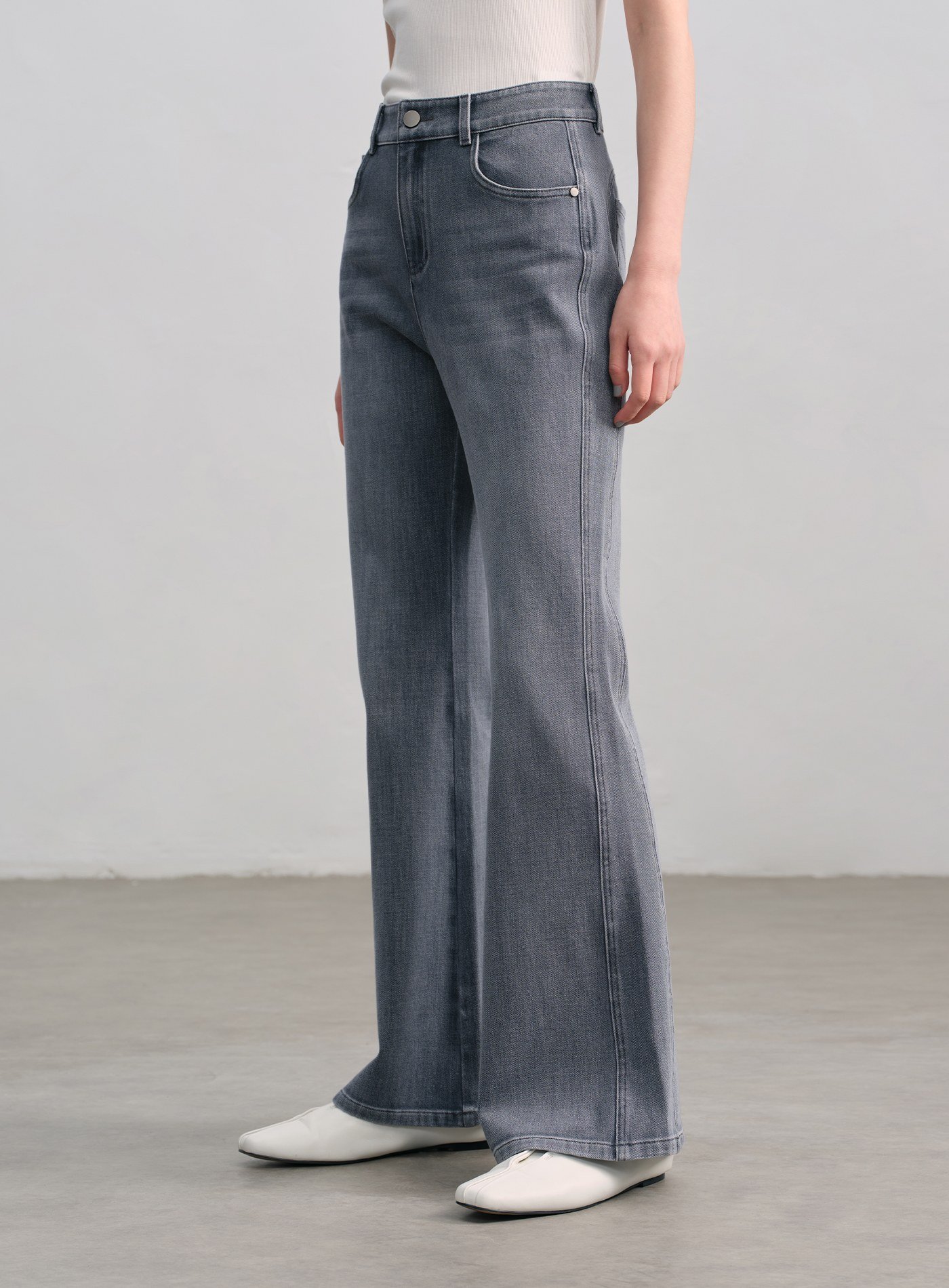 - 復古灰色喇叭褲,打造修長俐落的下身線條。