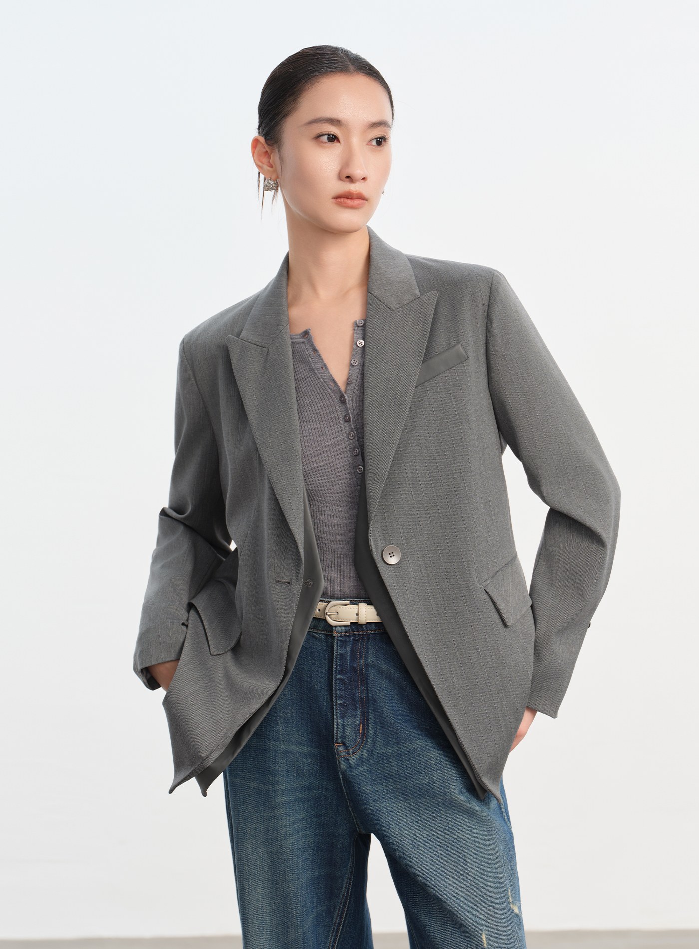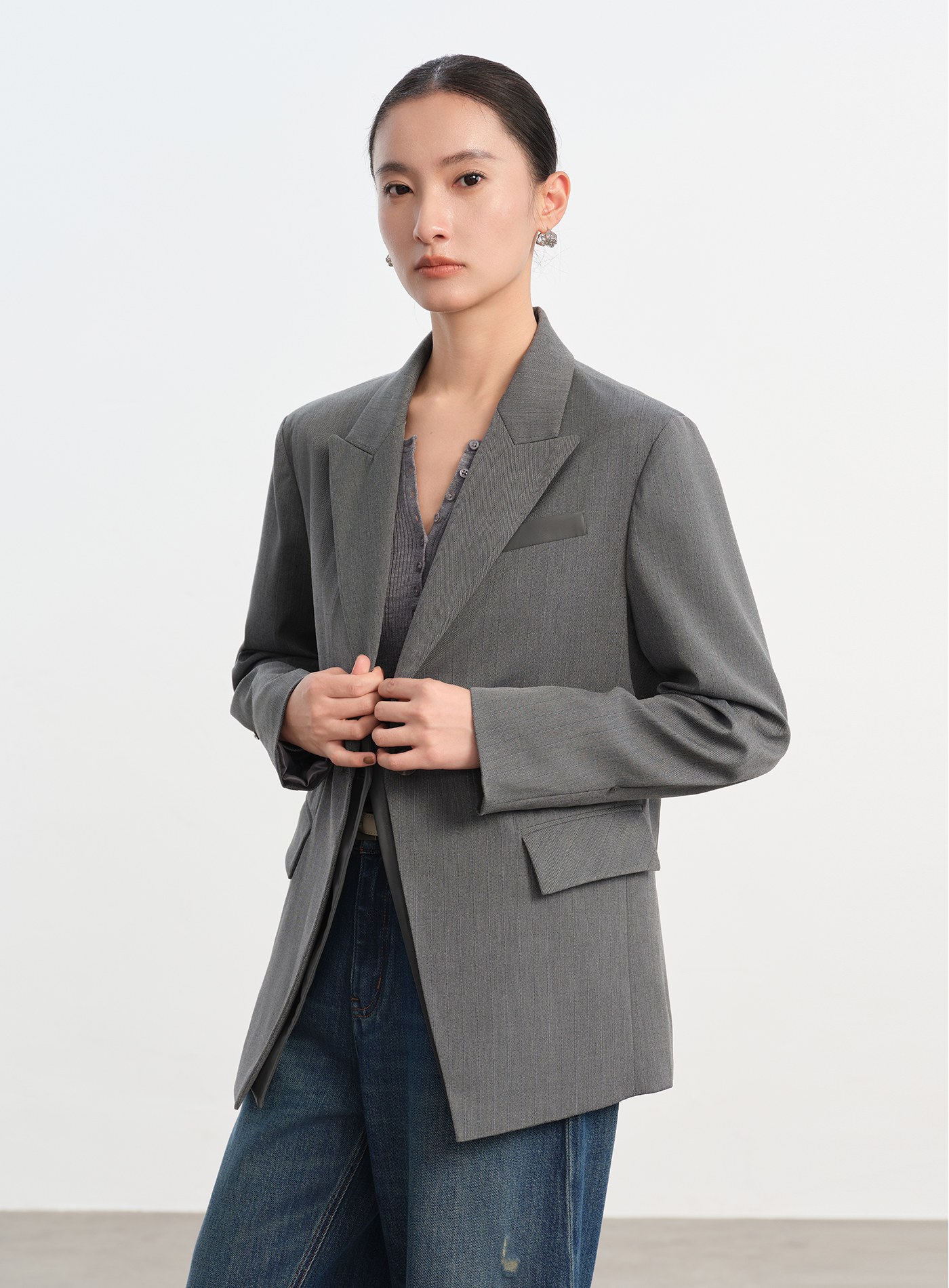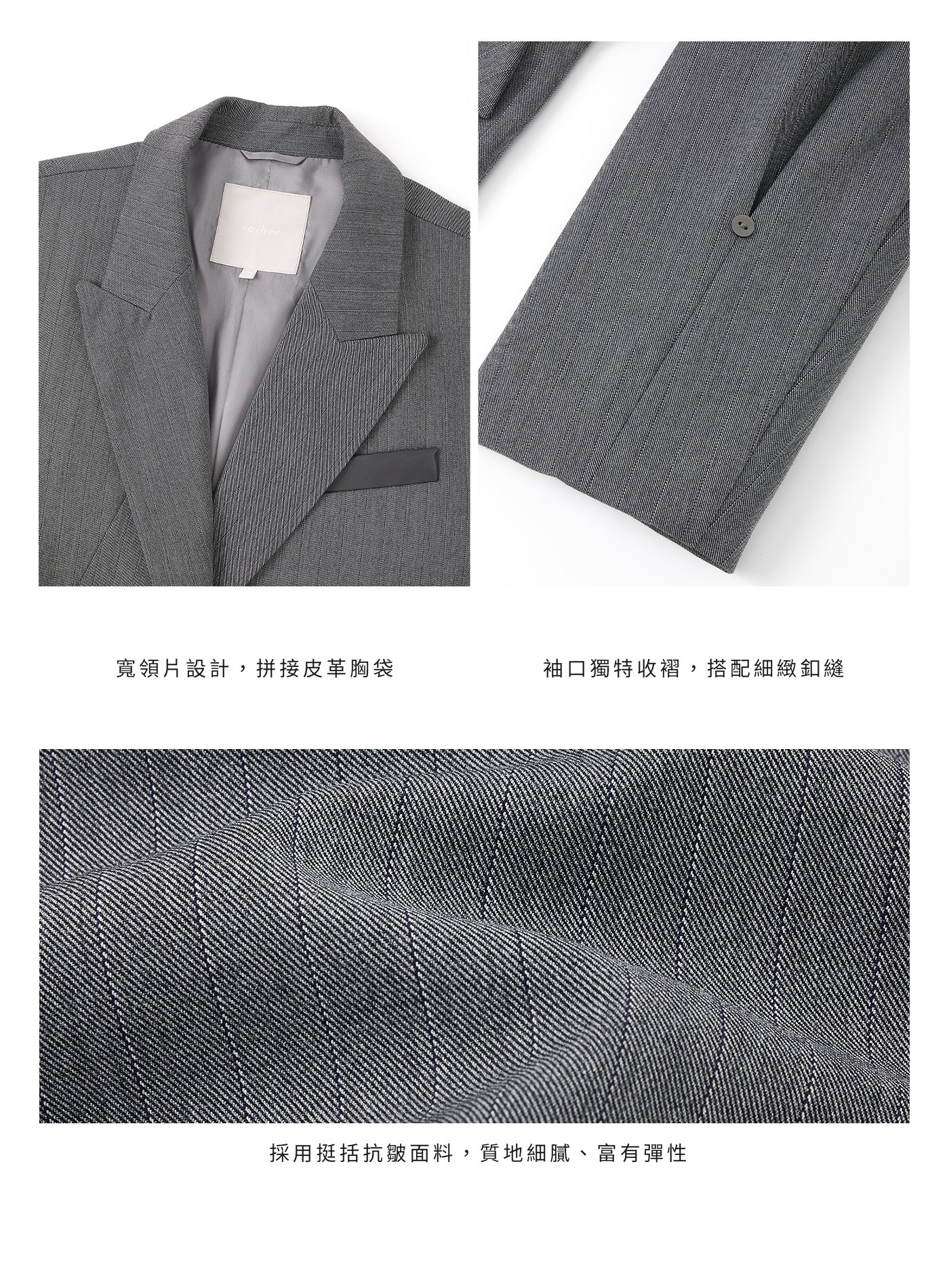 - 斜開門襟與口袋,打造俐落視覺線條