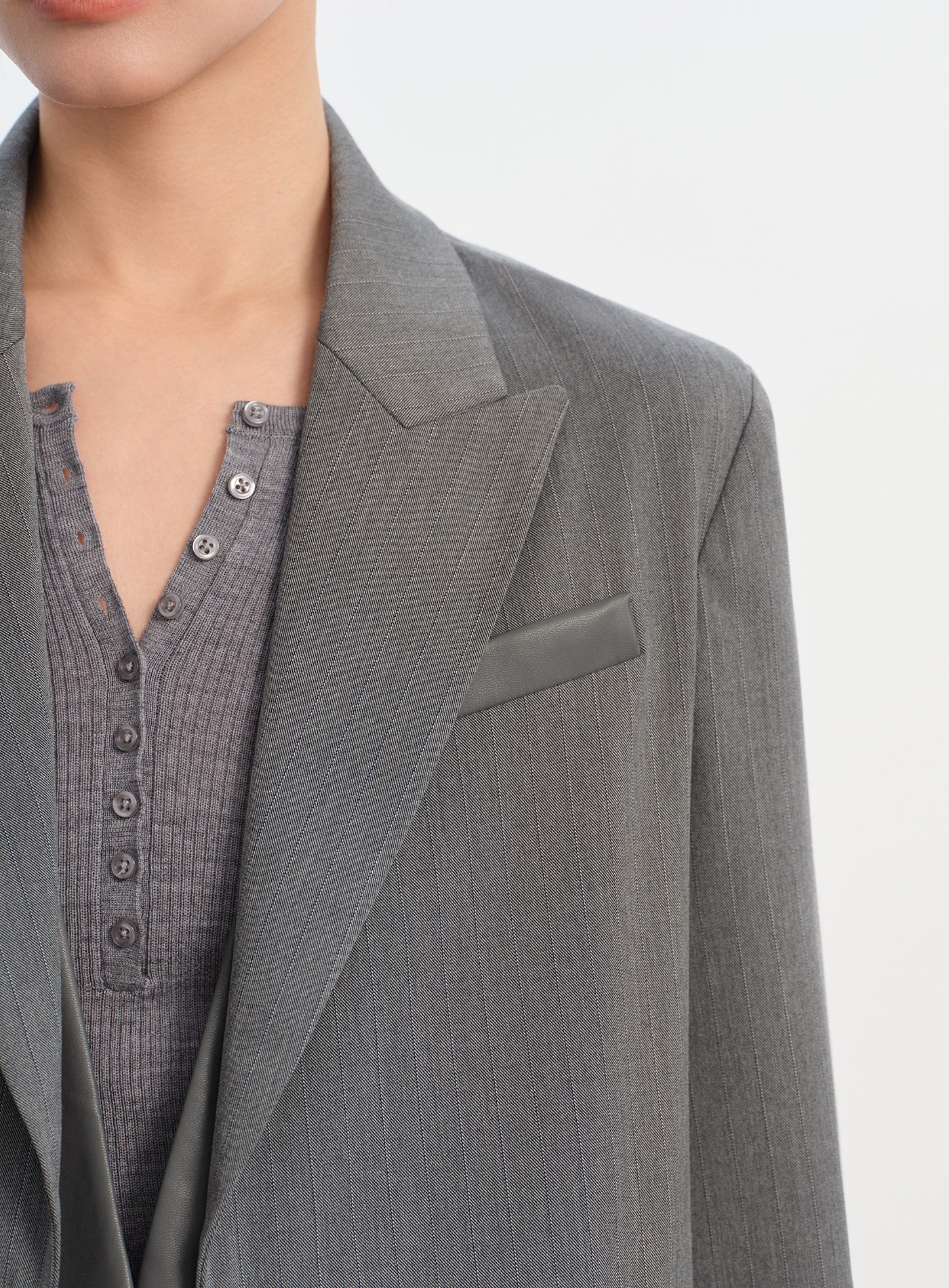 - 假兩件拼接皮革馬甲,多樣釦法增加層次感
