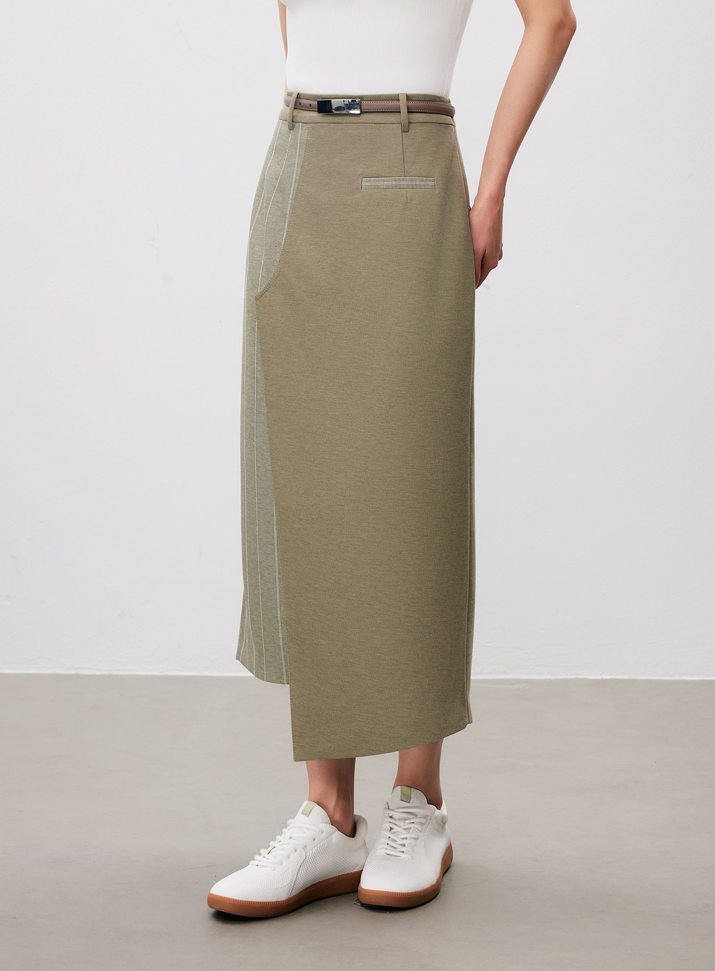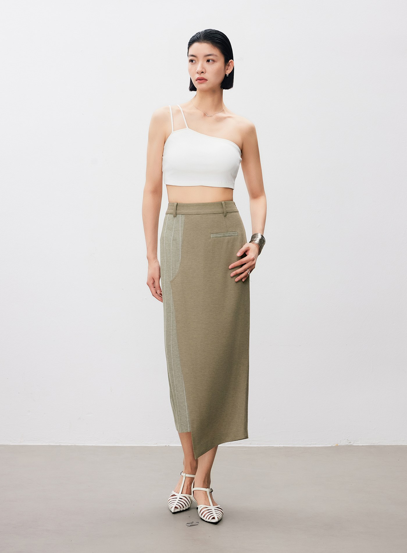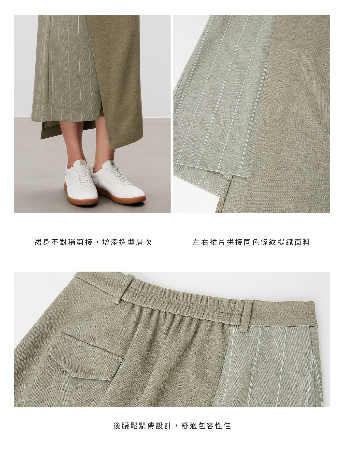 - 裙身不對稱剪接,增添造型層次