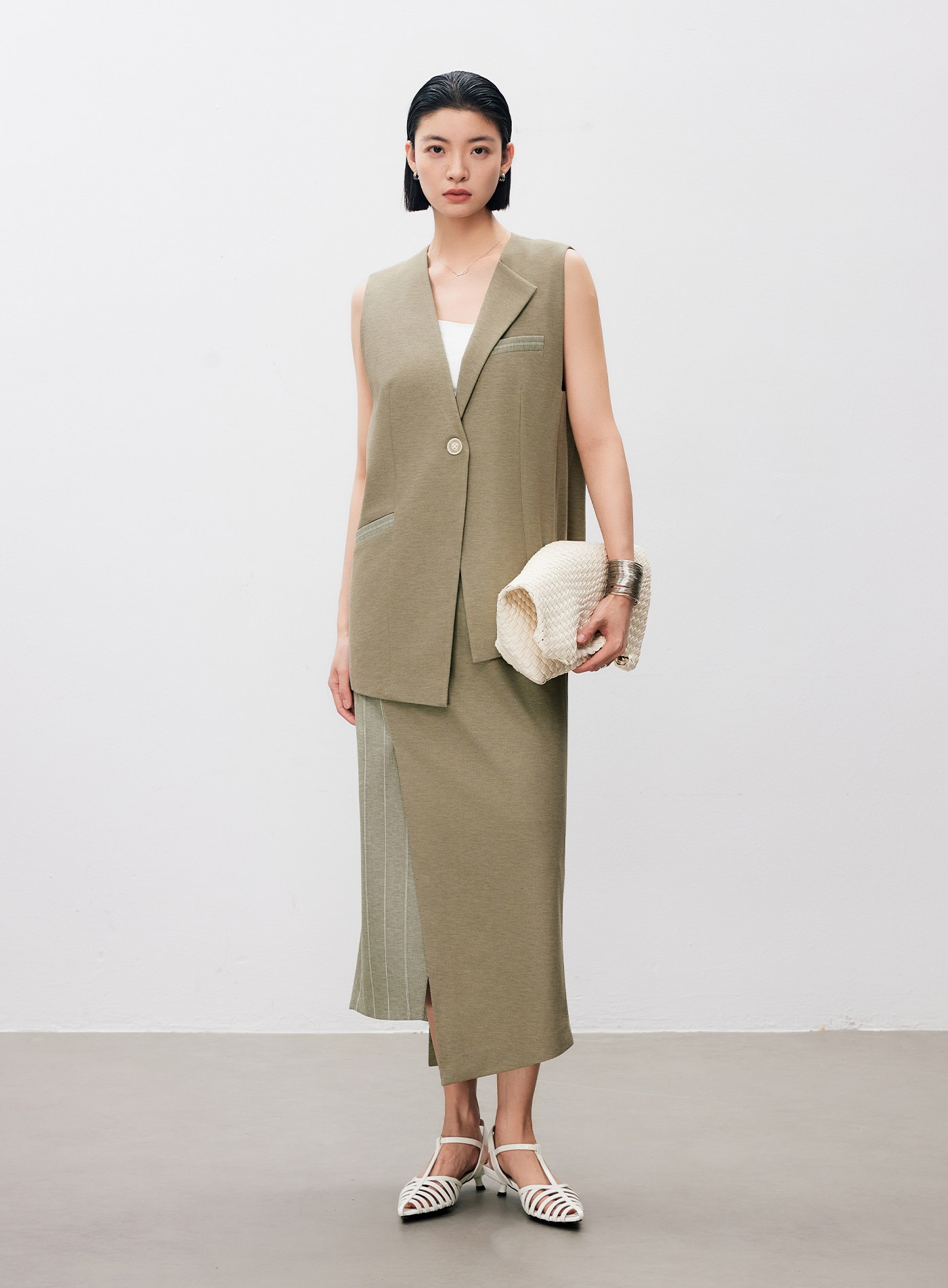 - 可與 ‘不對稱異材質拼接西裝背心’ 搭成套裝