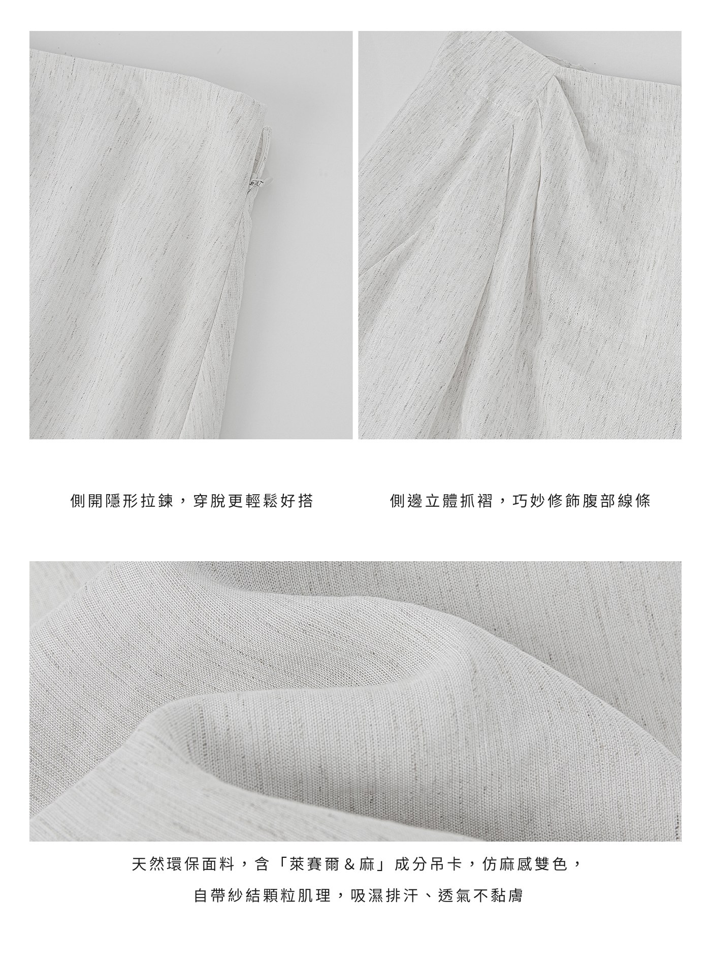 - 選用天然環保面料,含「萊賽爾&麻」成分吊卡,仿麻感雙色,自帶紗結顆粒肌理,吸濕排汗、透氣不黏膚