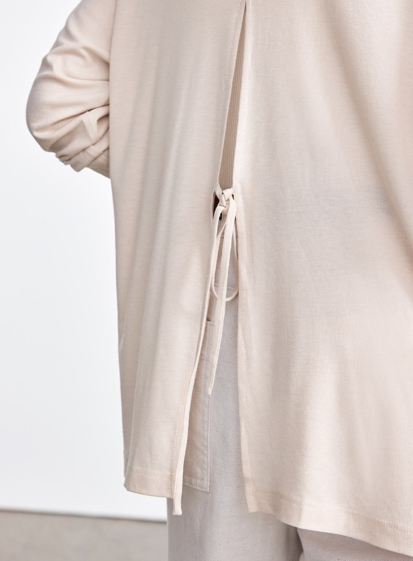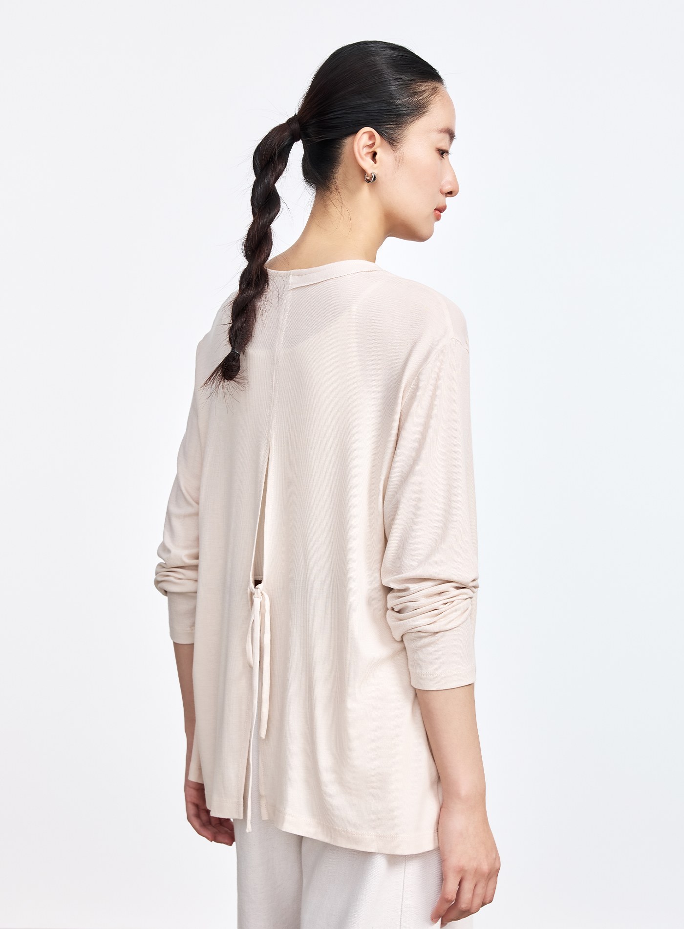 - 後背高開衩搭綁帶設計