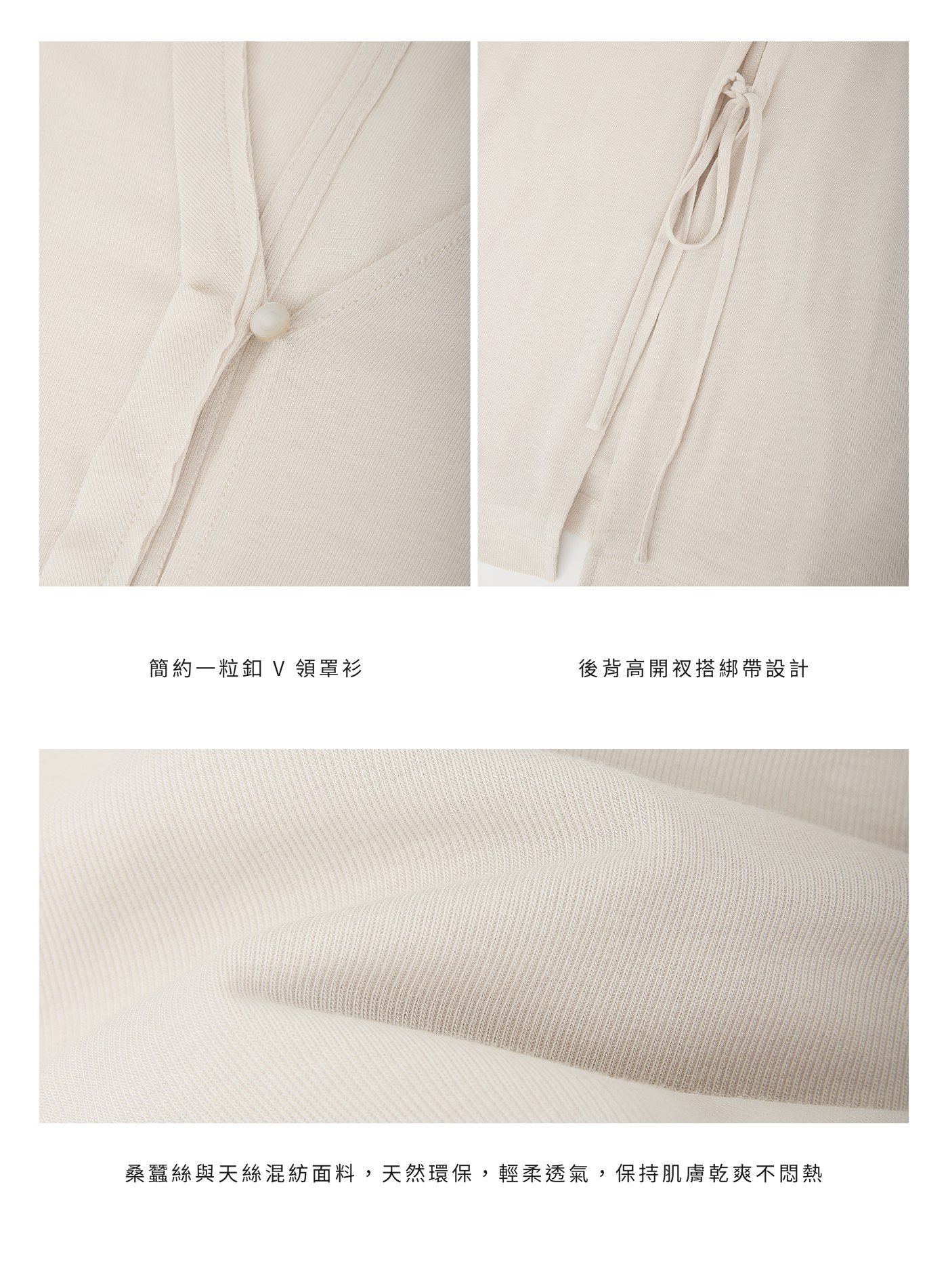- 桑蠶絲與天絲混紡面料,天然環保,輕柔透氣,保持肌膚乾爽不悶熱,冷氣房穿著也舒適