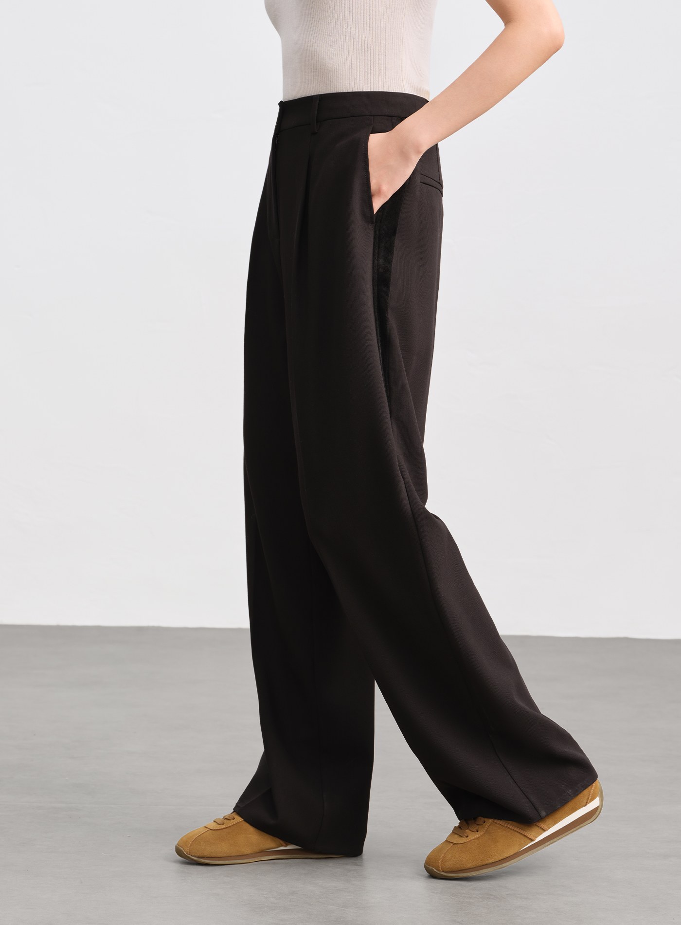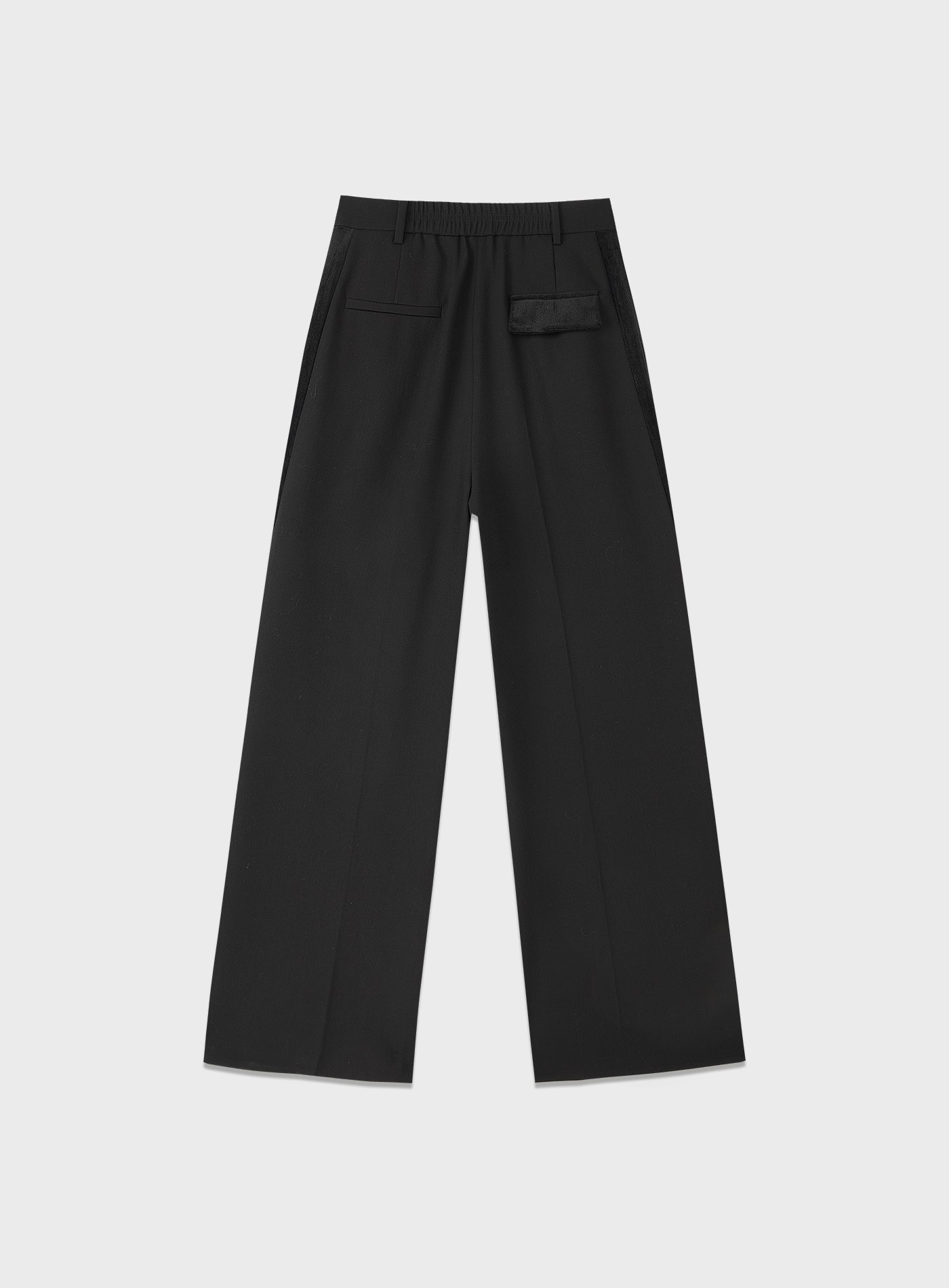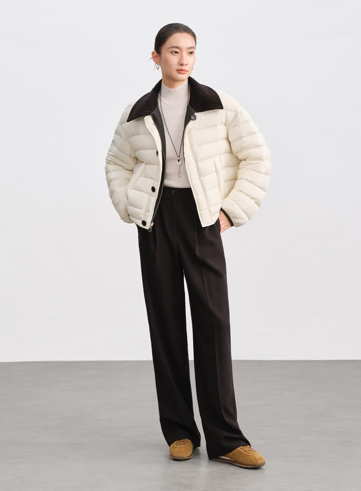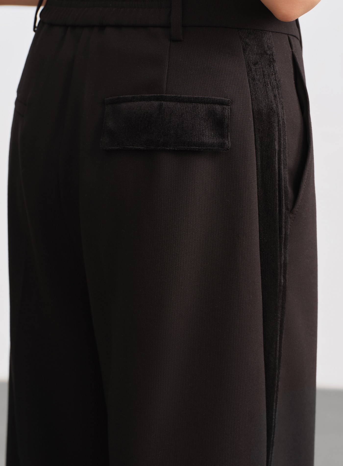 - 褲身前後片採用斜向裁剪,以短絨坑條絨素材拼接,自然修飾腿型