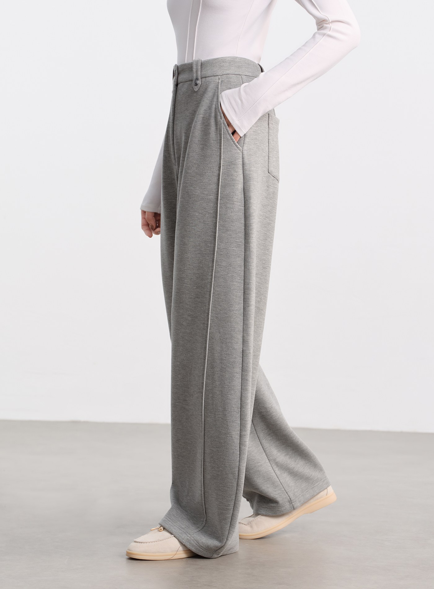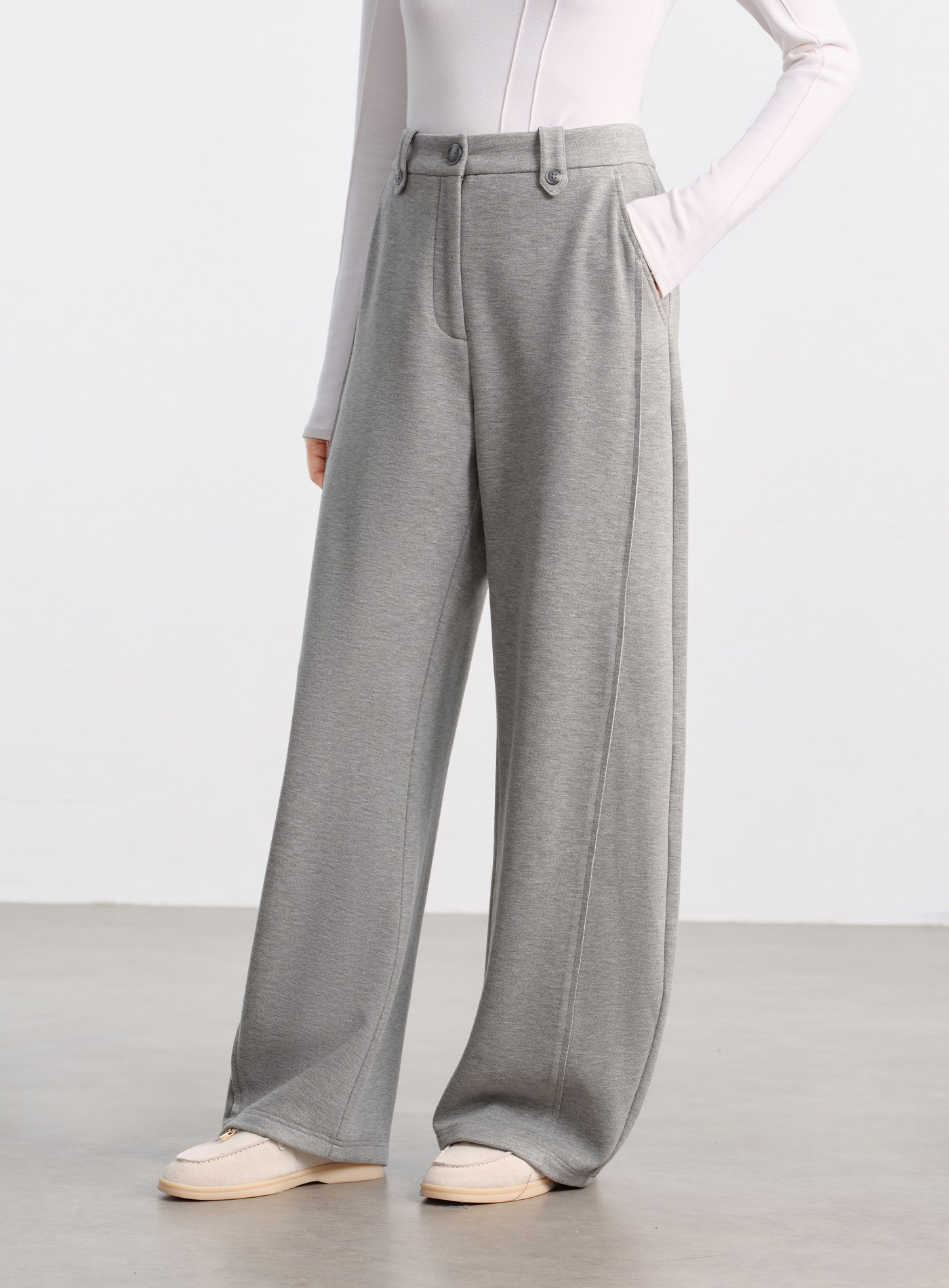 - 褲腳的疊縫毛邊與明線工藝,為簡潔的版型增添個性感;兩側加寬腰耳與調節紐帶,讓腰頭貼合度更精準