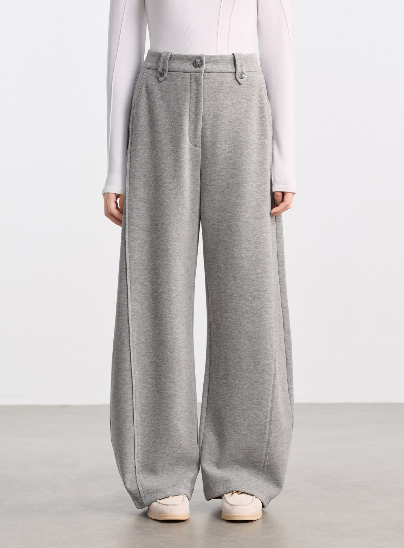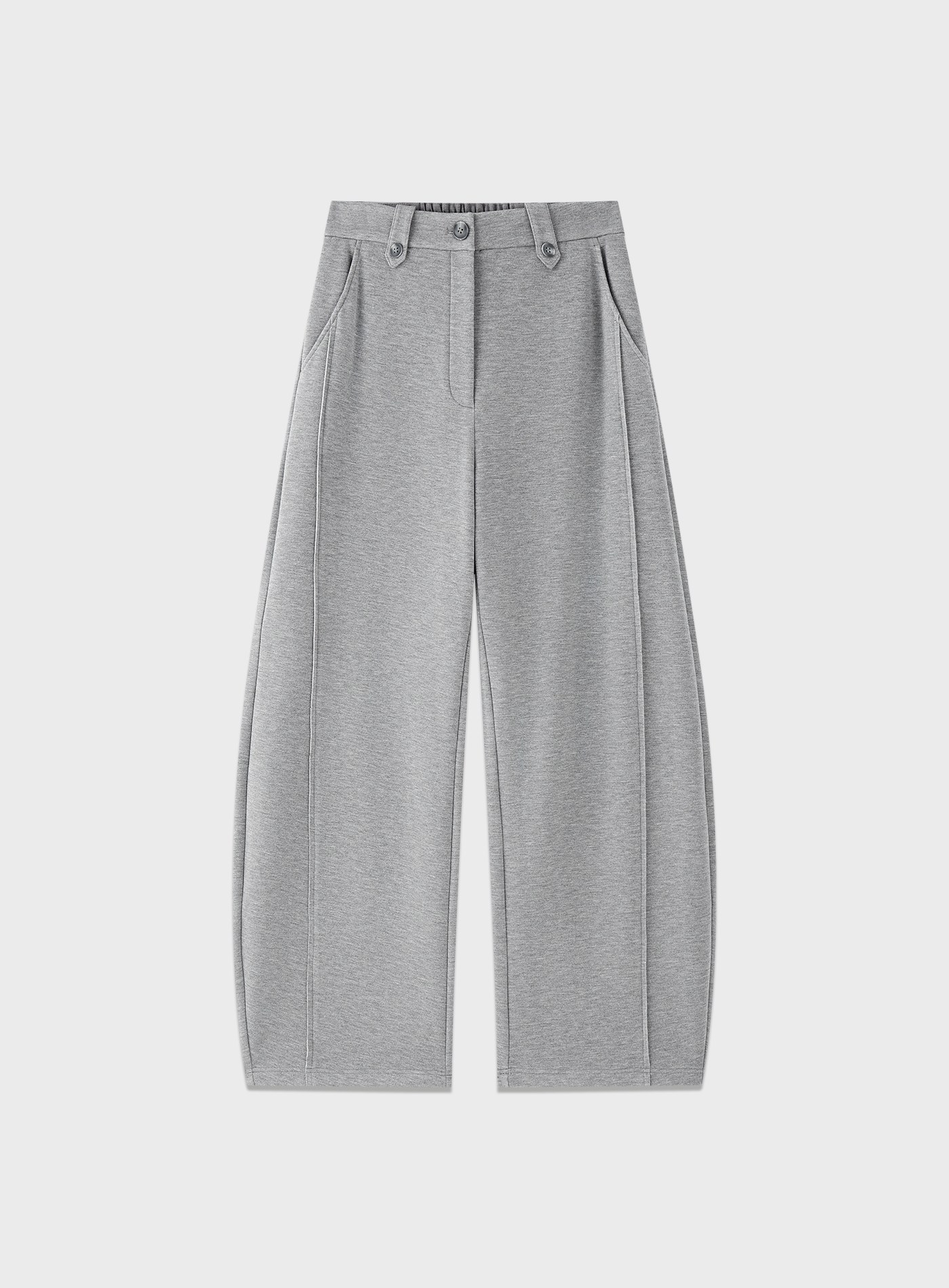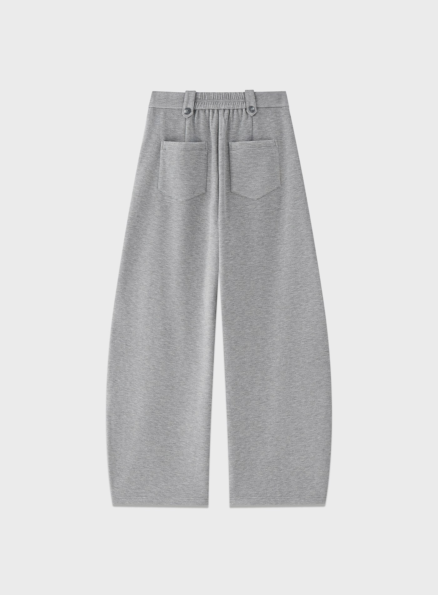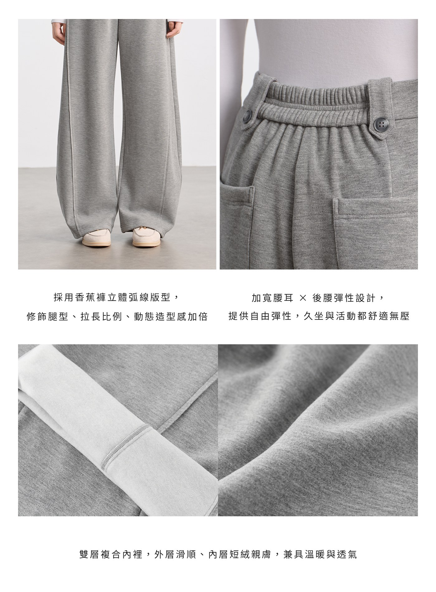 - 以香蕉褲版型演繹休閒褲輪廓,大腿處保留舒適的份量感,褲管向腳踝自然收束,形成立體的流線弧形