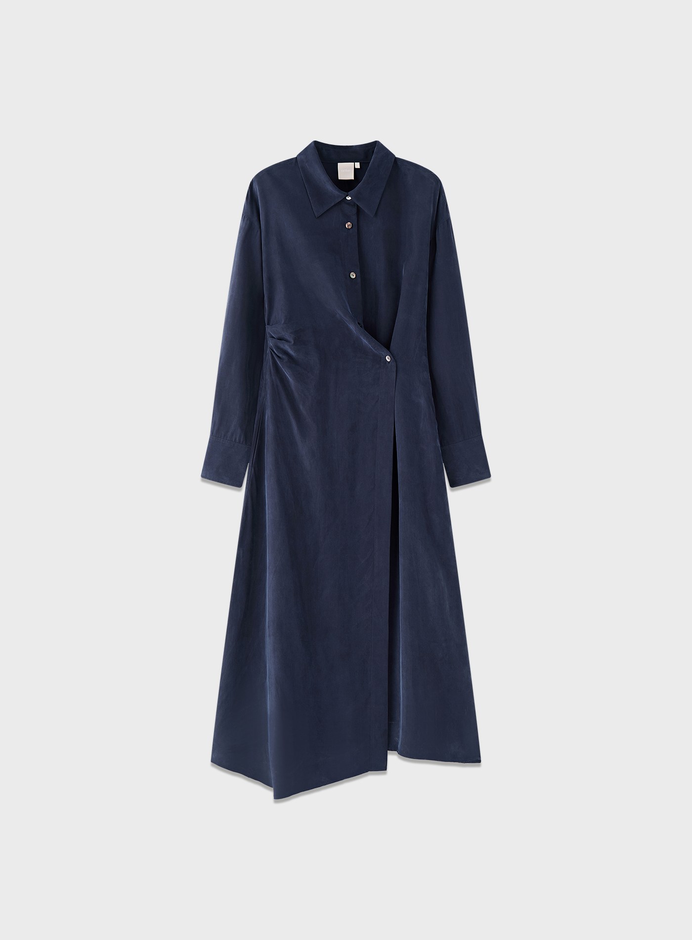 - 透過斜釦與可調節腰絆,可穿成收腰斜擺連身裙,也可打開當成直排釦長襯衫外套