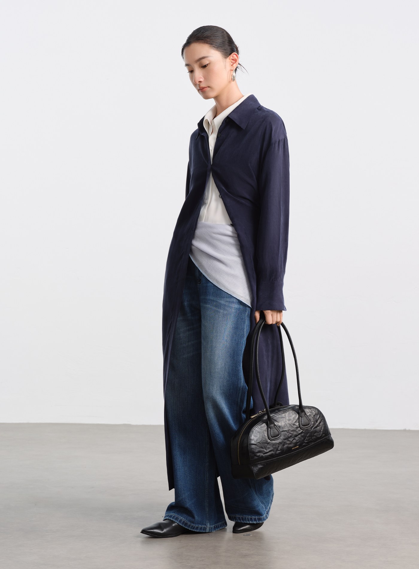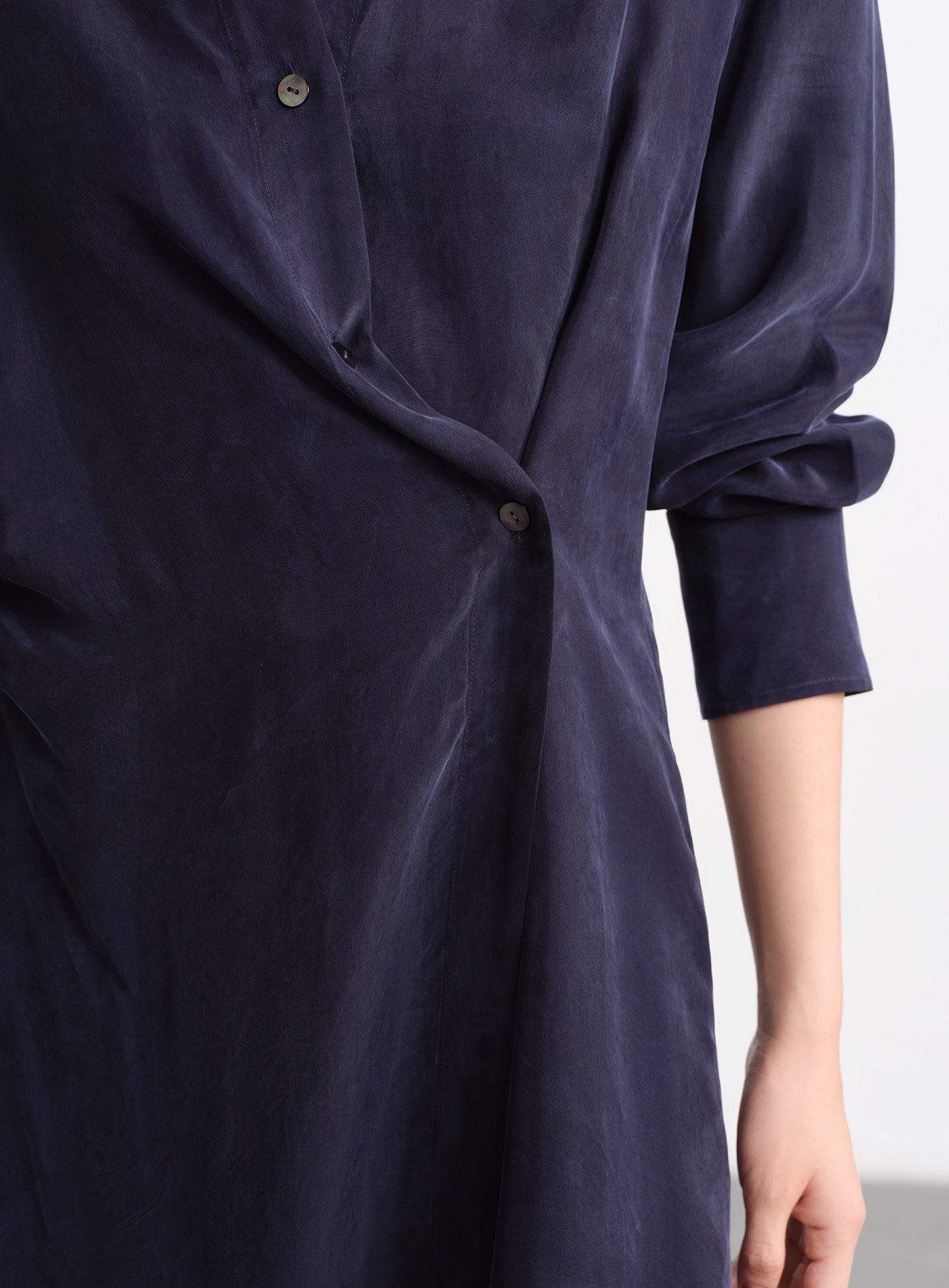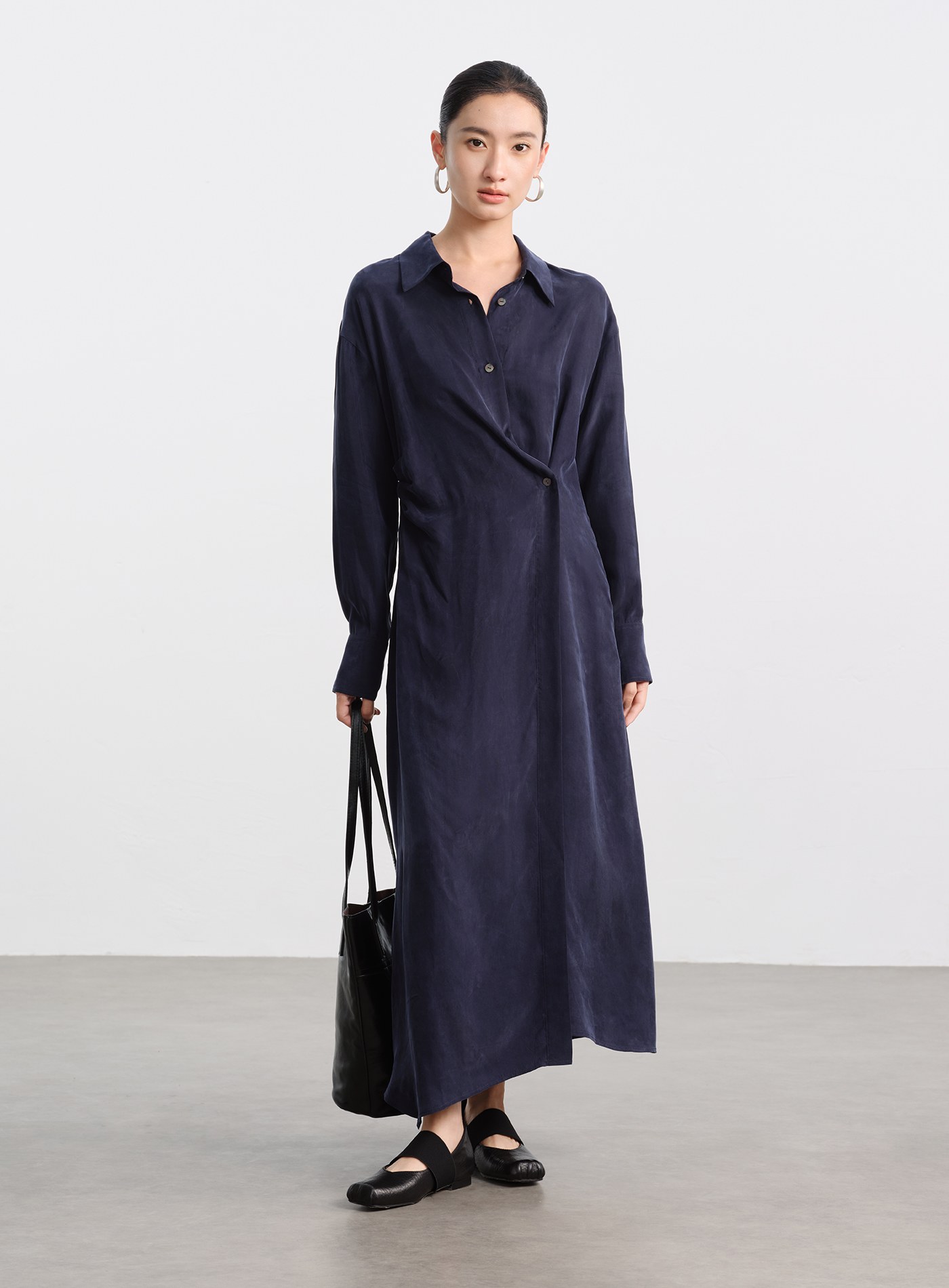 - 材質選用銅氨混紡砂洗布料,帶著細膩霧面與絲滑觸感,垂墜線條乾淨利落,不易皺、透氣、親膚
