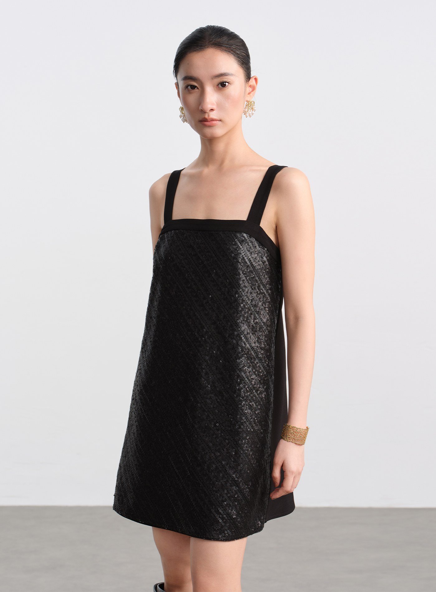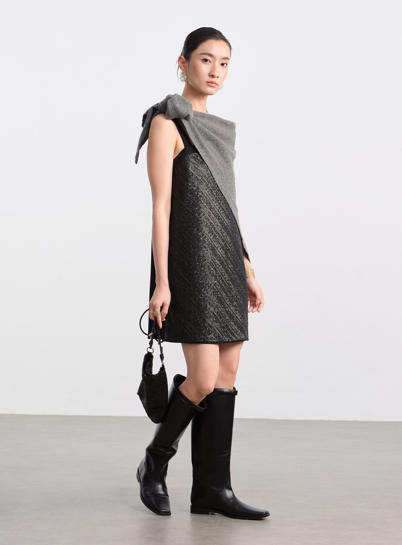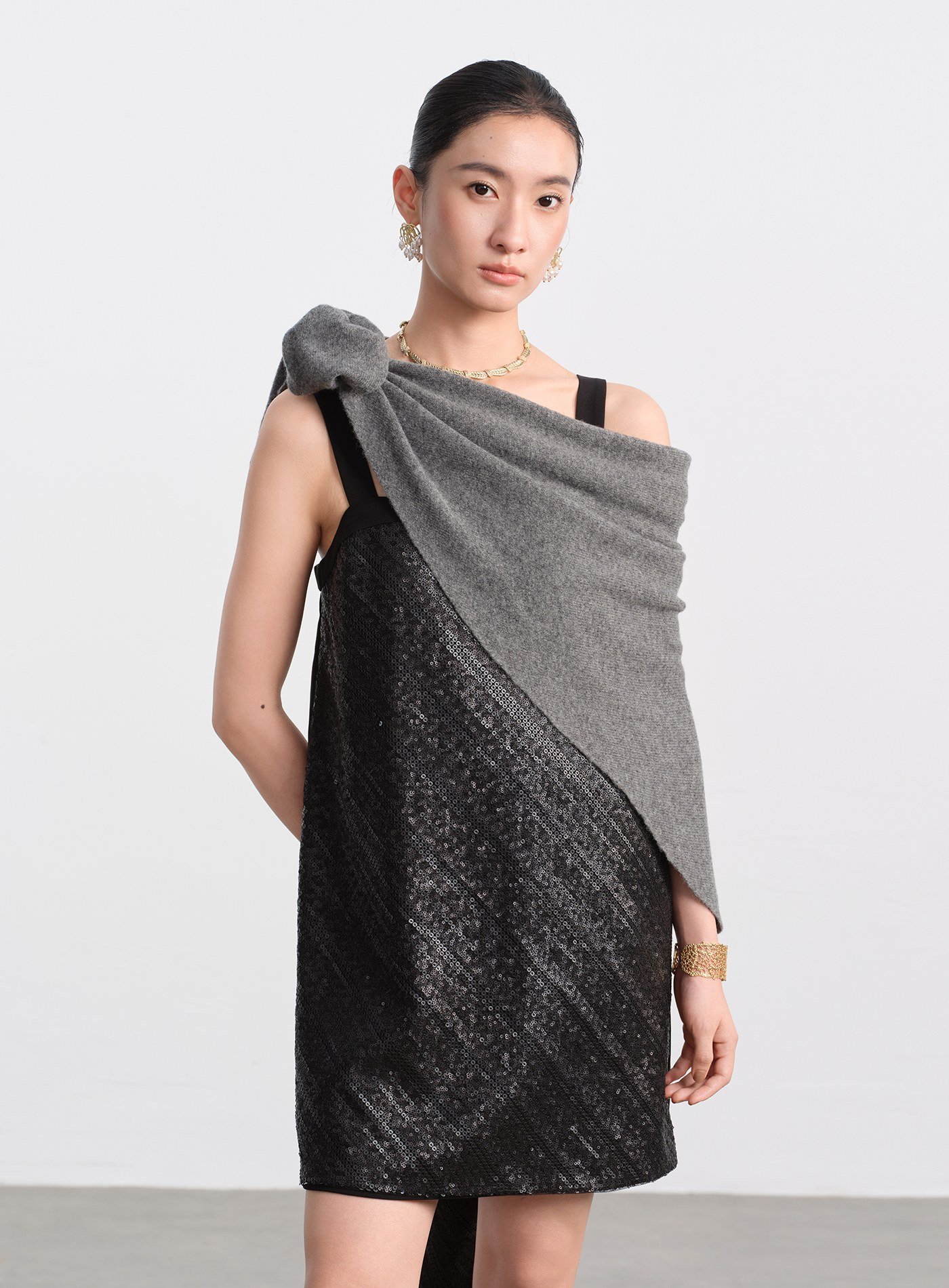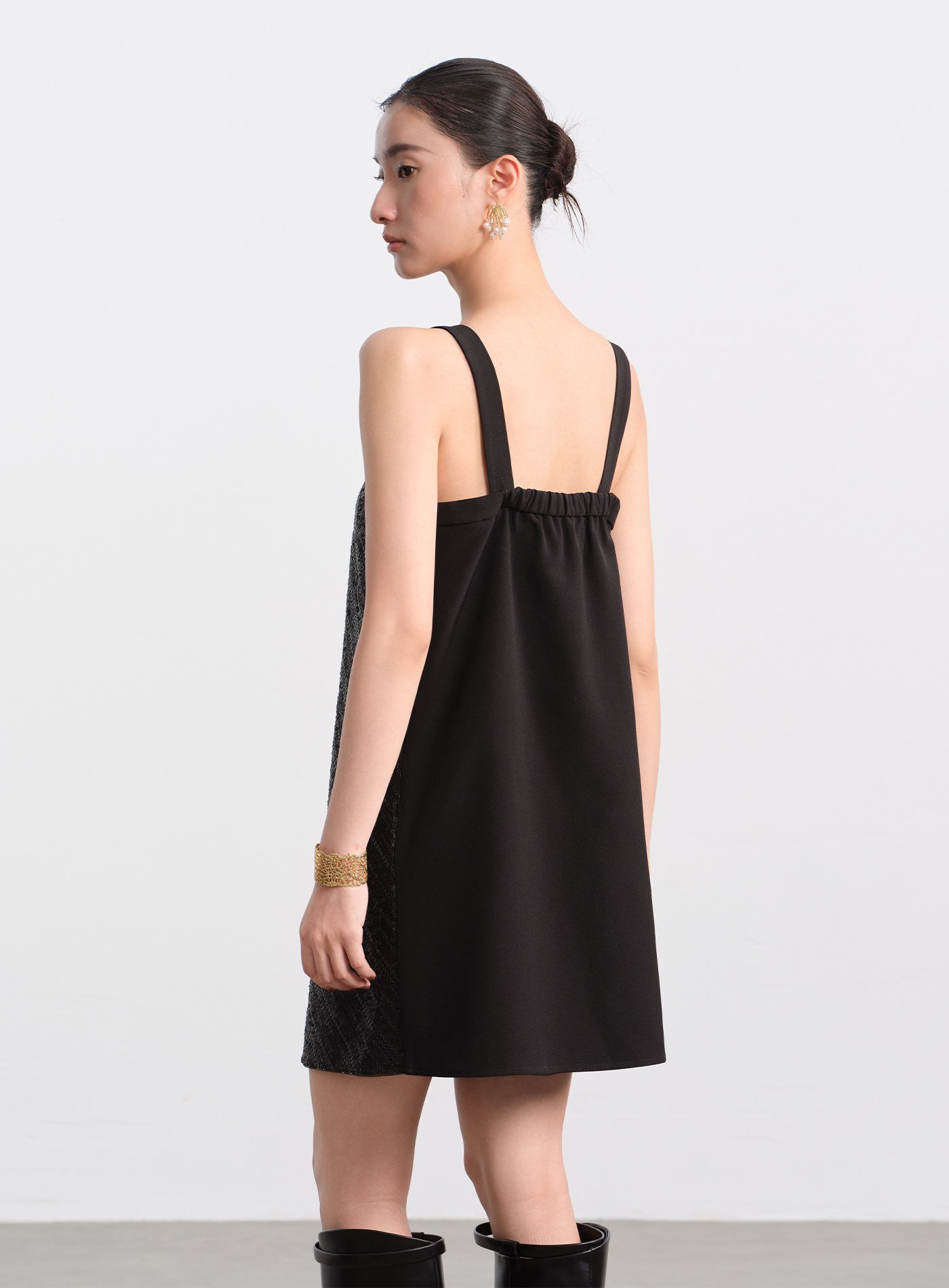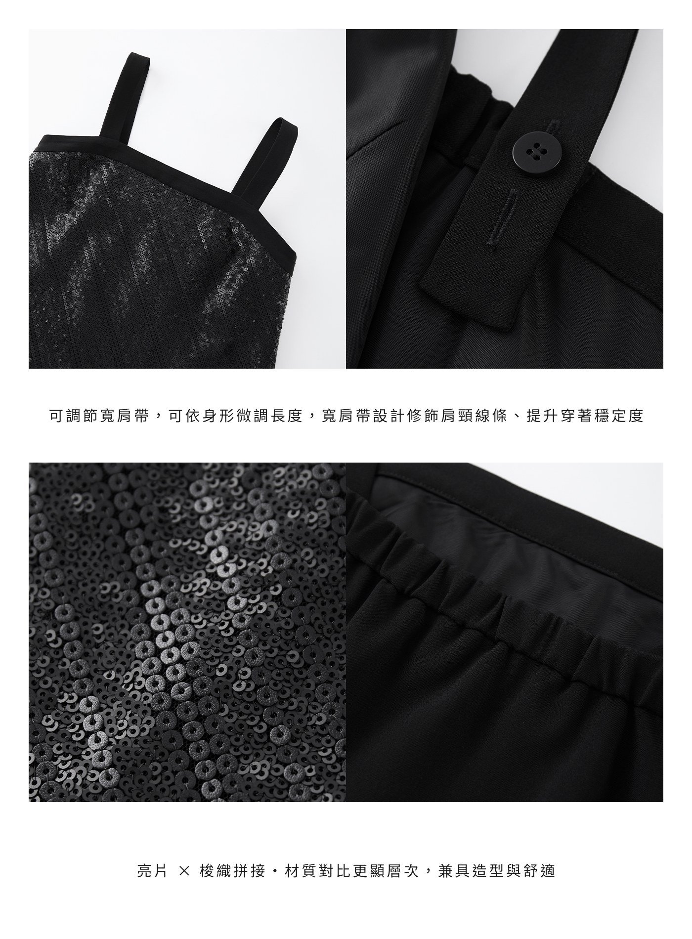- 前片採用立體亮片刺繡布料,光線下呈現細緻閃爍;後片以素色梭織布料拼接,形成華麗與素雅對比,減輕整體重量,造型更俐落