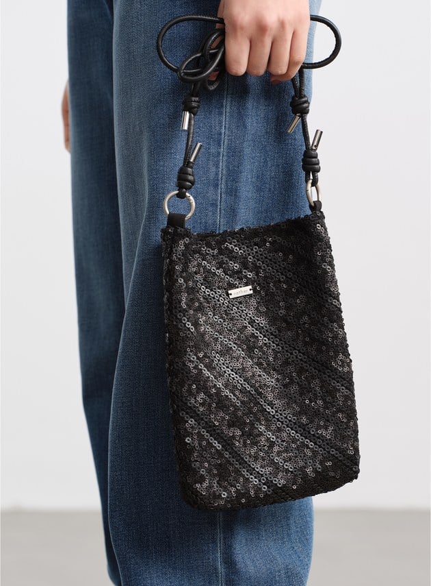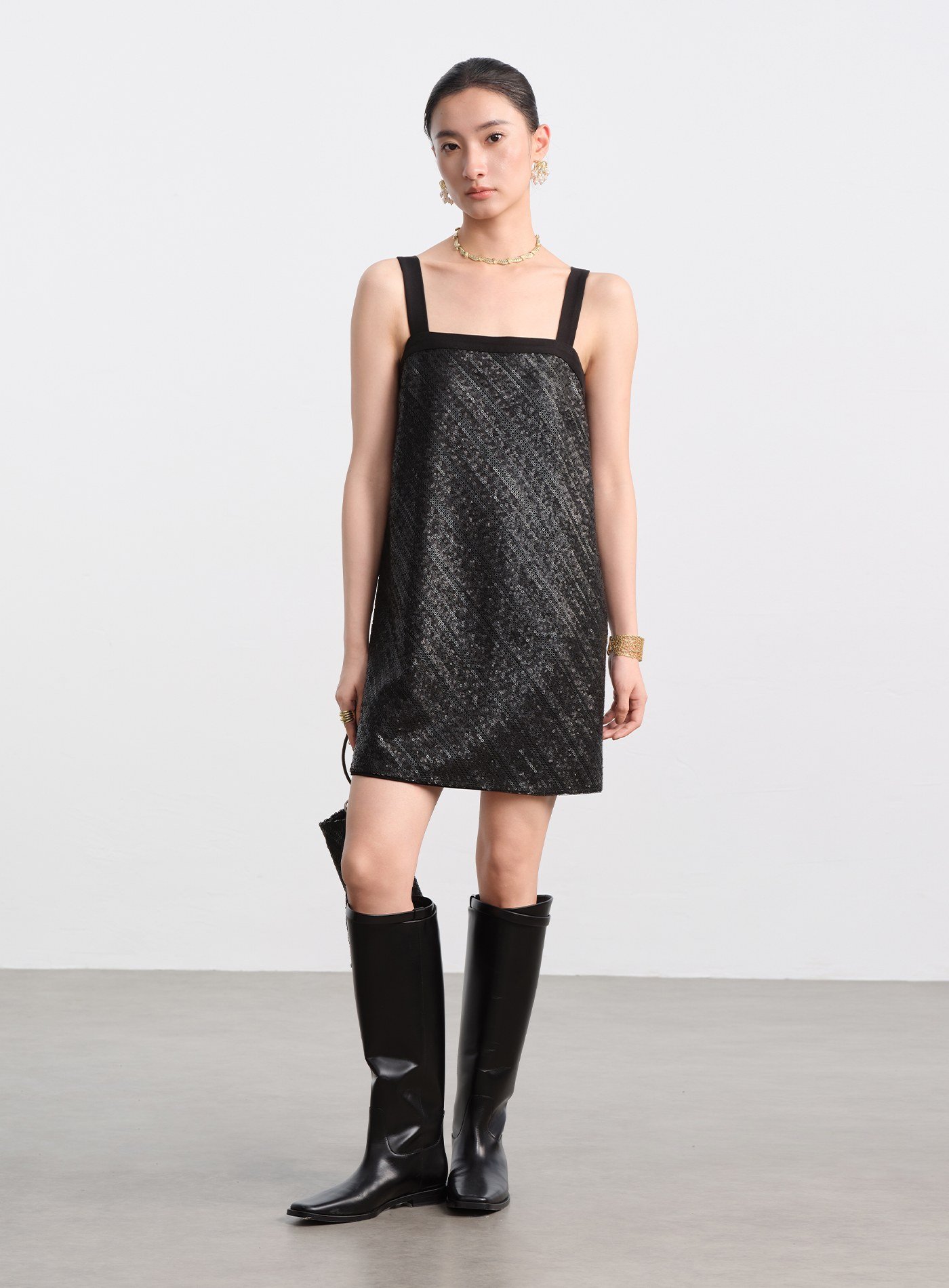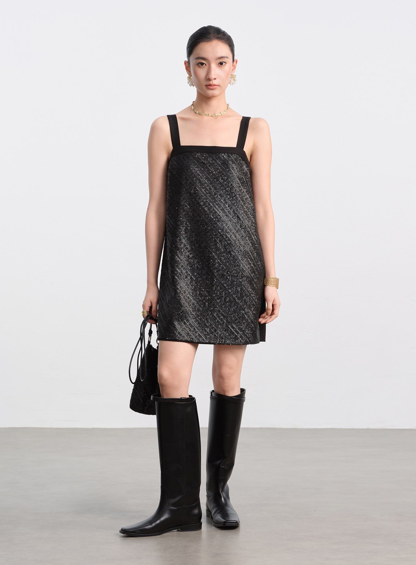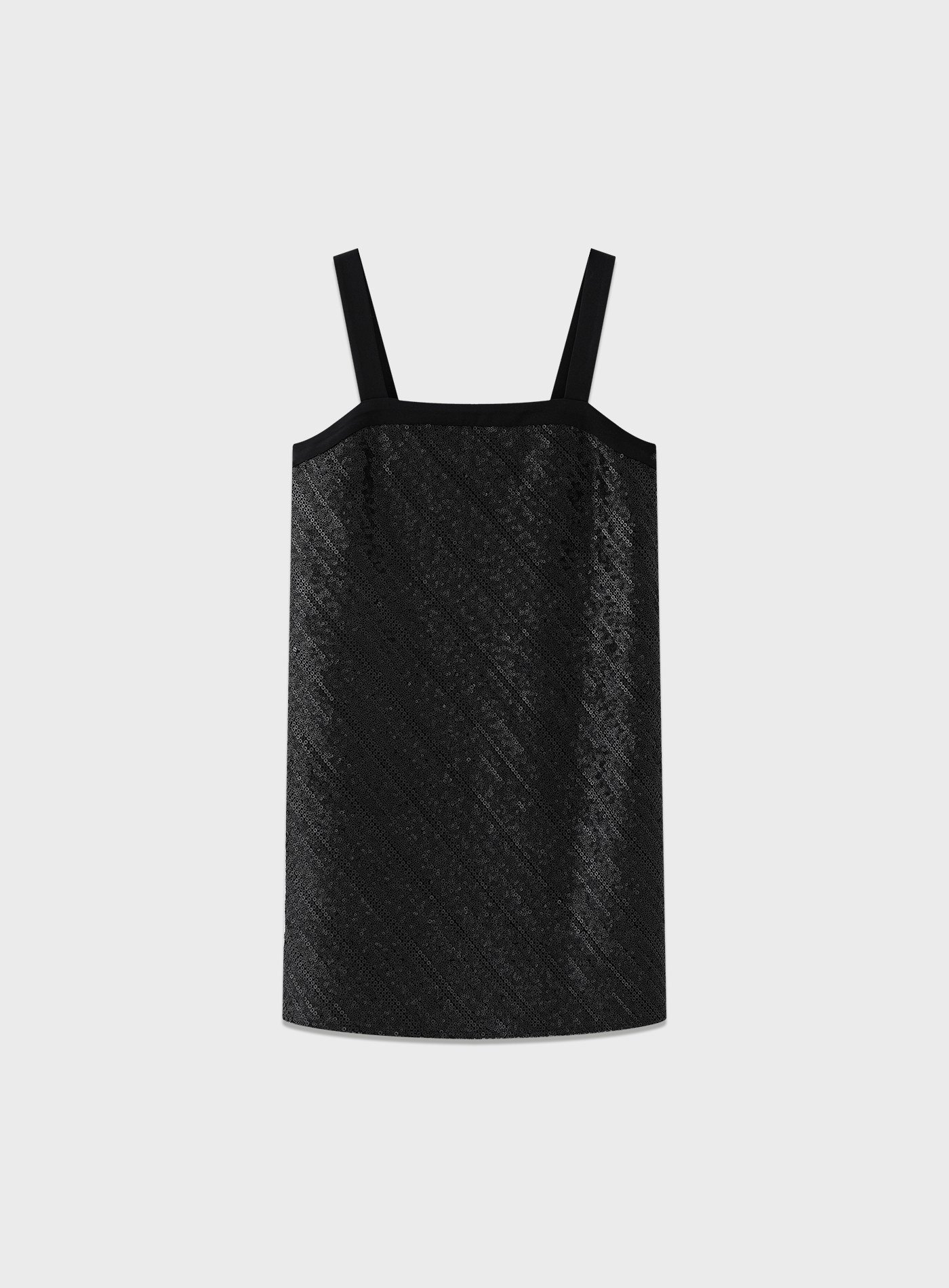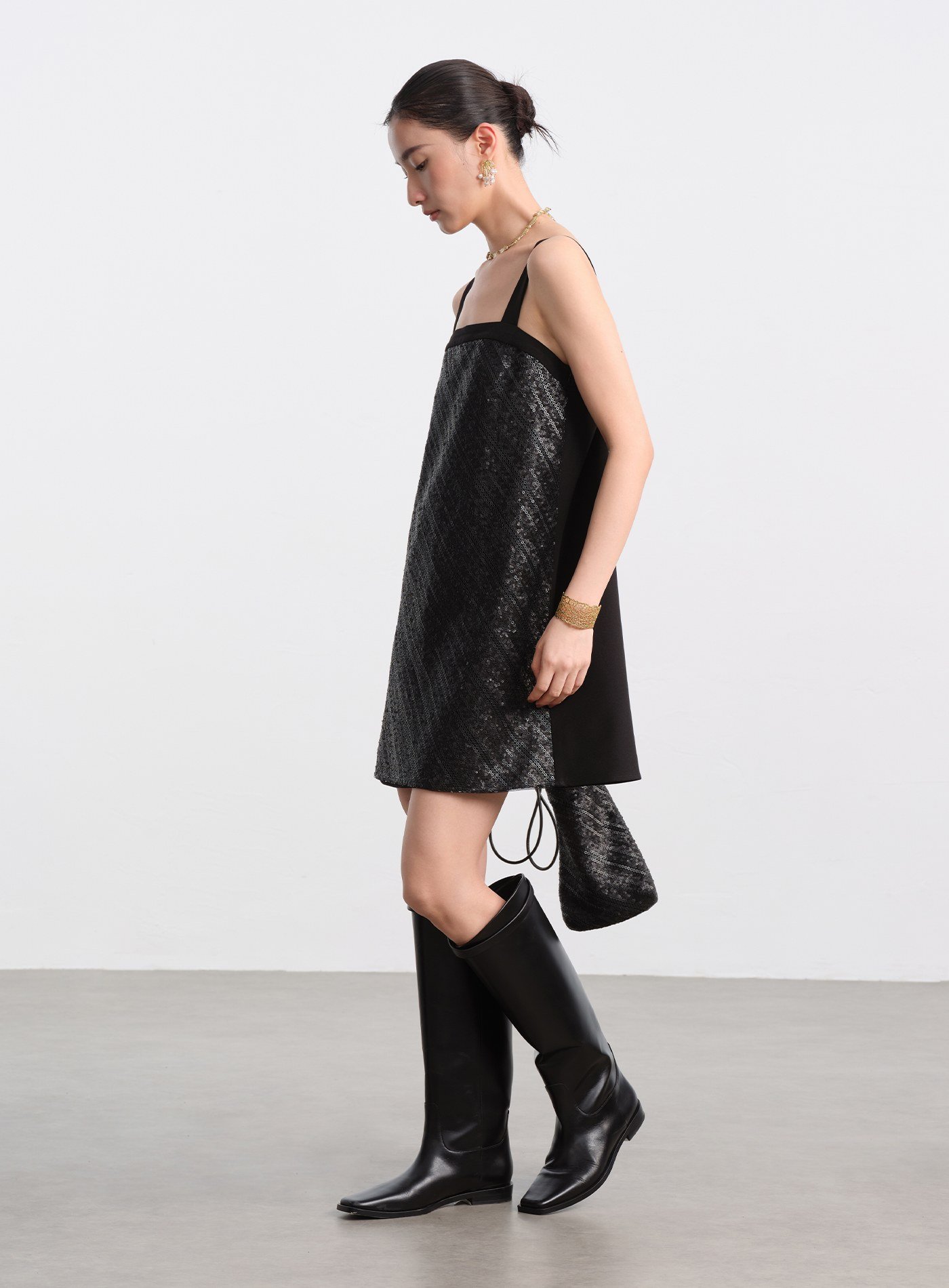 - 前片採用立體亮片刺繡布料,光線下呈現細緻閃爍;後片以素色梭織布料拼接,形成華麗與素雅對比,減輕整體重量,造型更俐落