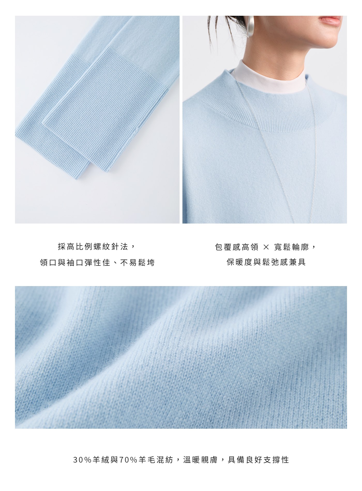 - 30%羊絨與70%羊毛混紡,帶來柔軟貼膚的高級觸感;羊絨的輕盈暖度與羊毛的支撐彈性完美平衡,既保暖又能維持俐落挺度,不易變形