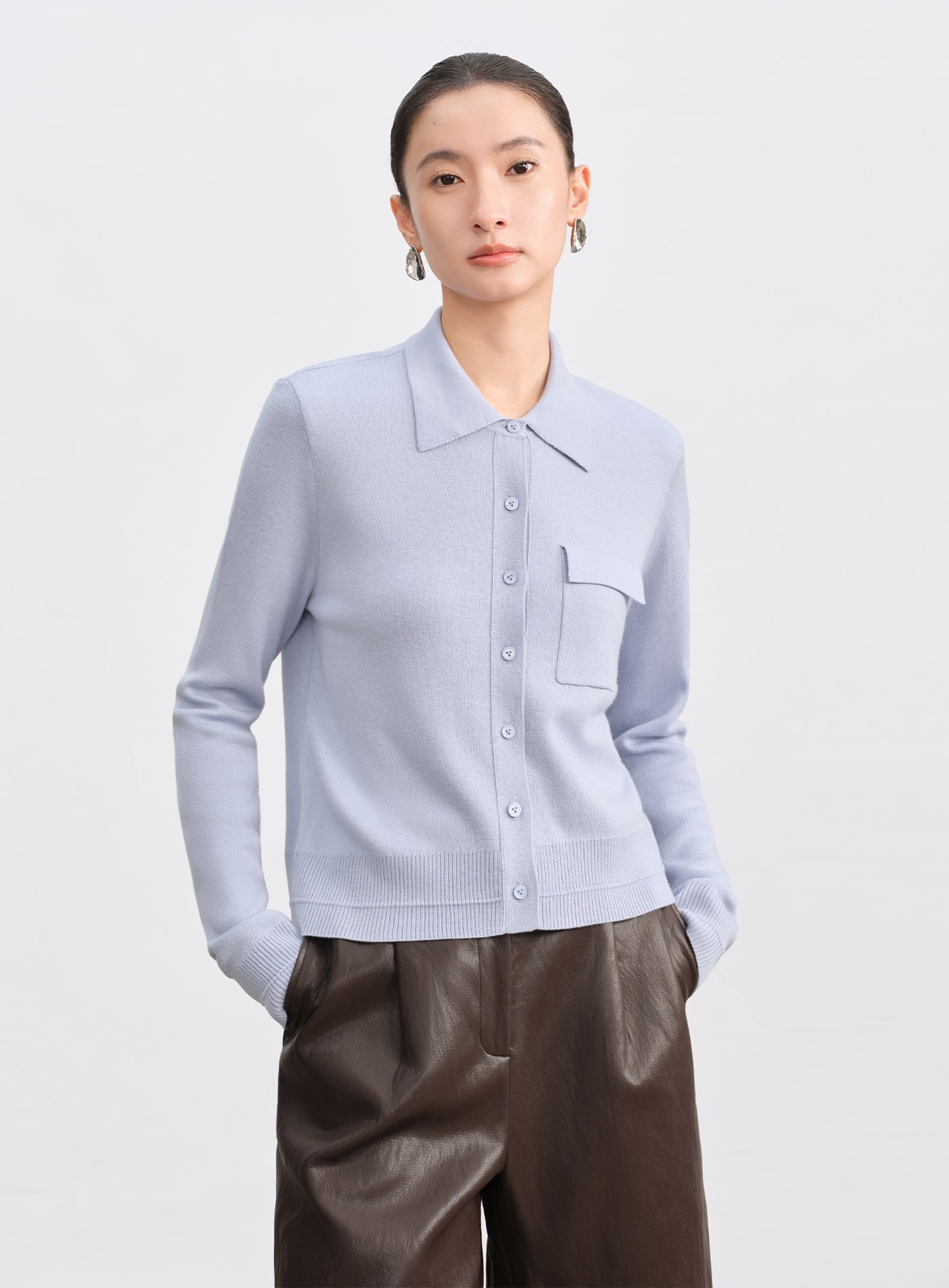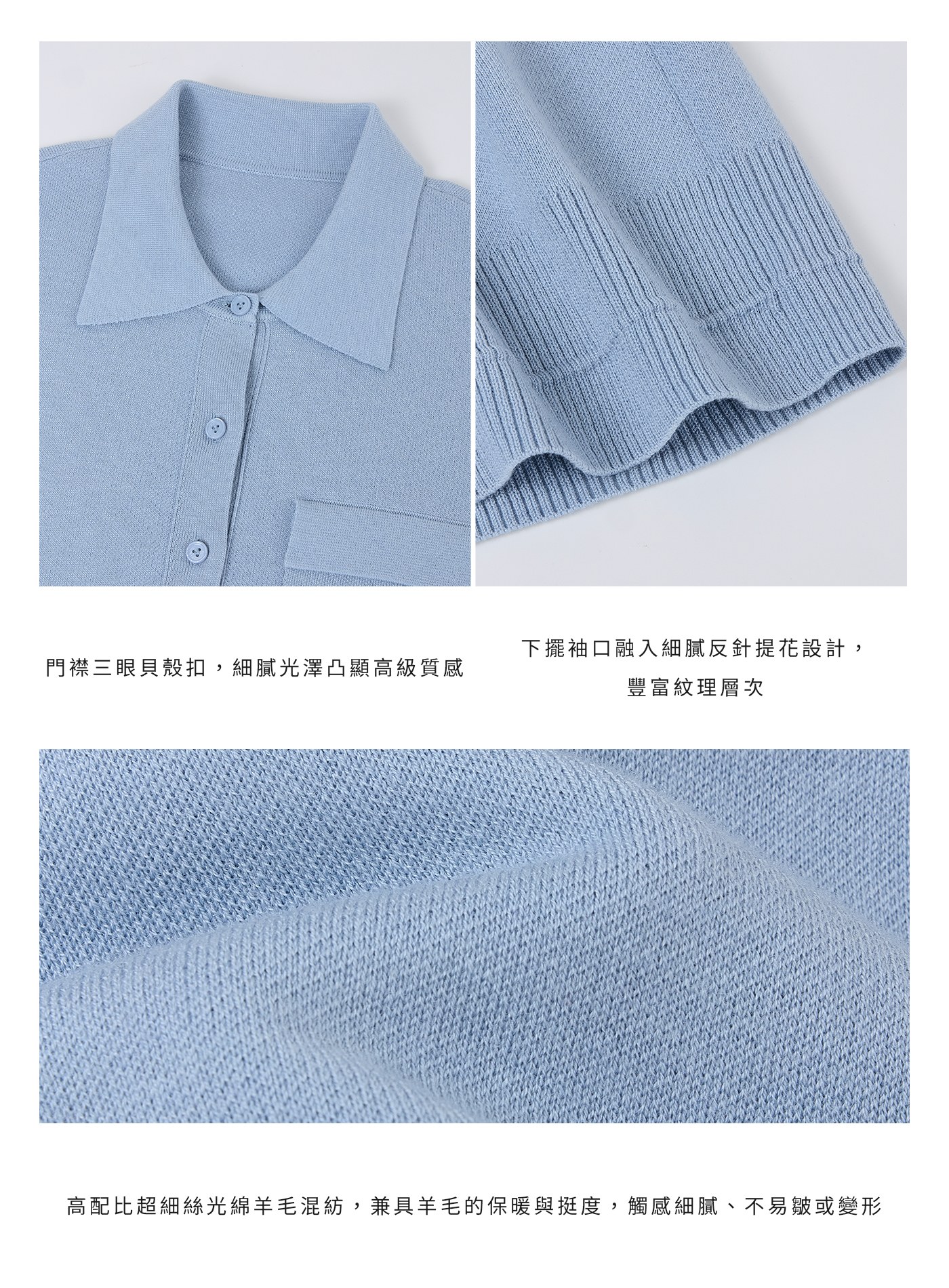 - 嚴選高密絲光綿羊毛混紡,觸感柔滑親膚,保暖輕盈,具優異抗皺與回彈力,歷經多次洗滌依舊挺廓如新