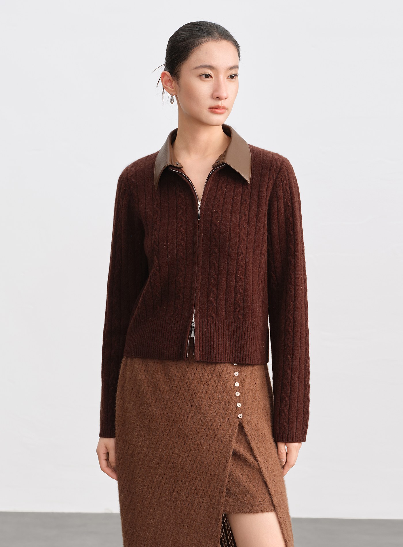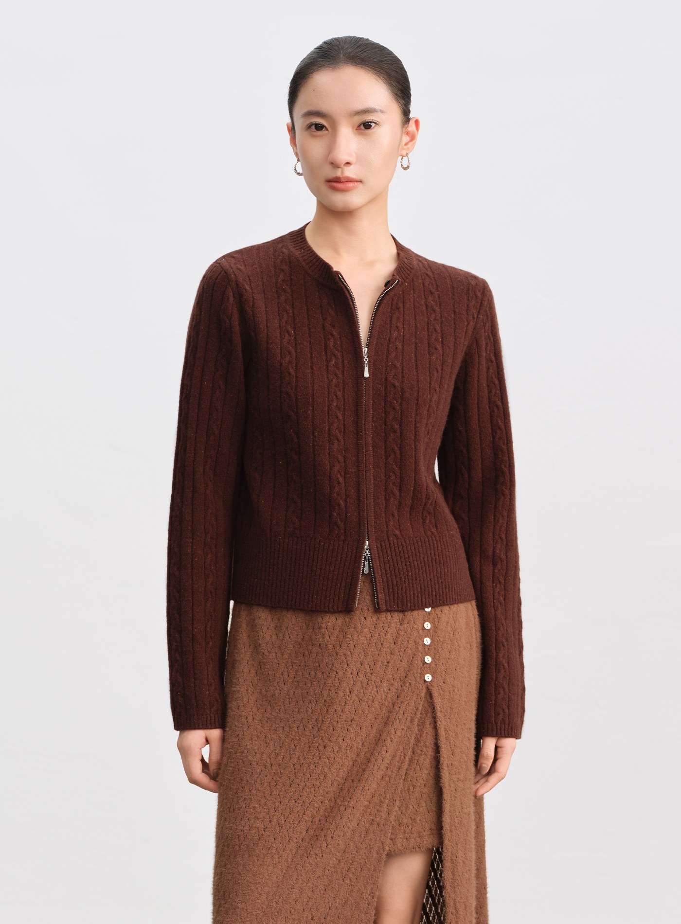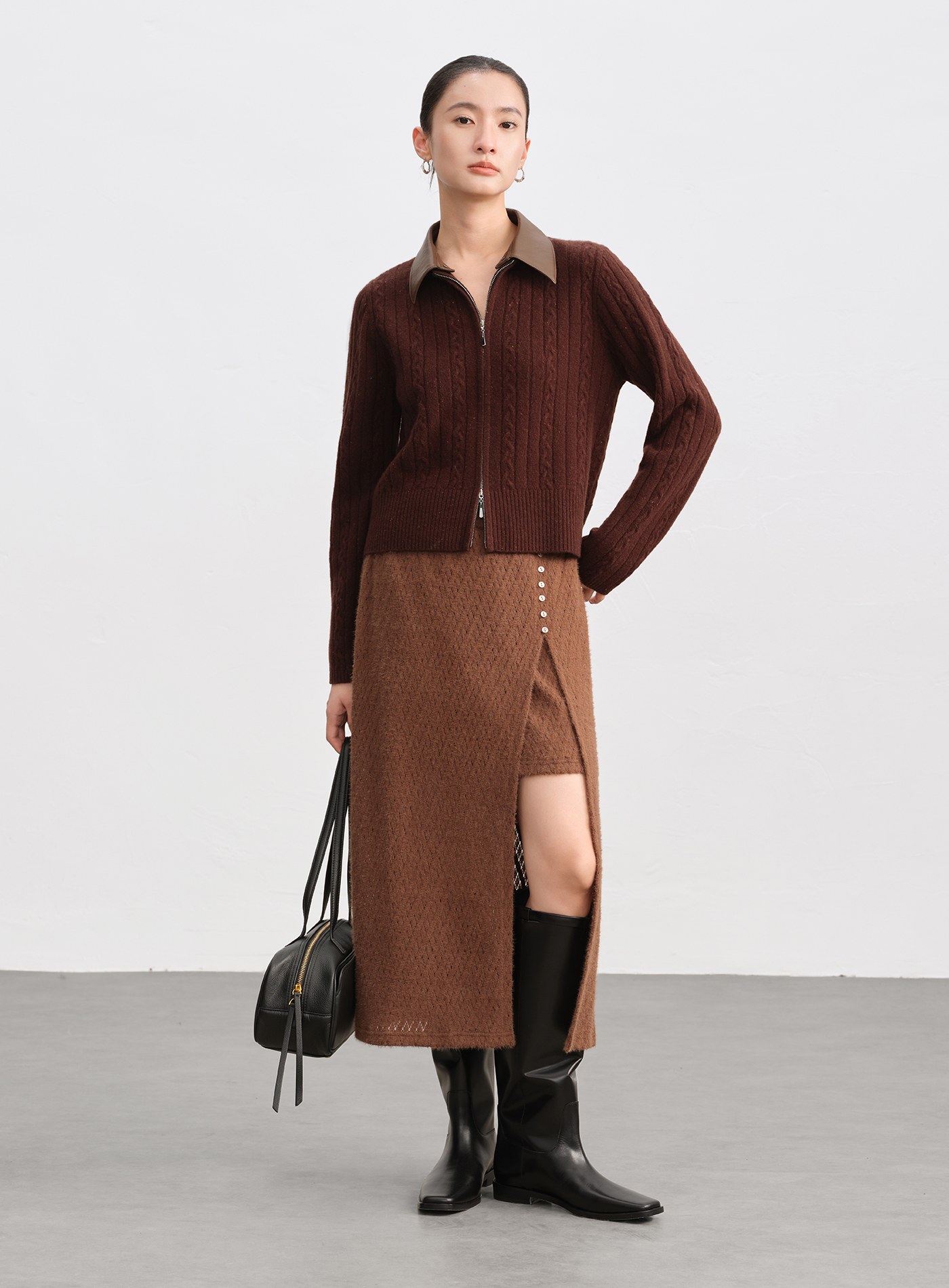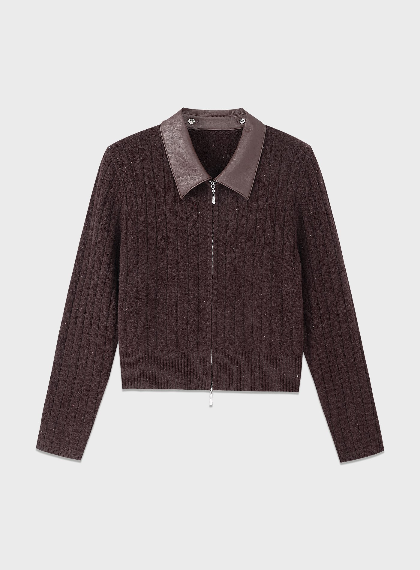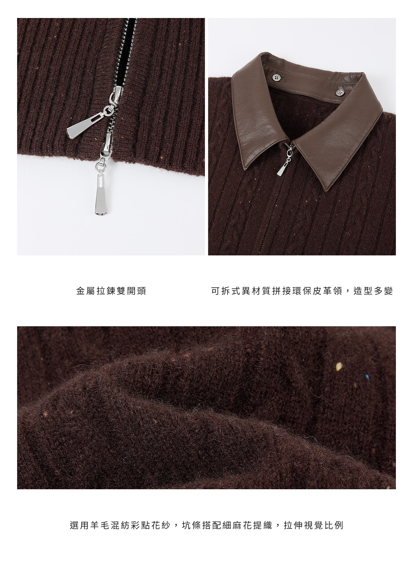 - 選用羊毛混紡彩點花紗,坑條搭配細麻花提織,拉伸視覺比例