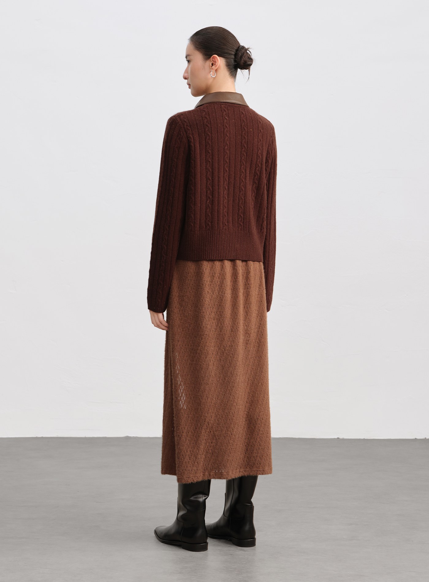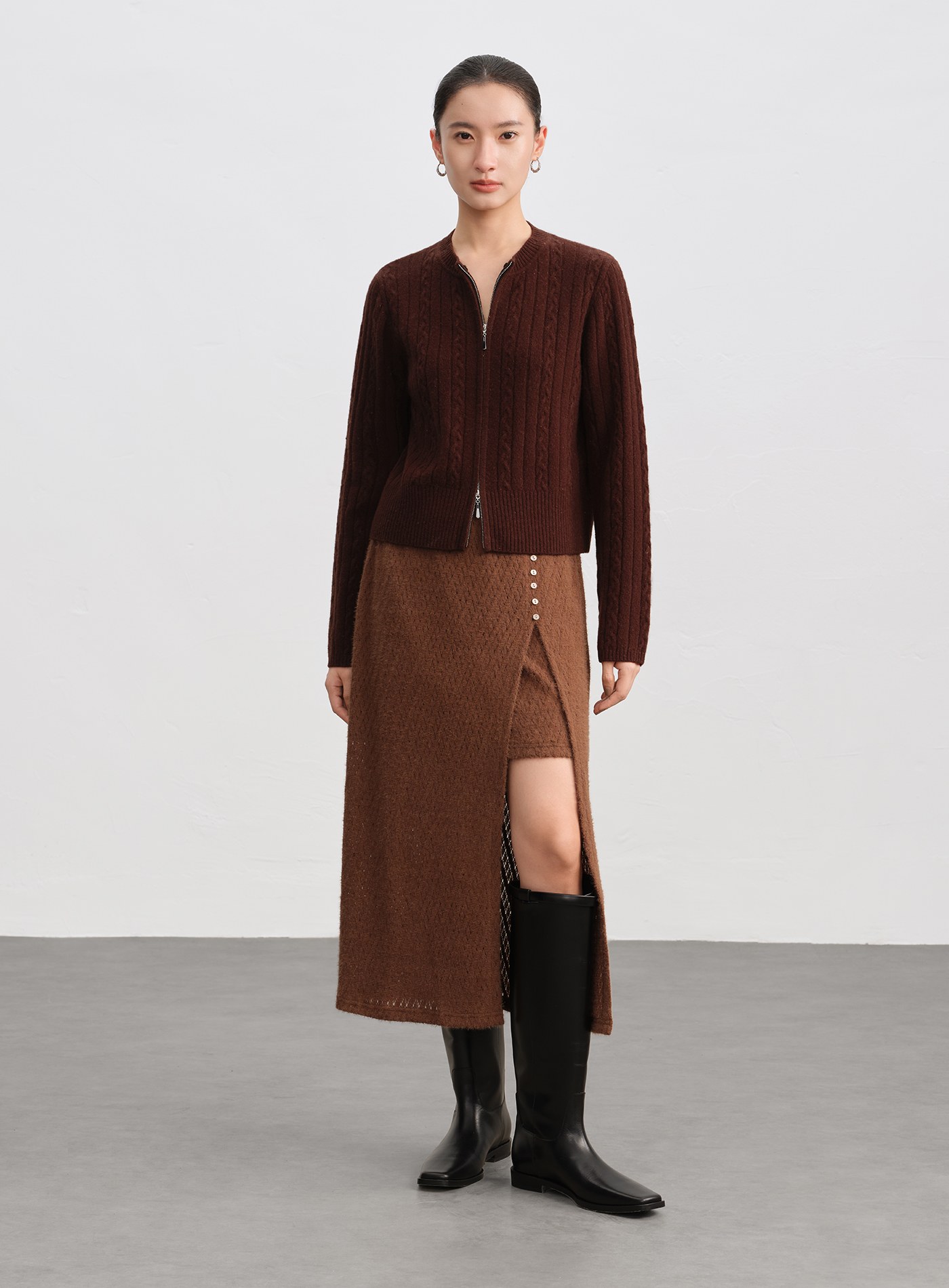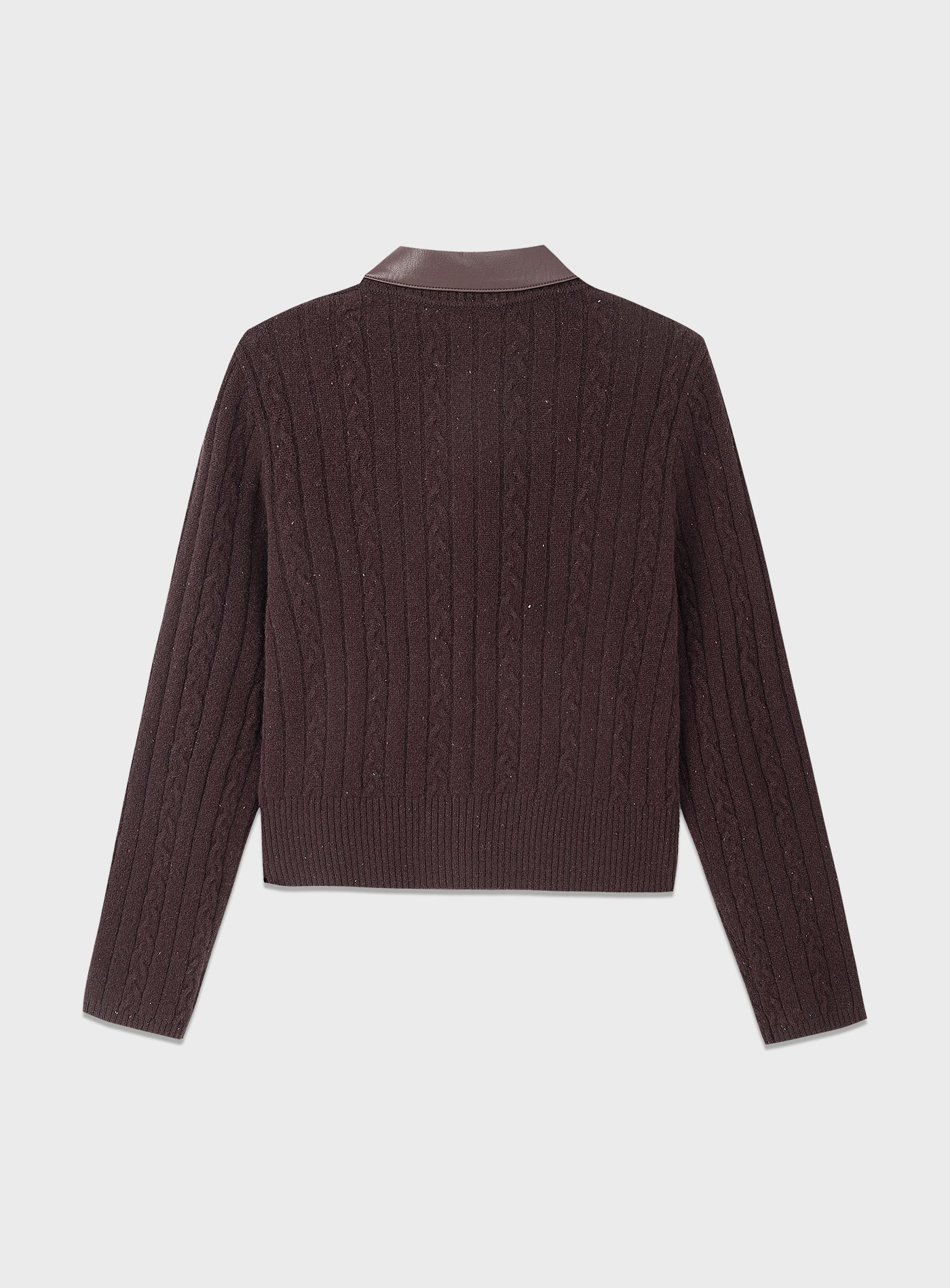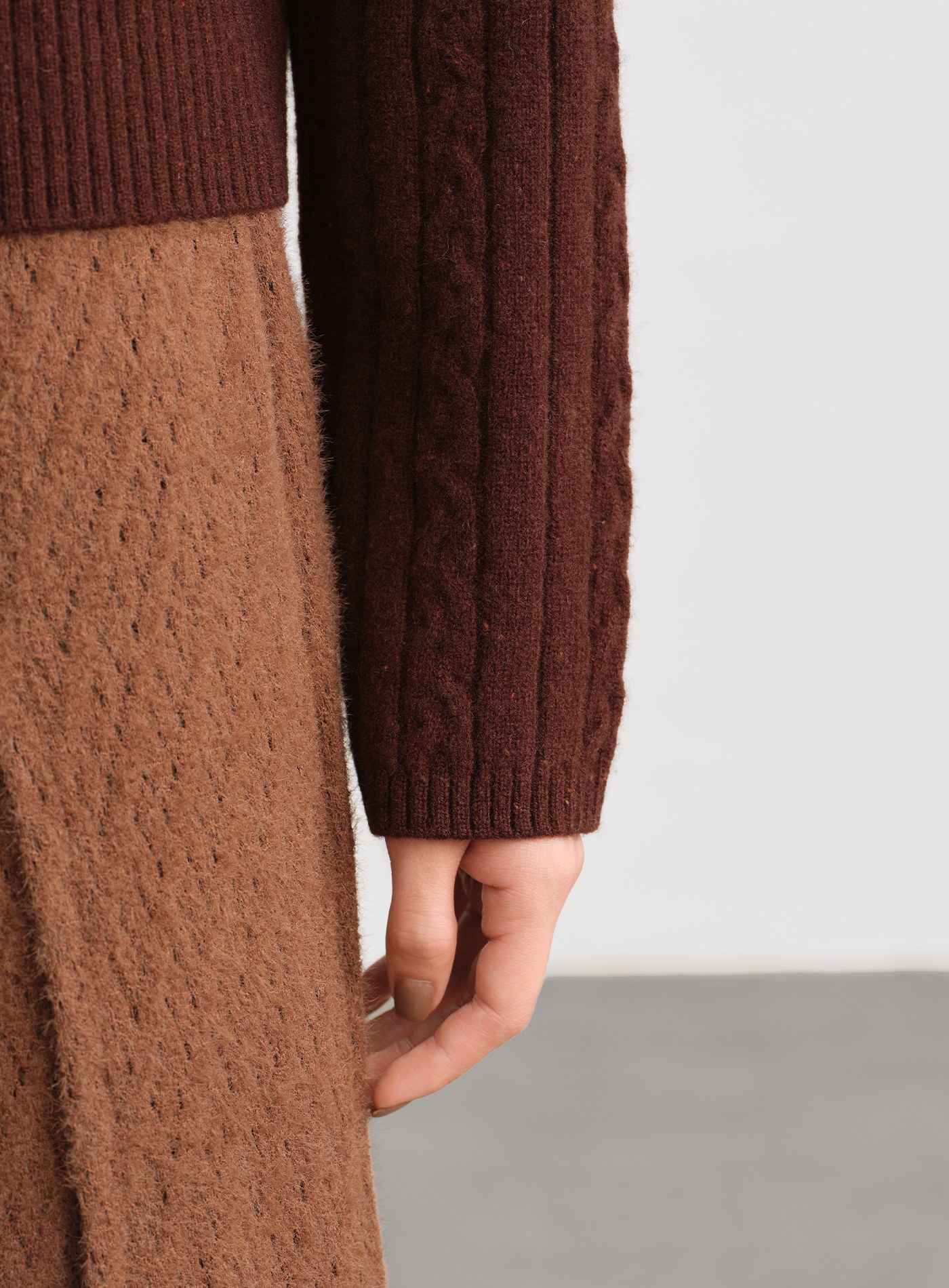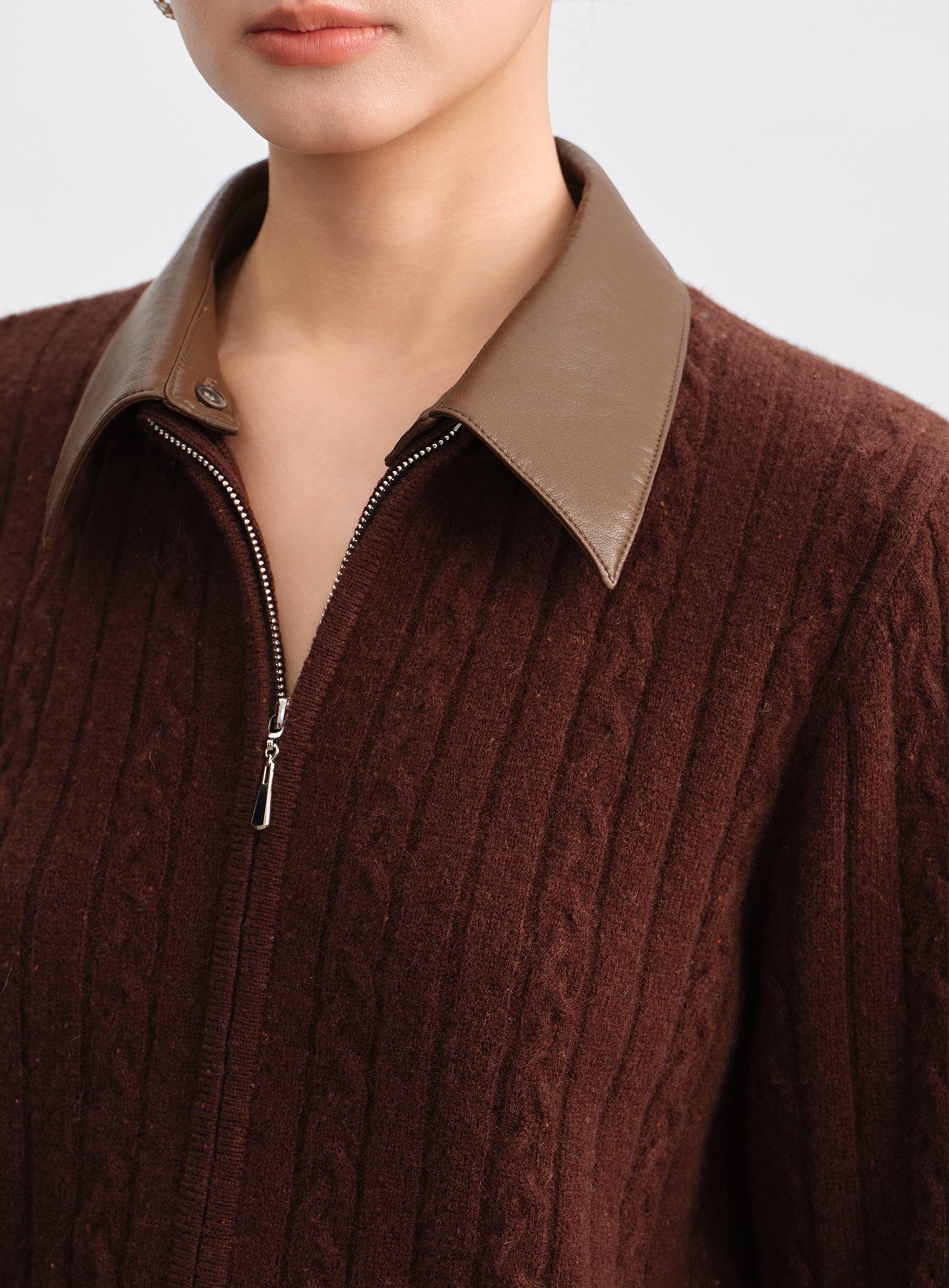 - 選用羊毛混紡彩點花紗,坑條搭配細麻花提織,拉伸視覺比例