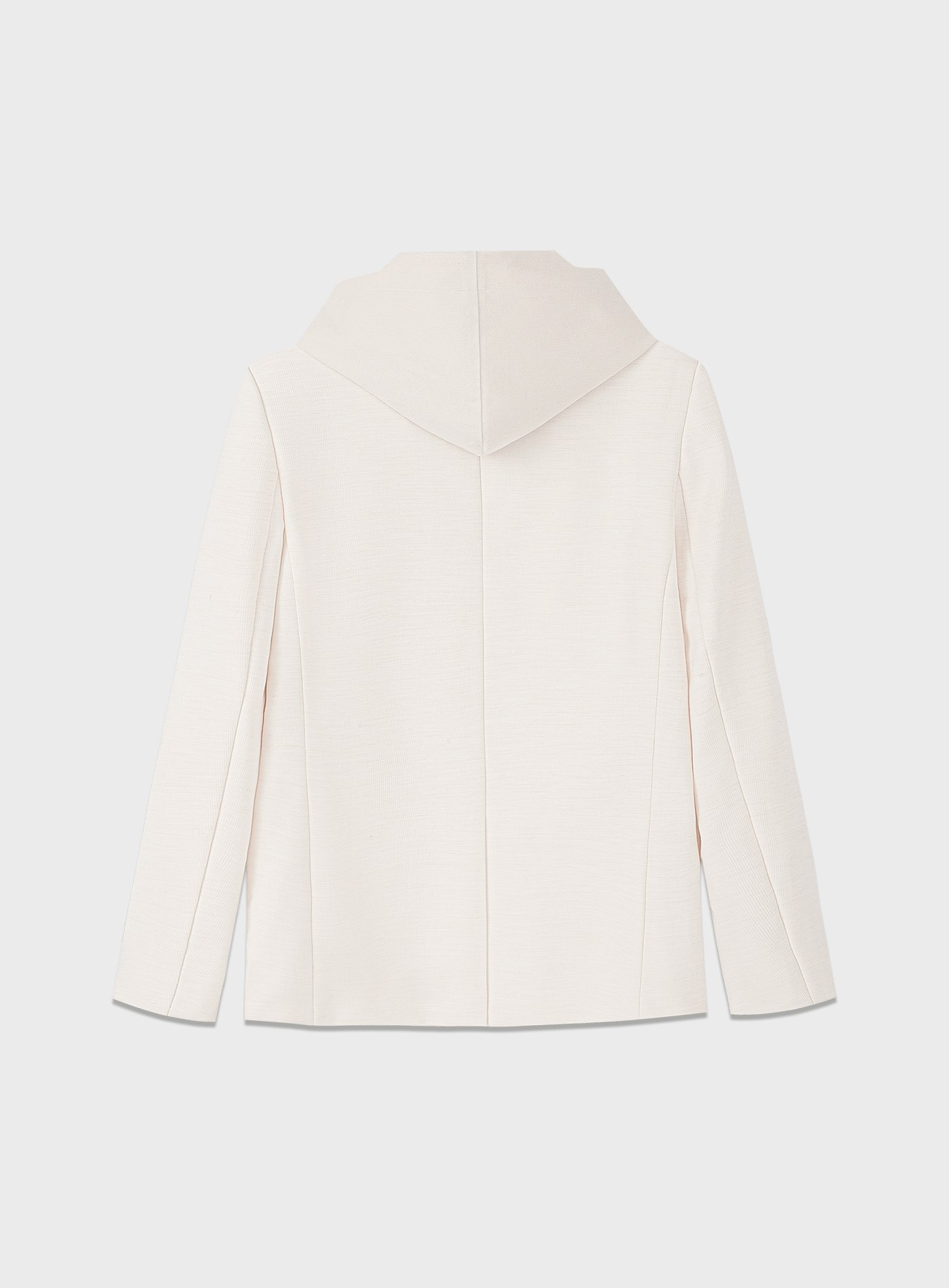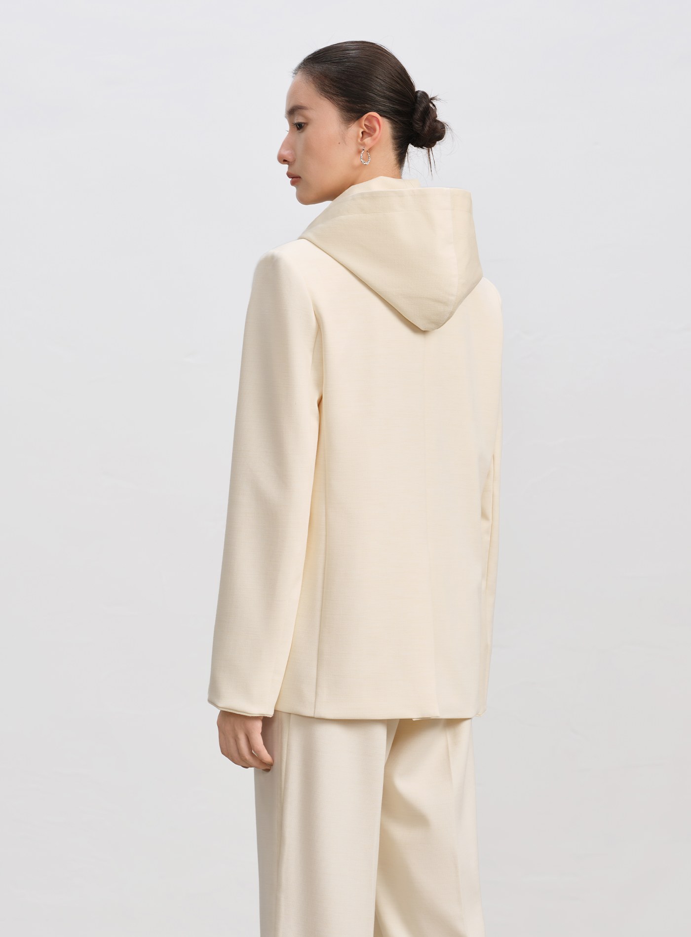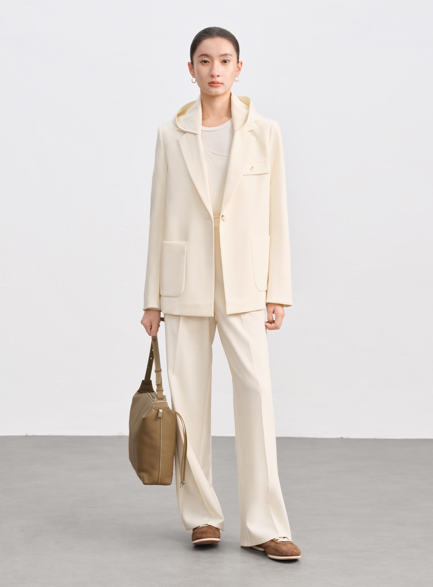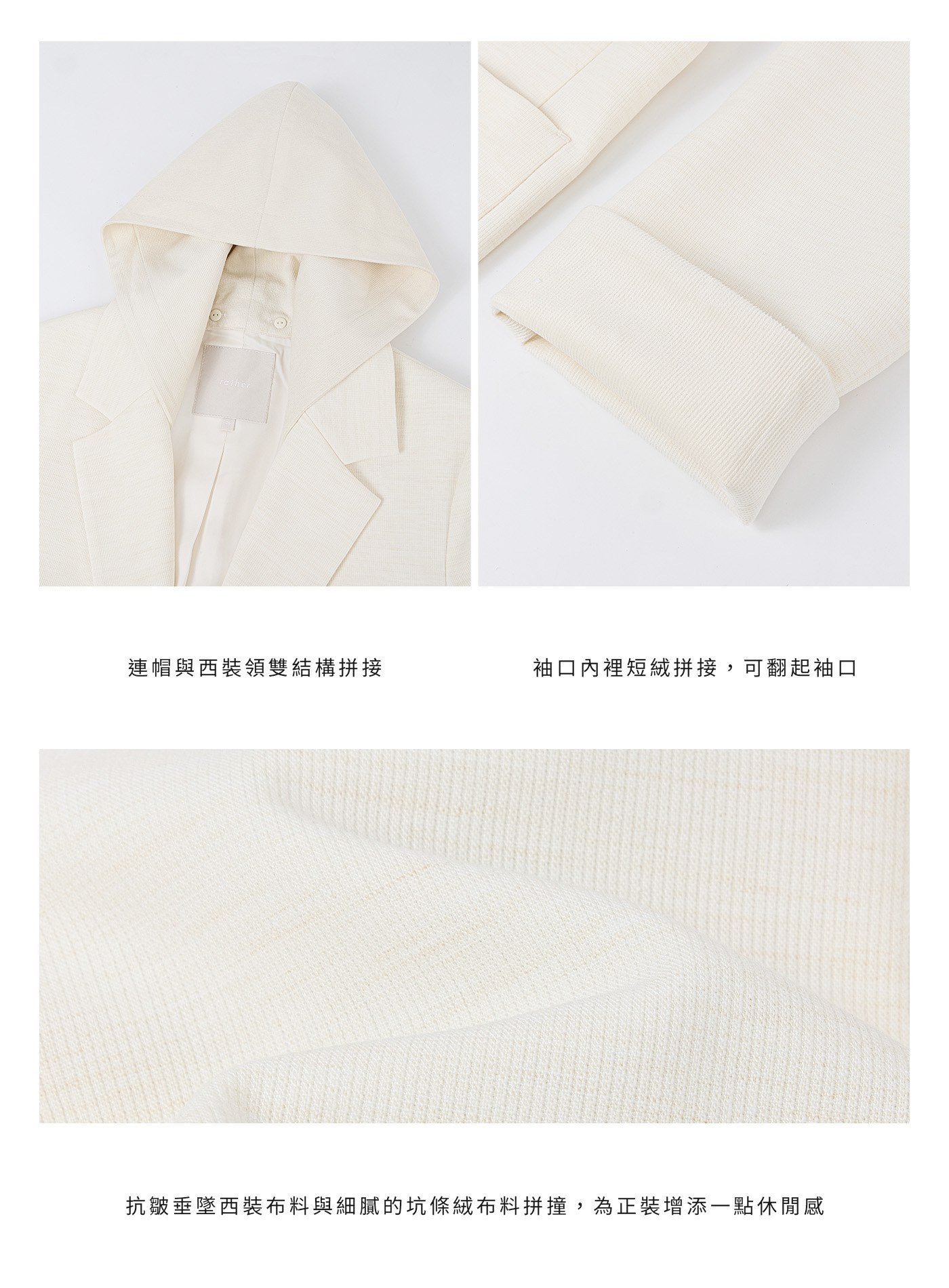 - 連帽與西裝領雙結構拼接,帽身弧度經過反覆調試,折疊收納後領型不變形