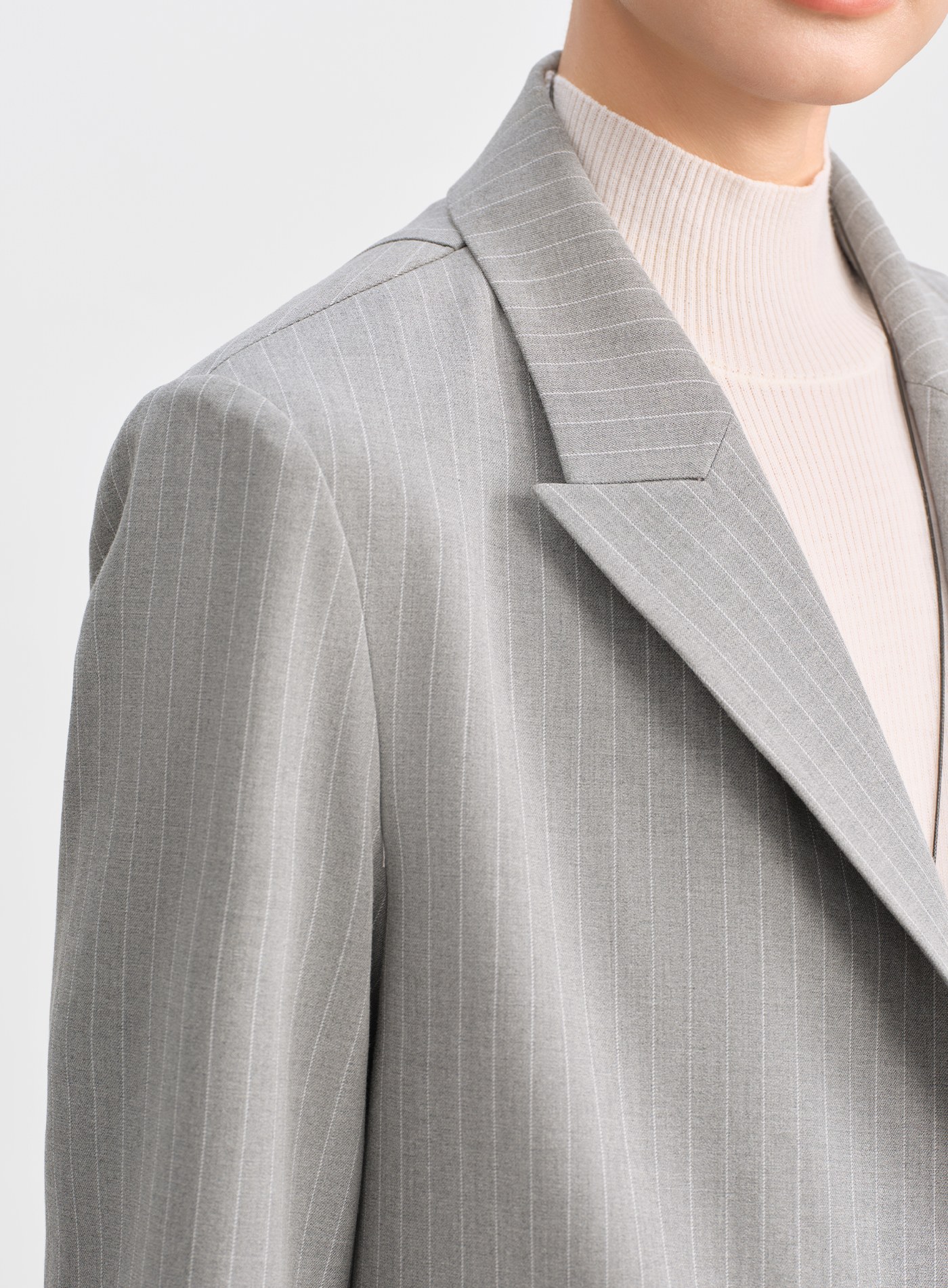 - 經典西裝領打造俐落框架,輔以訂製薄墊肩,提升挺度卻不厚重,讓肩背線條帶有微微的弧度