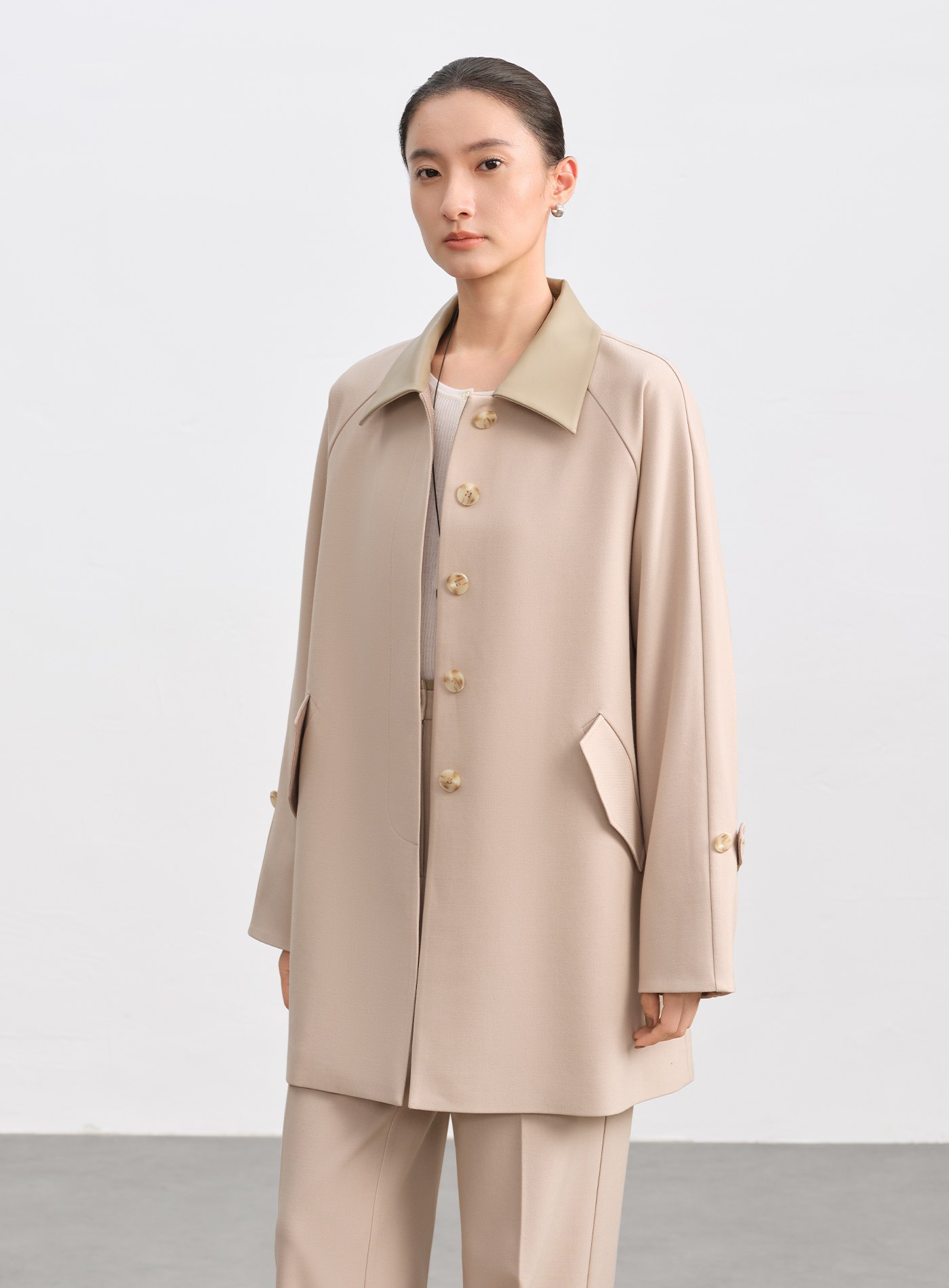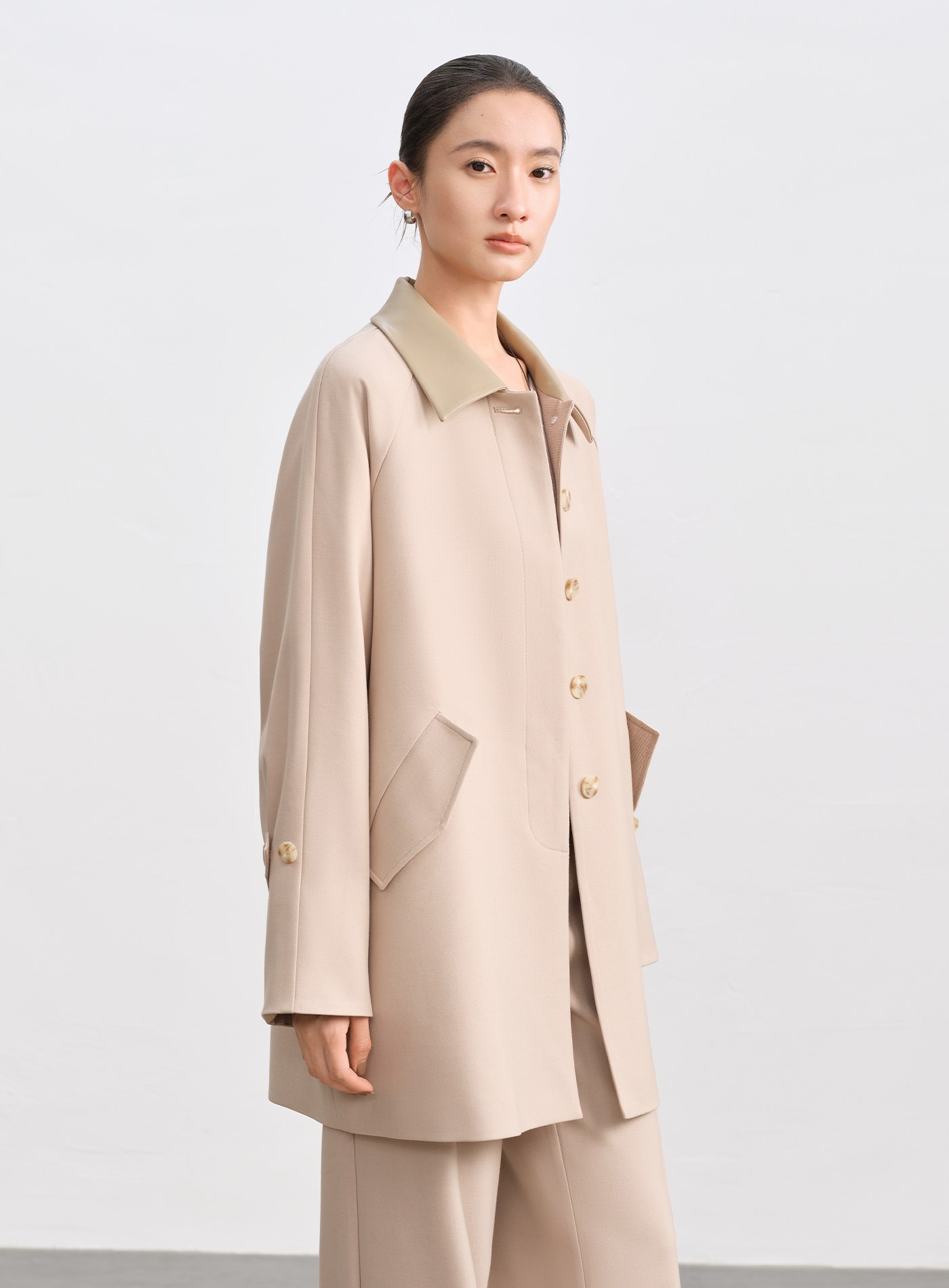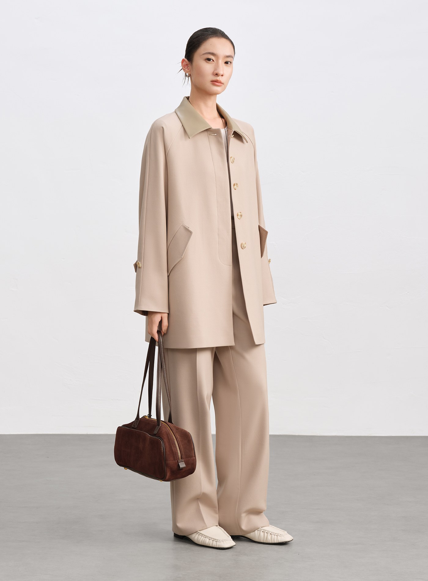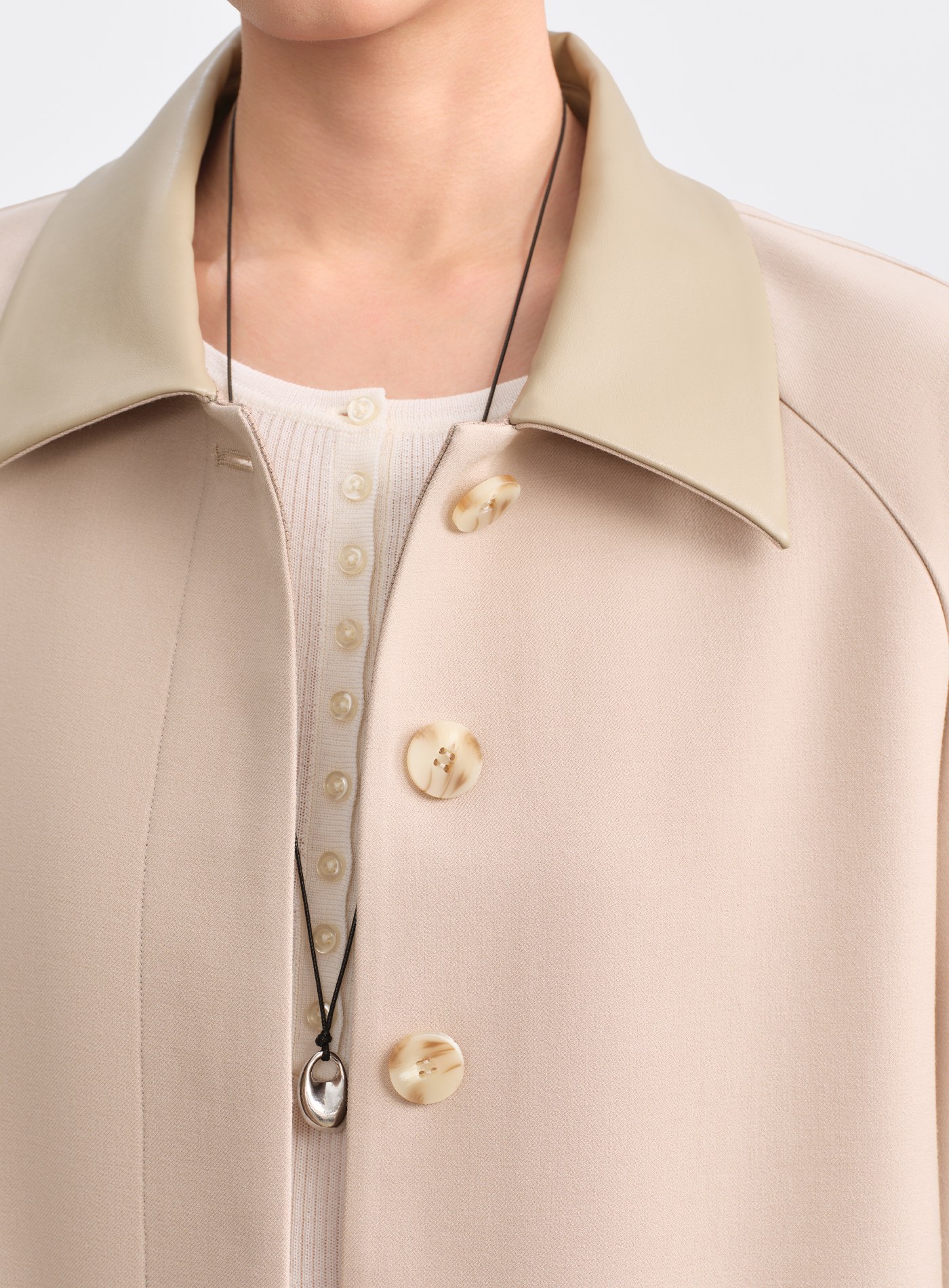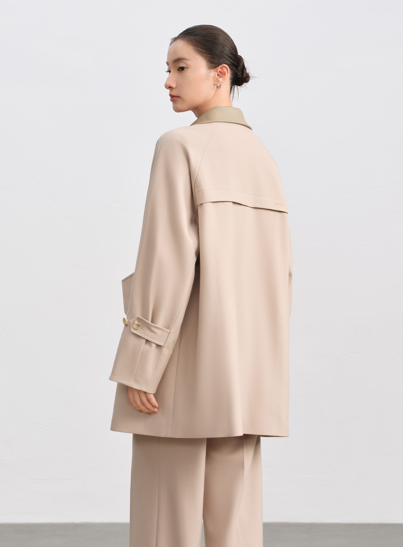 - 領片採用PU拼接,呈現微亮質感;袖部再加入 格紋元素,讓經典格調與俐落版型交織,復古卻不老氣,耐看又有辨識度