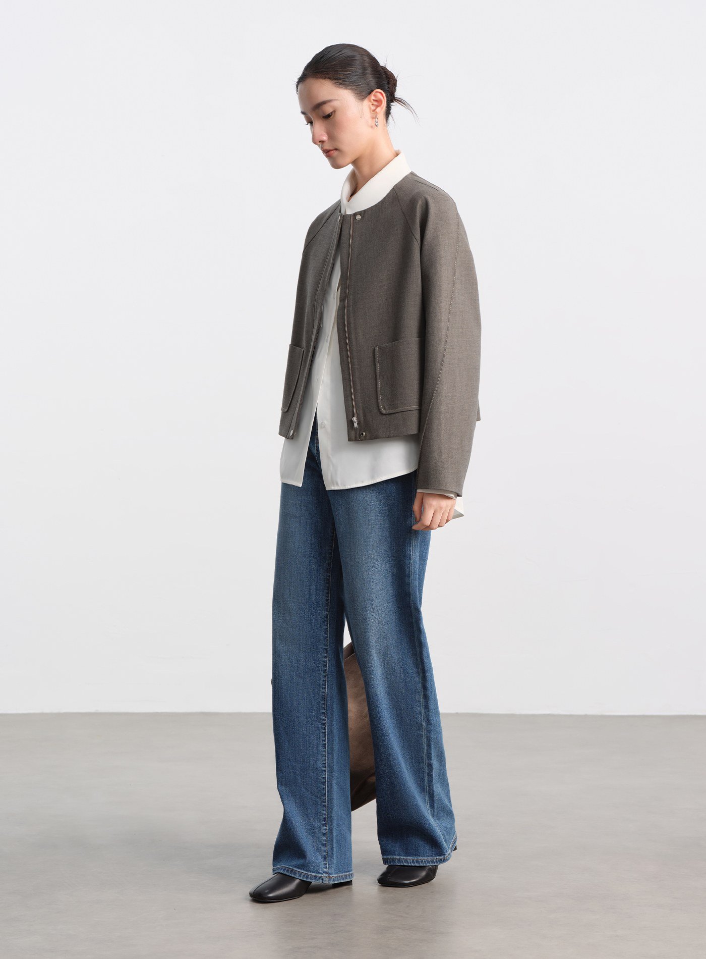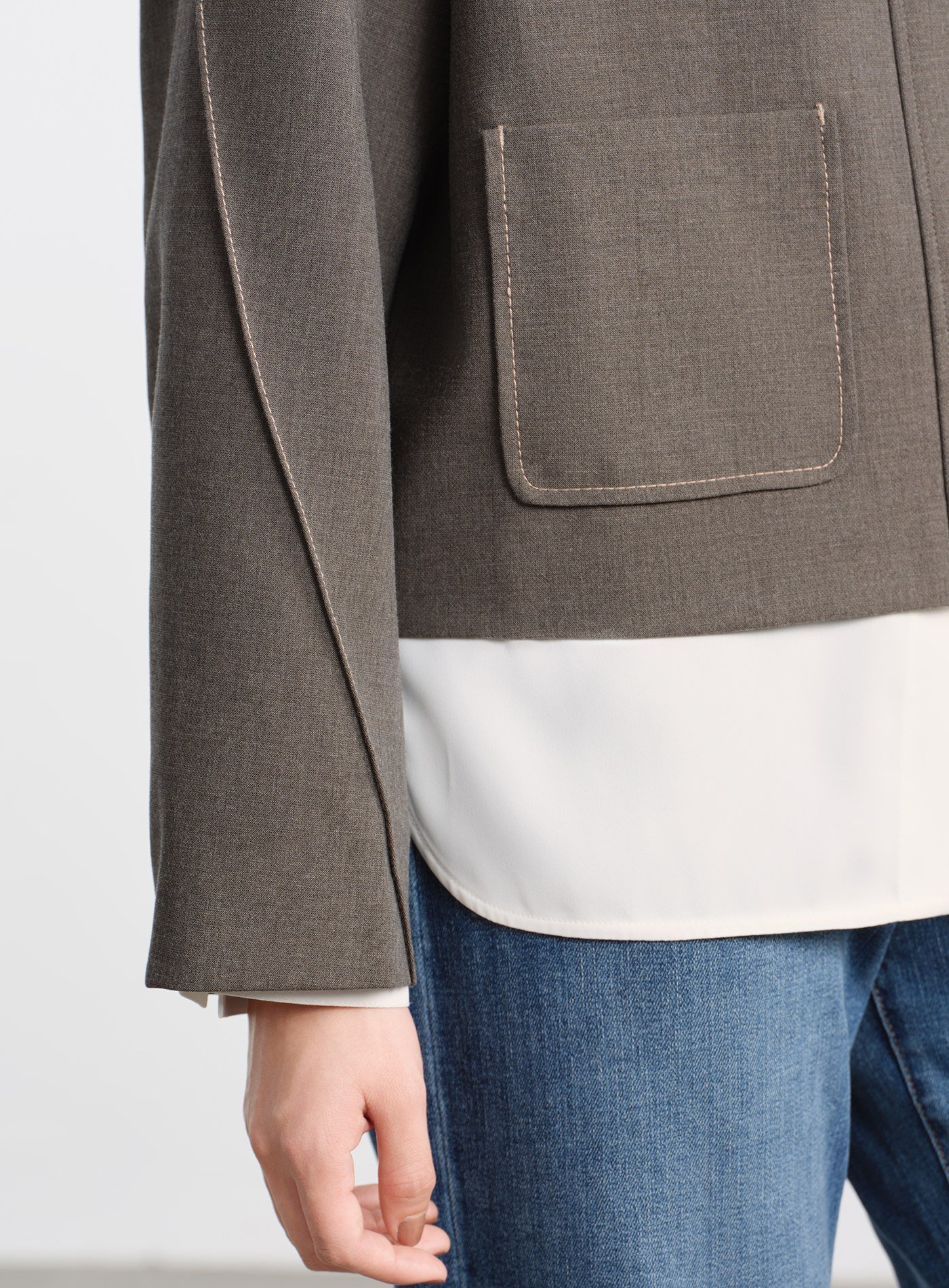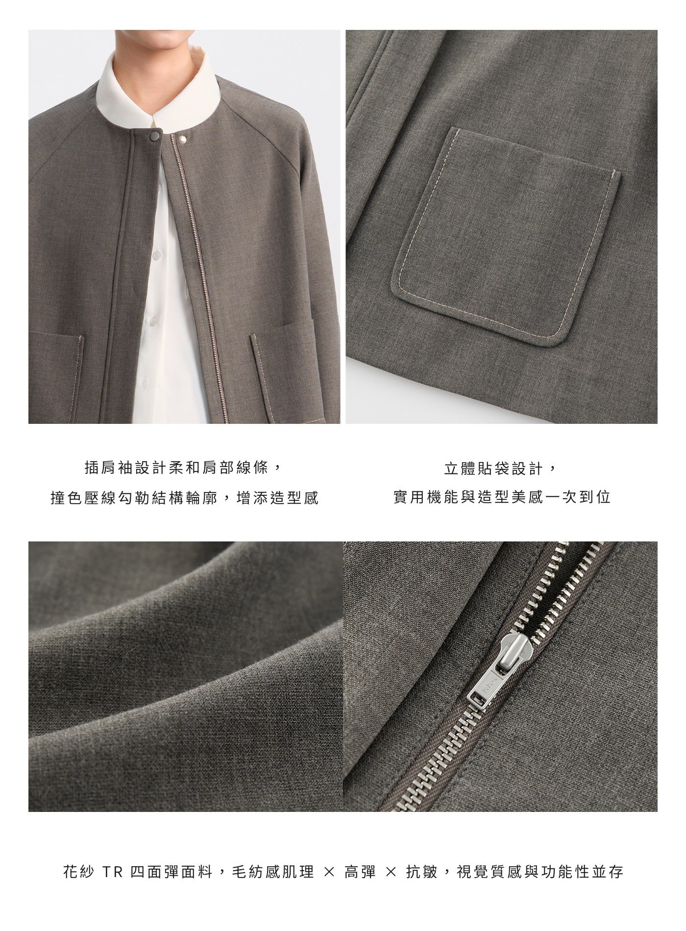 - 布料採用花紗毛紡質感的 TR 四面彈混紡,擁有溫暖細緻的肌理,觸感與視覺皆帶有毛紡調性,兼具優異的抗皺性能,隨時保持挺廓有型