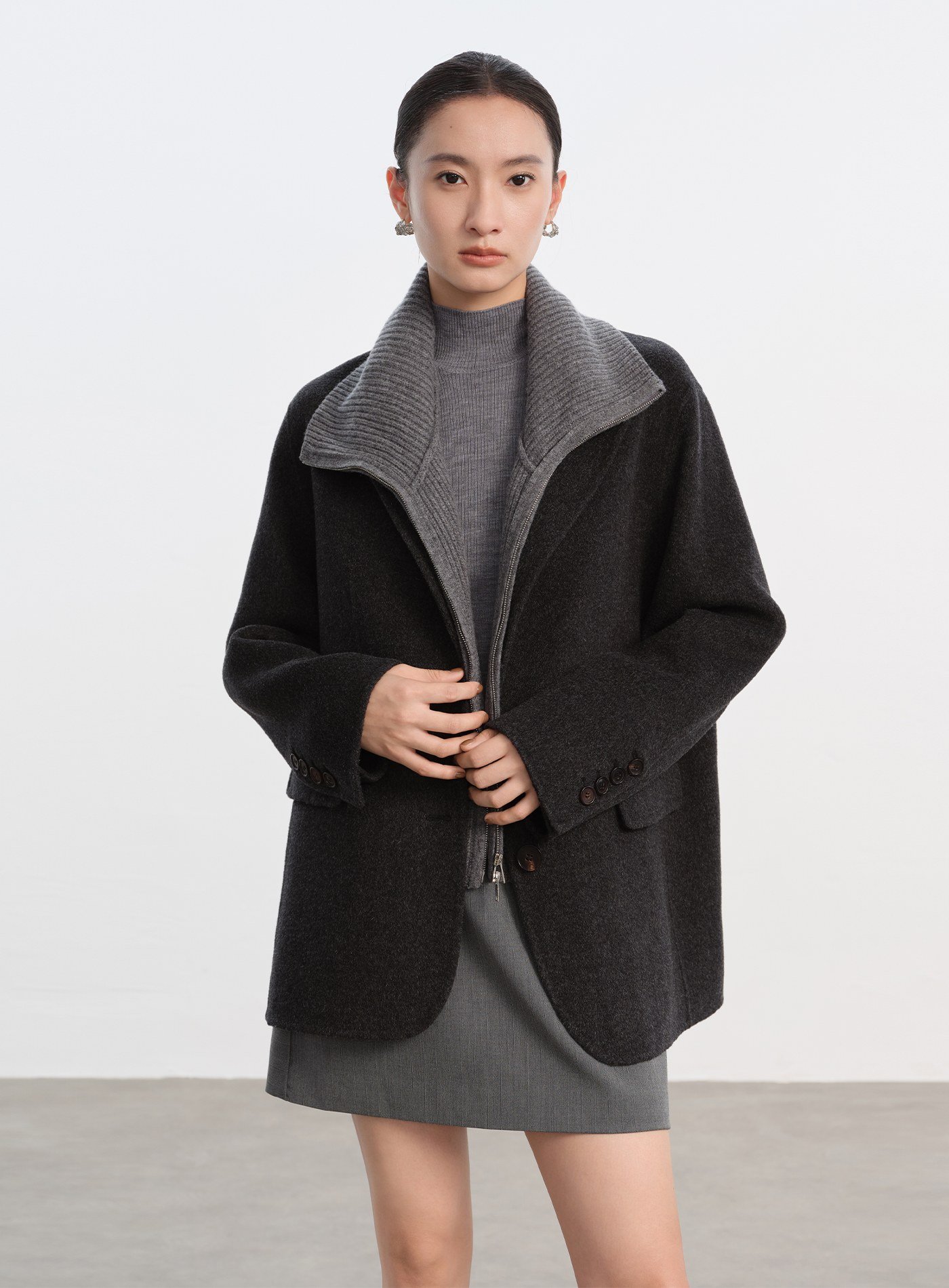 - 結合西裝翻領的俐落線條與針織披肩的柔軟弧度,打造出介於力量與慵懶之間的獨特輪廓