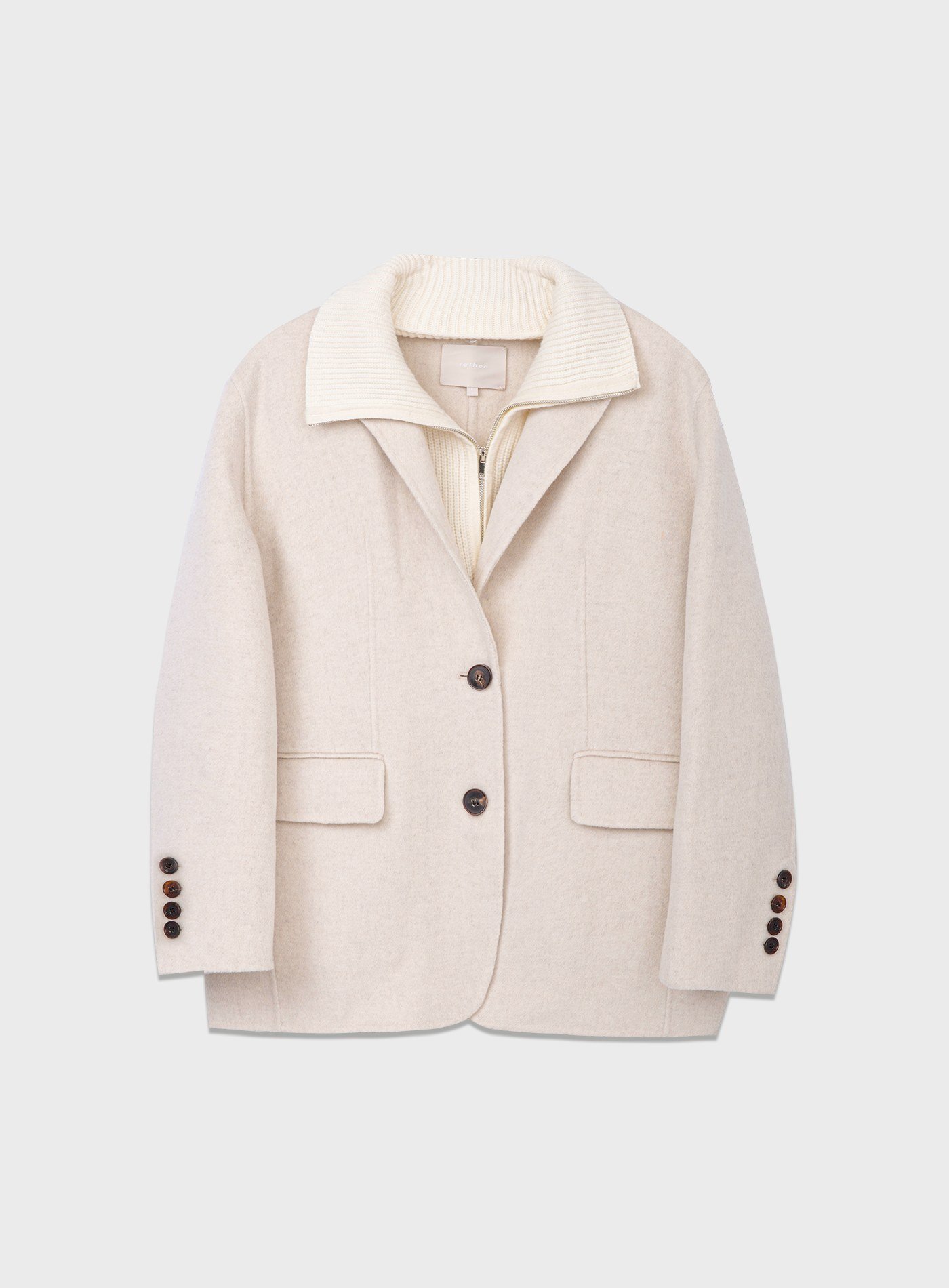 - 結合西裝翻領的俐落線條與針織披肩的柔軟弧度,打造出介於力量與慵懶之間的獨特輪廓